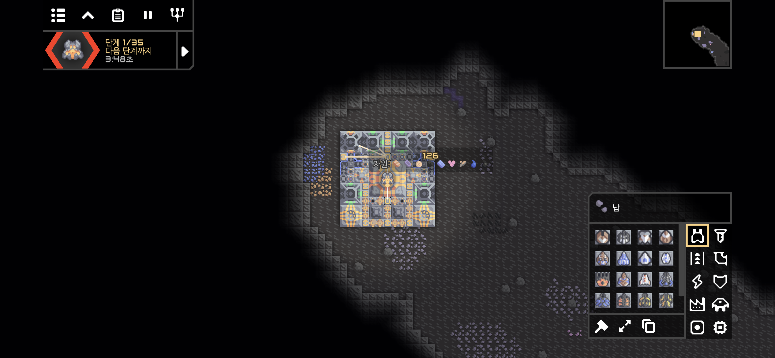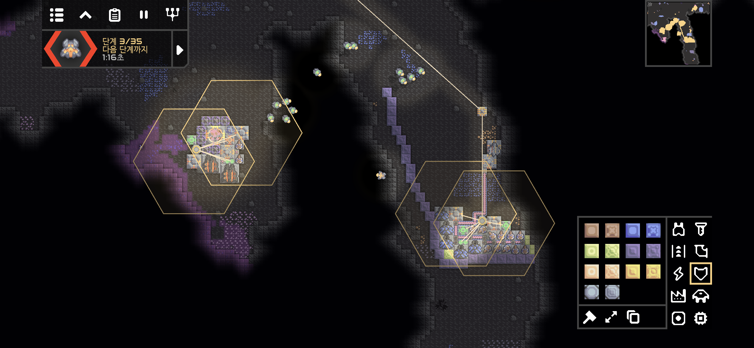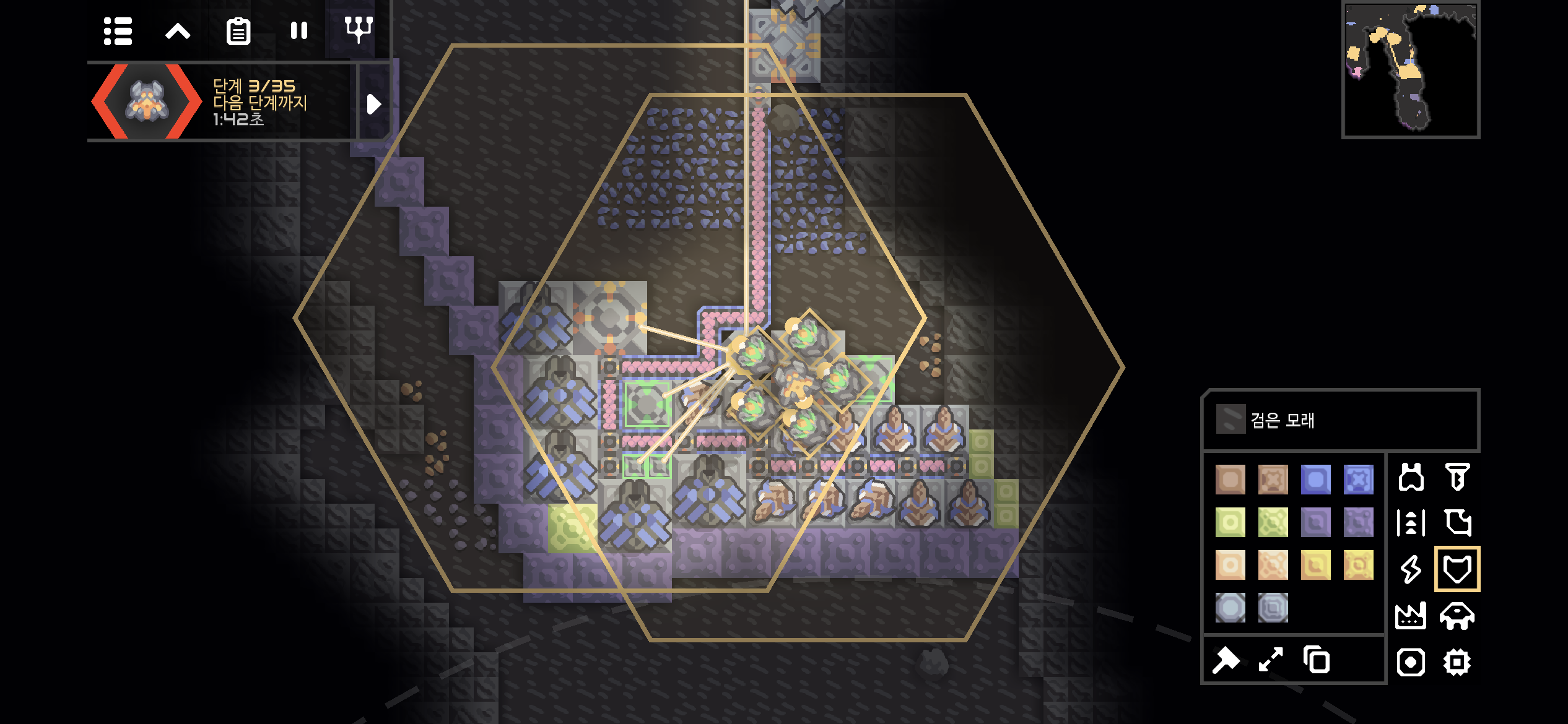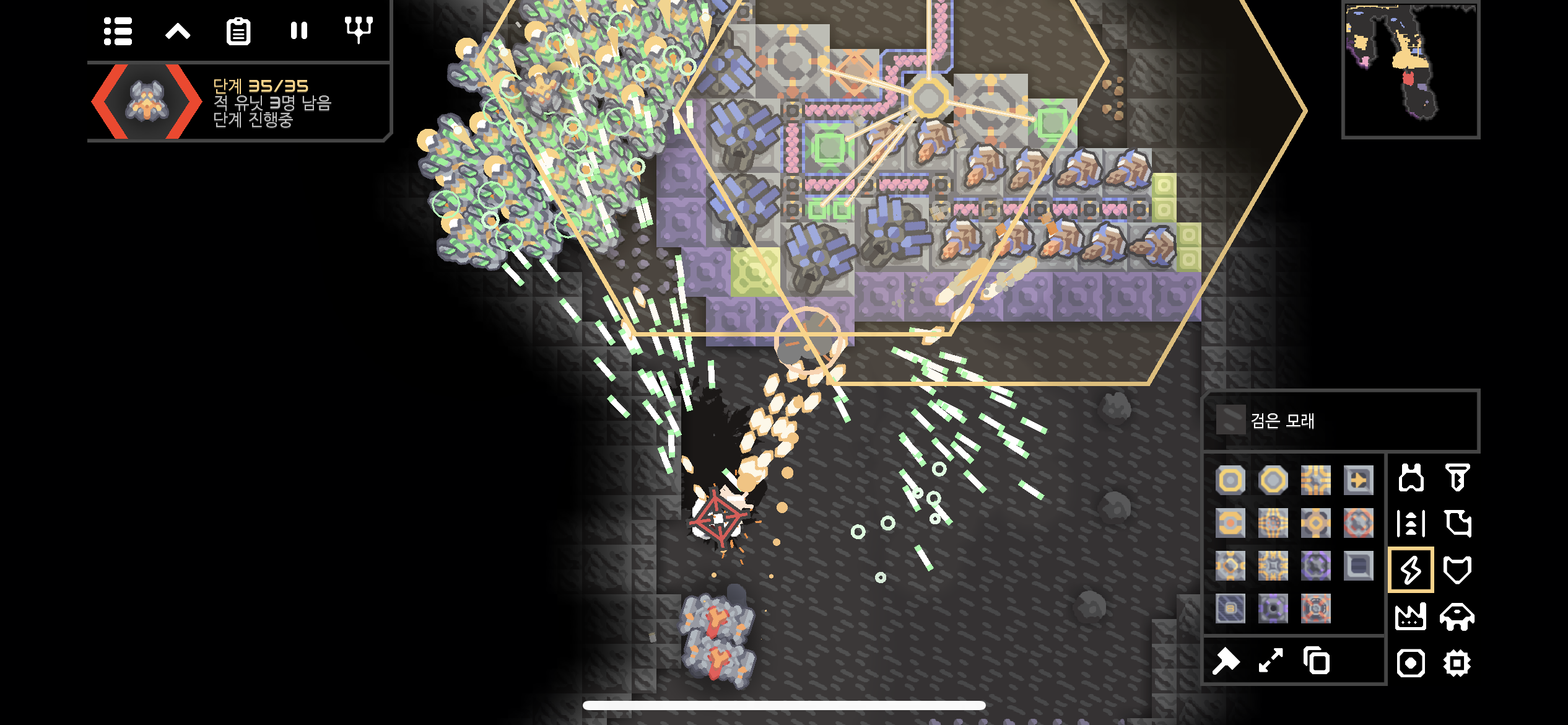 35단계까지 적을 막아내는 동안 무료함을 달래기위해 다양한 공장을 건설했습니다. 실리콘 공장과 폭발물 공장의 일부가 보이네요.