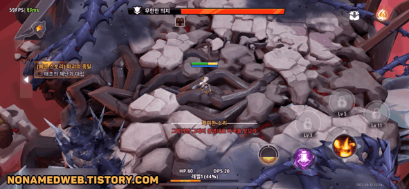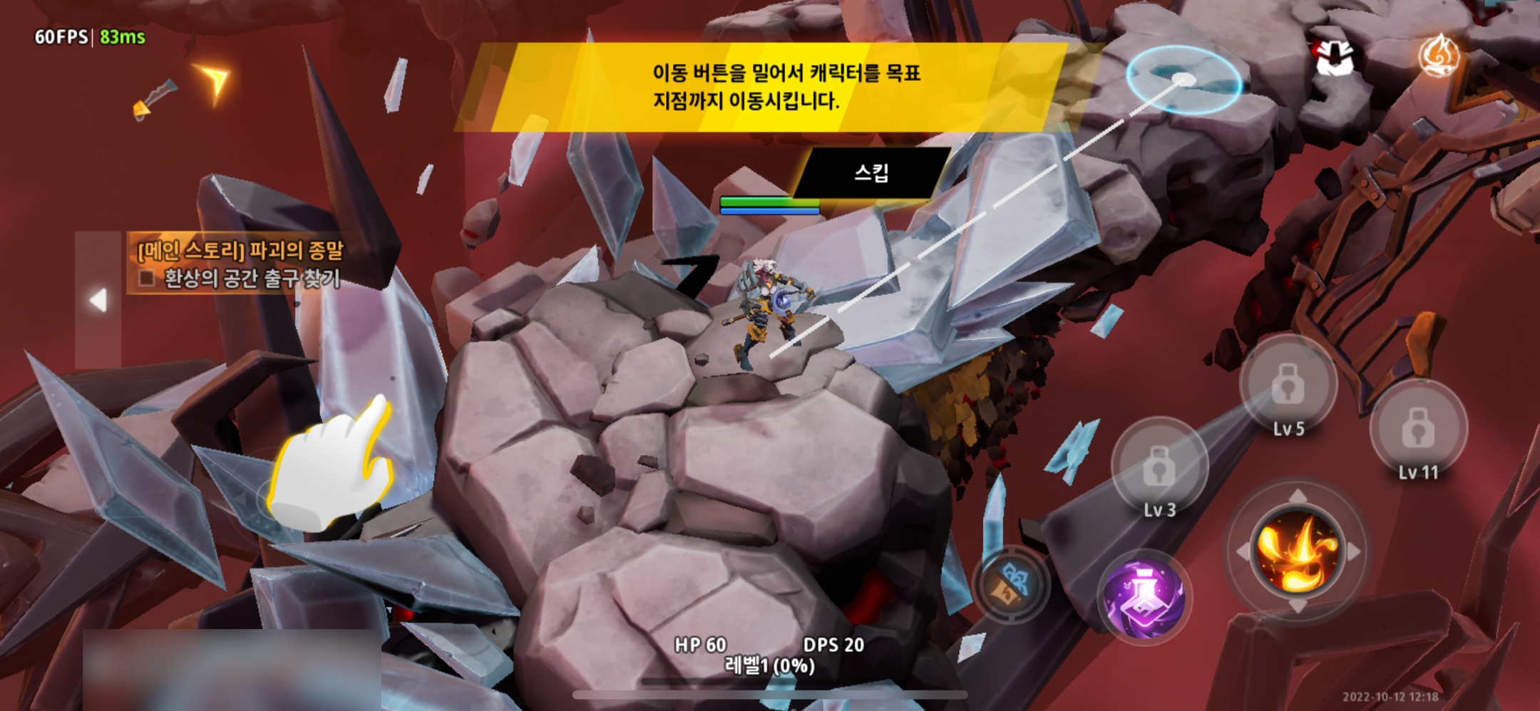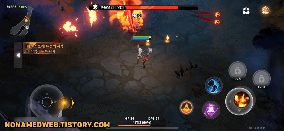 직업을 선택하고 닉네임(최대14글자까지 허용, 한글은 글자당 두글자로 취급)을 정하자 튜토리얼이 곧바로 시작됩니다. 핵앤슬래시 게임 답게 가상 패드가 화면에 등장합니다.