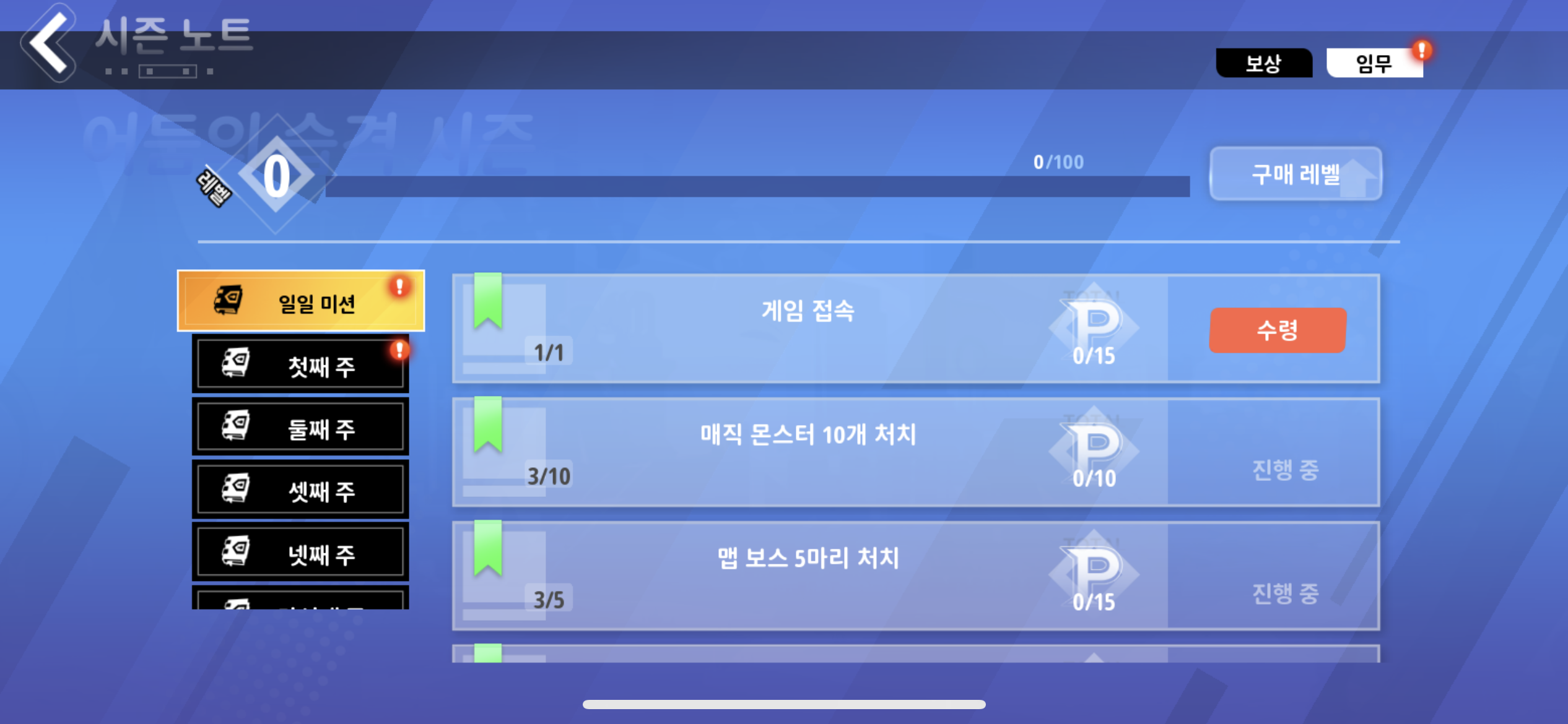 이외에도 시즌 보상과 시즌 임무가 있어서 재밌게 플레이가 가능하겠어요.