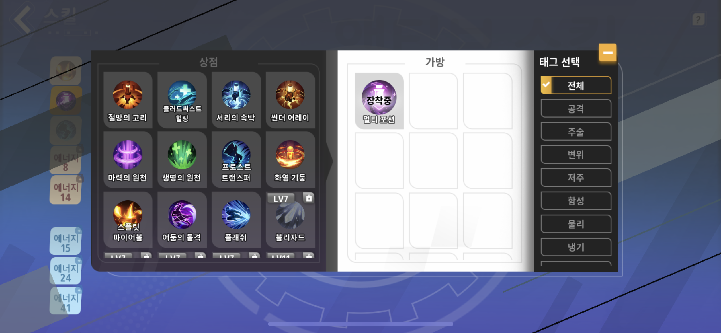 캐릭터가 사용할 수 있는 다양한 스킬들이 있습니다. 물론 직업마다 다~ 다르겠죠? 레벨이 오를수록 다양한 스킬을 배울 수 있고 사용 가능한 스킬 슬롯 또한 늘어납니다. 레벨이 오르거나 장비 제작시 증가하는 에너지가 15에 도달하면 더욱더 다양한 스킬을 사용할 수 있게 됩니다.