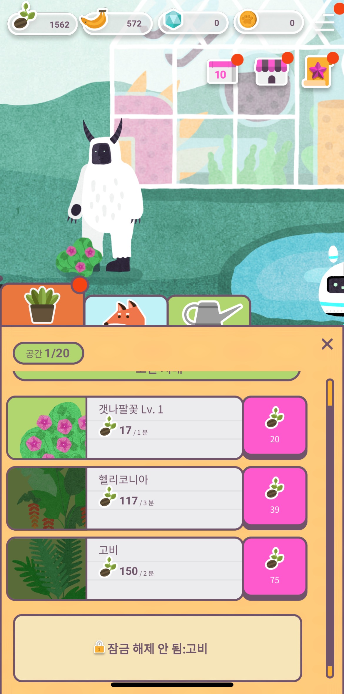 식물에게서 얻을 수 있고 식물을 업그레이드할 수 있는 씨앗과, 동물에게서 얻을 수 있고 동물을 생산할 수 있는 식량(바나나)이 있습니다.