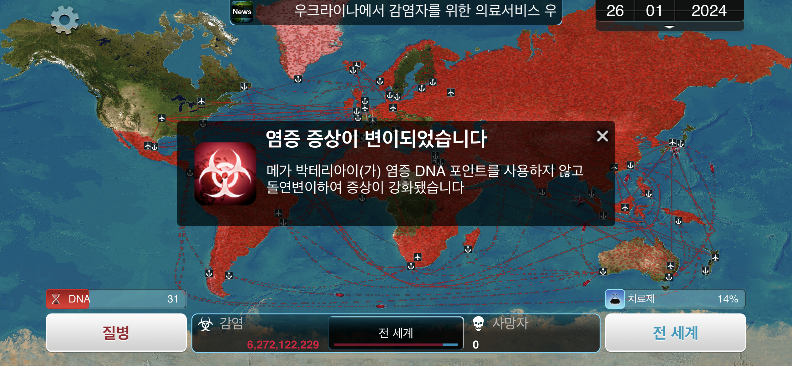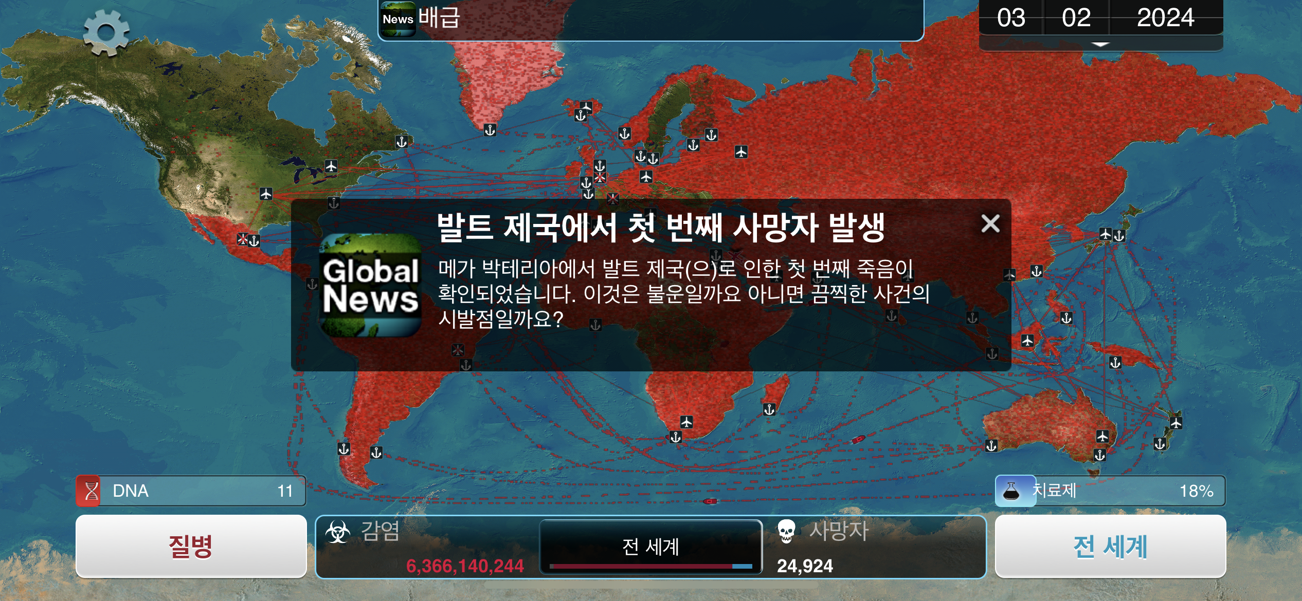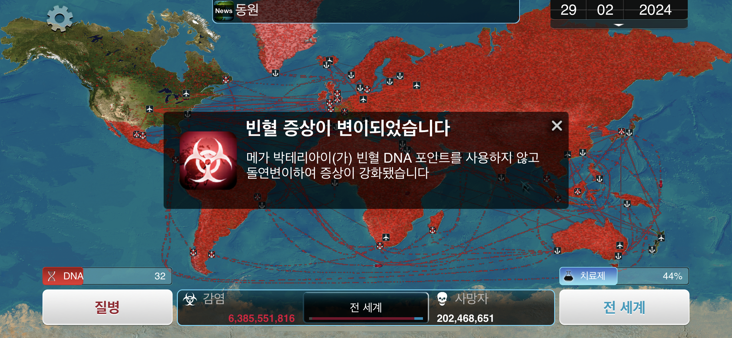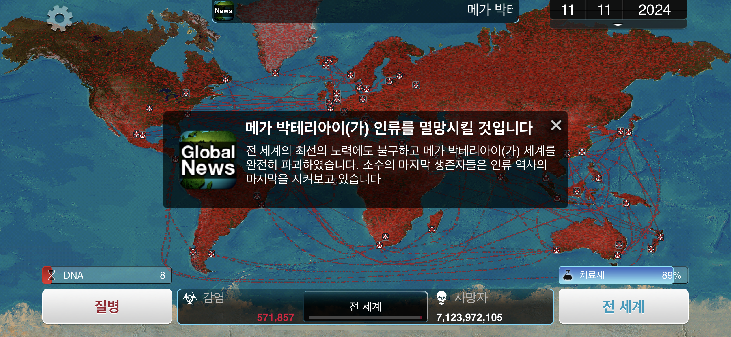 26. 2024년 2월 29일. 메가 박테리아가 또한번의 돌연변이를 일으킵니다. 전 세계의 63억명이 전염병에 감염되었고 2억명이 사망했습니다. 치료제가 44%까지 개발된 상황입니다.