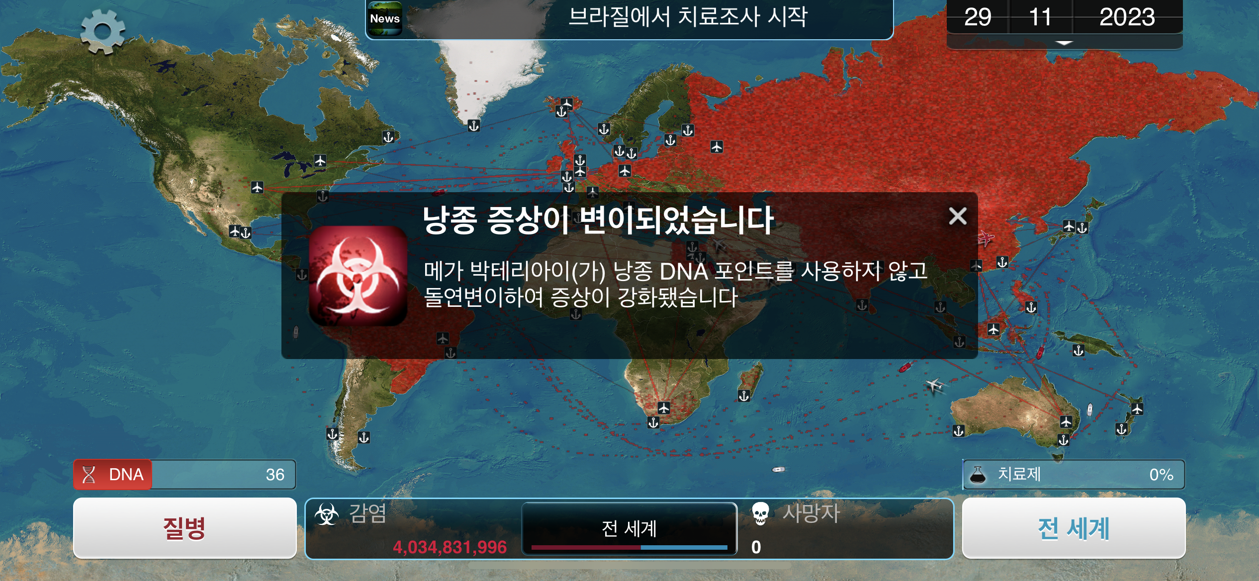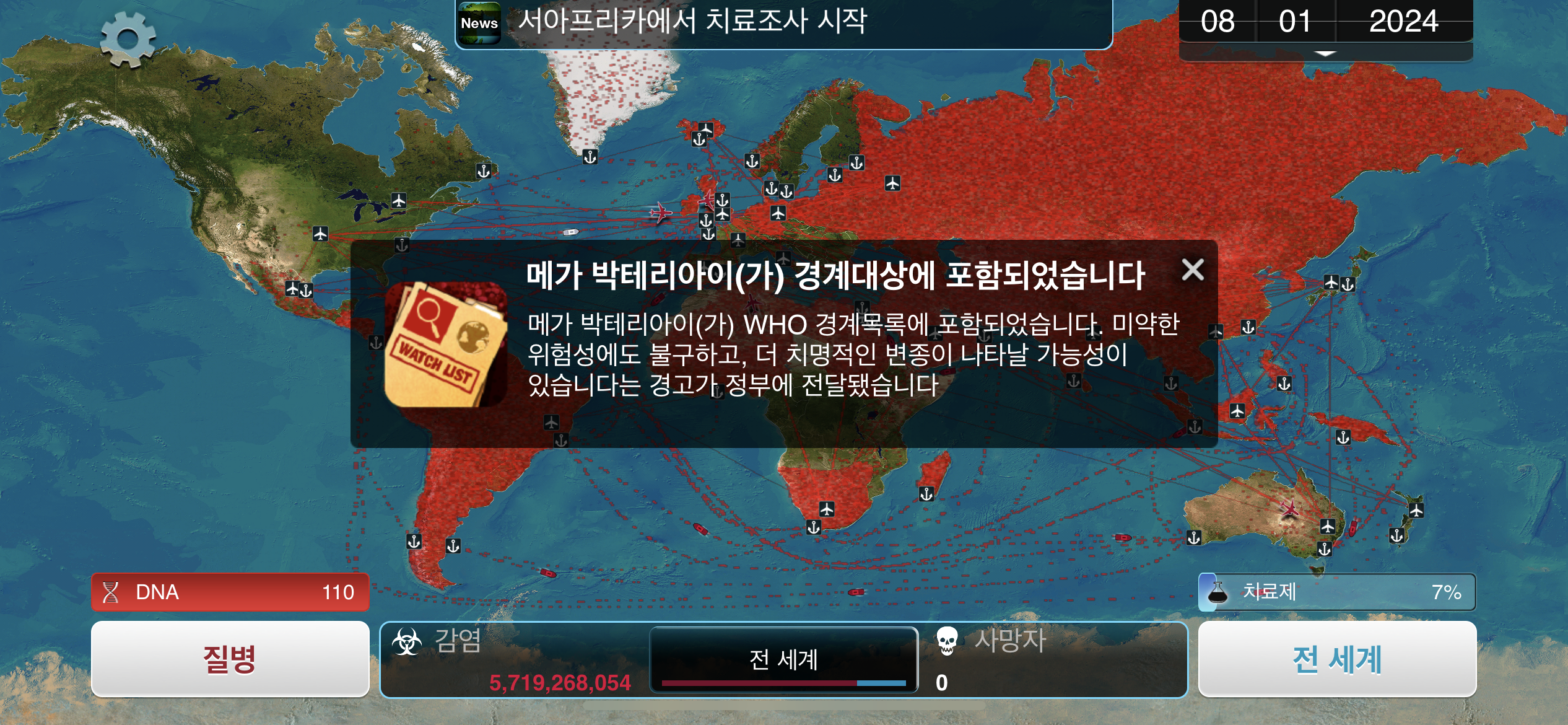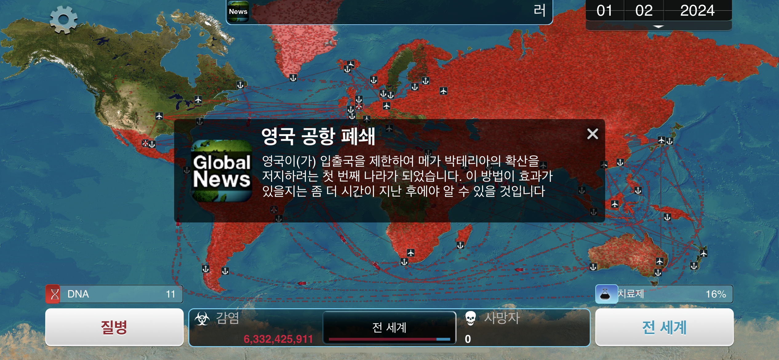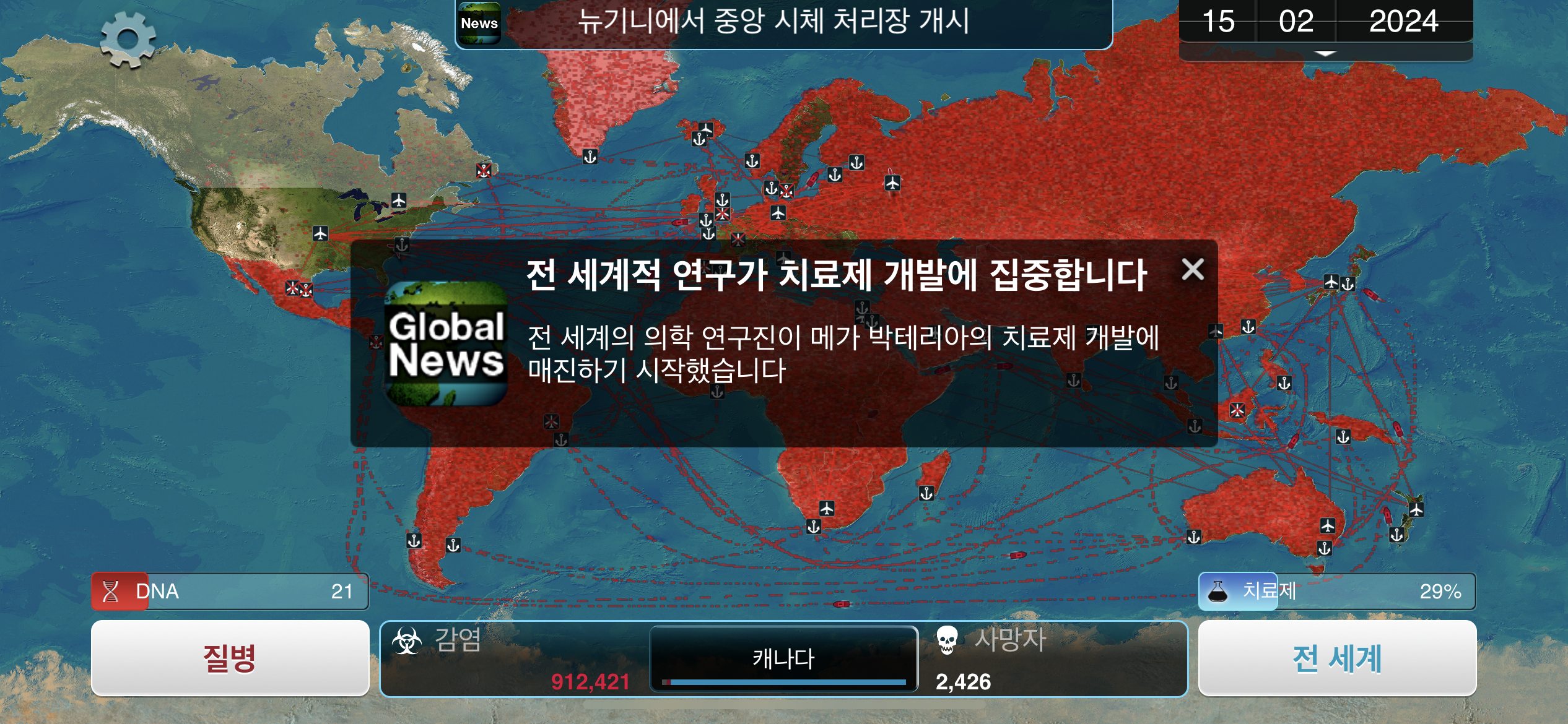 26. 2024년 2월 29일. 메가 박테리아가 또한번의 돌연변이를 일으킵니다. 전 세계의 63억명이 전염병에 감염되었고 2억명이 사망했습니다. 치료제가 44%까지 개발된 상황입니다.
