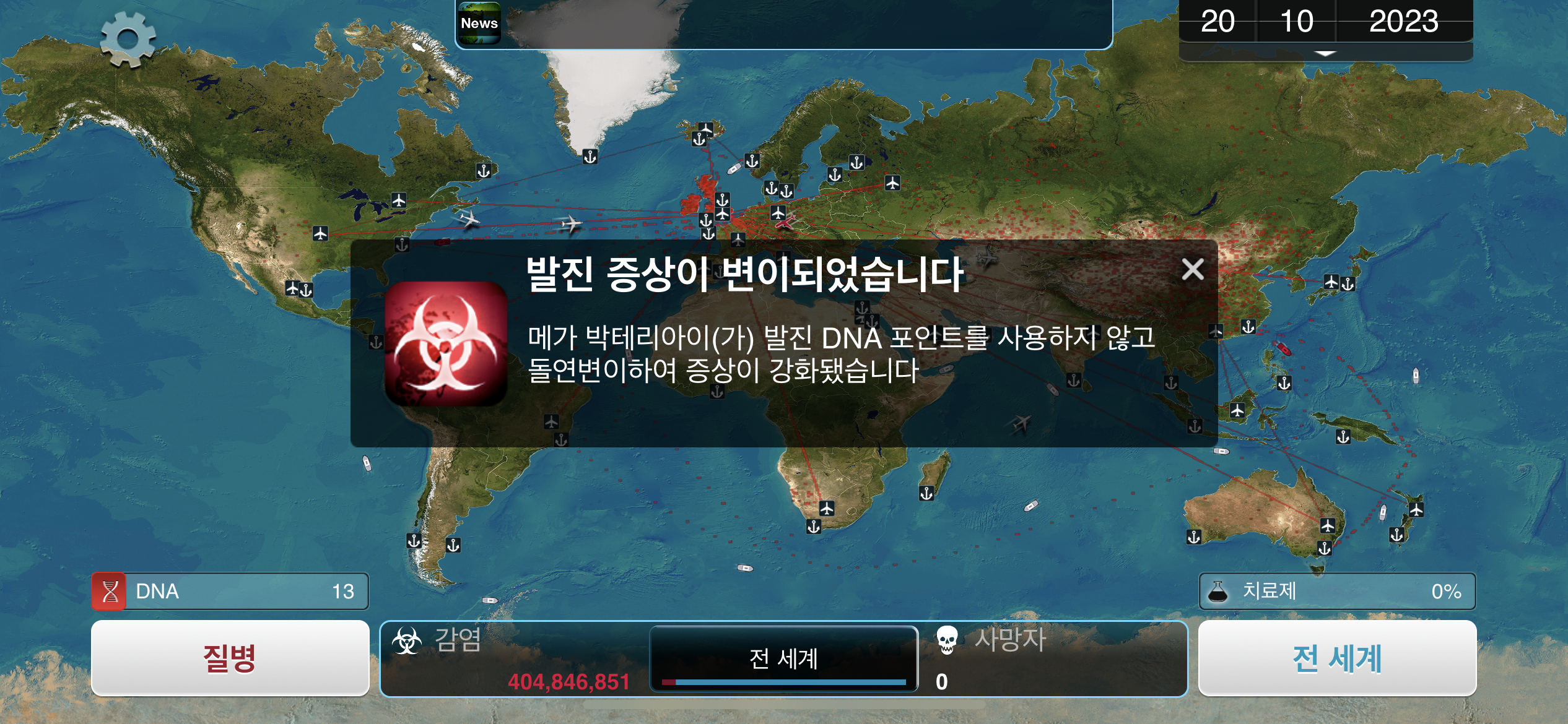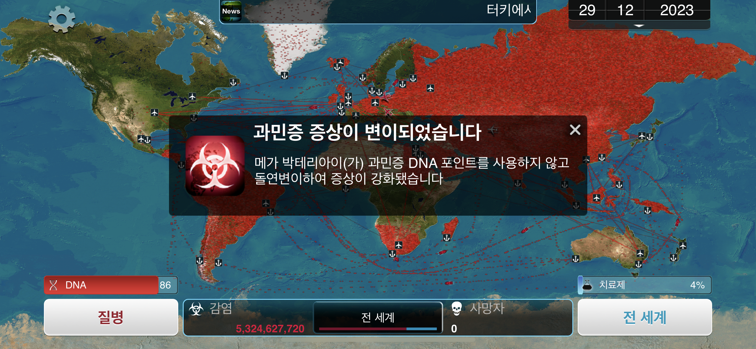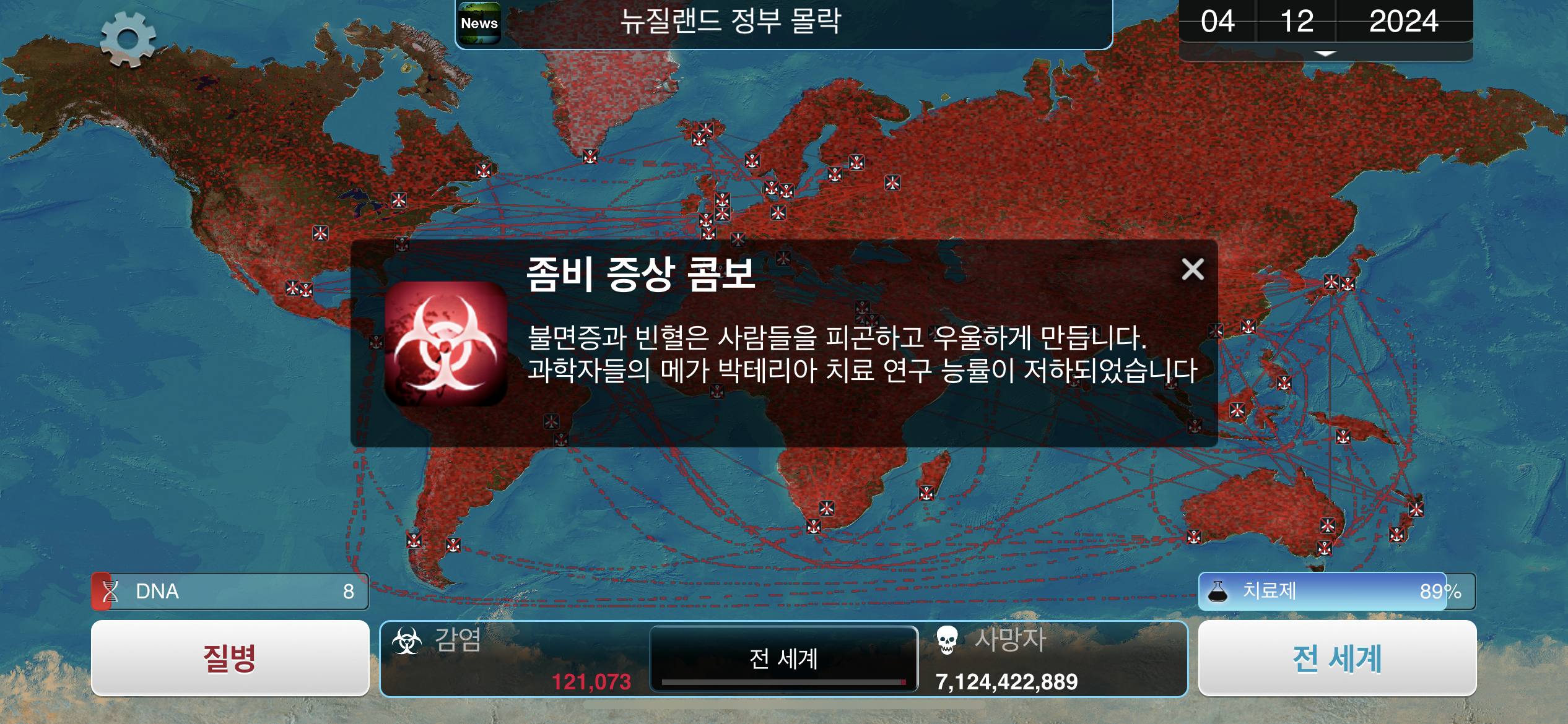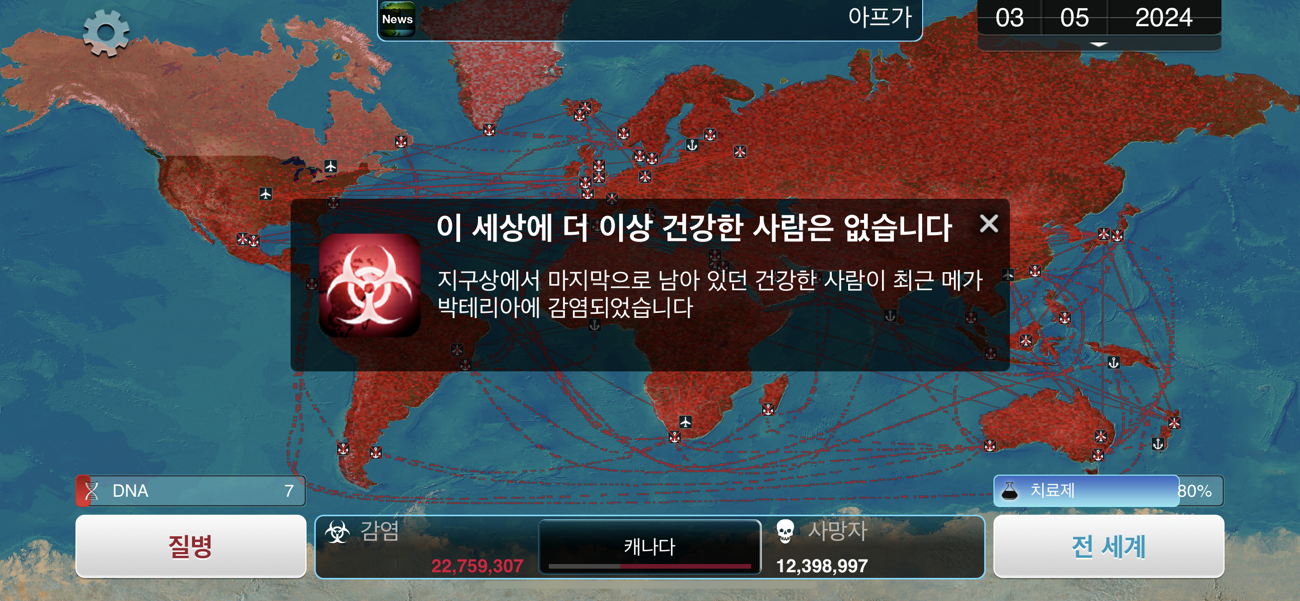 26. 2024년 2월 29일. 메가 박테리아가 또한번의 돌연변이를 일으킵니다. 전 세계의 63억명이 전염병에 감염되었고 2억명이 사망했습니다. 치료제가 44%까지 개발된 상황입니다.