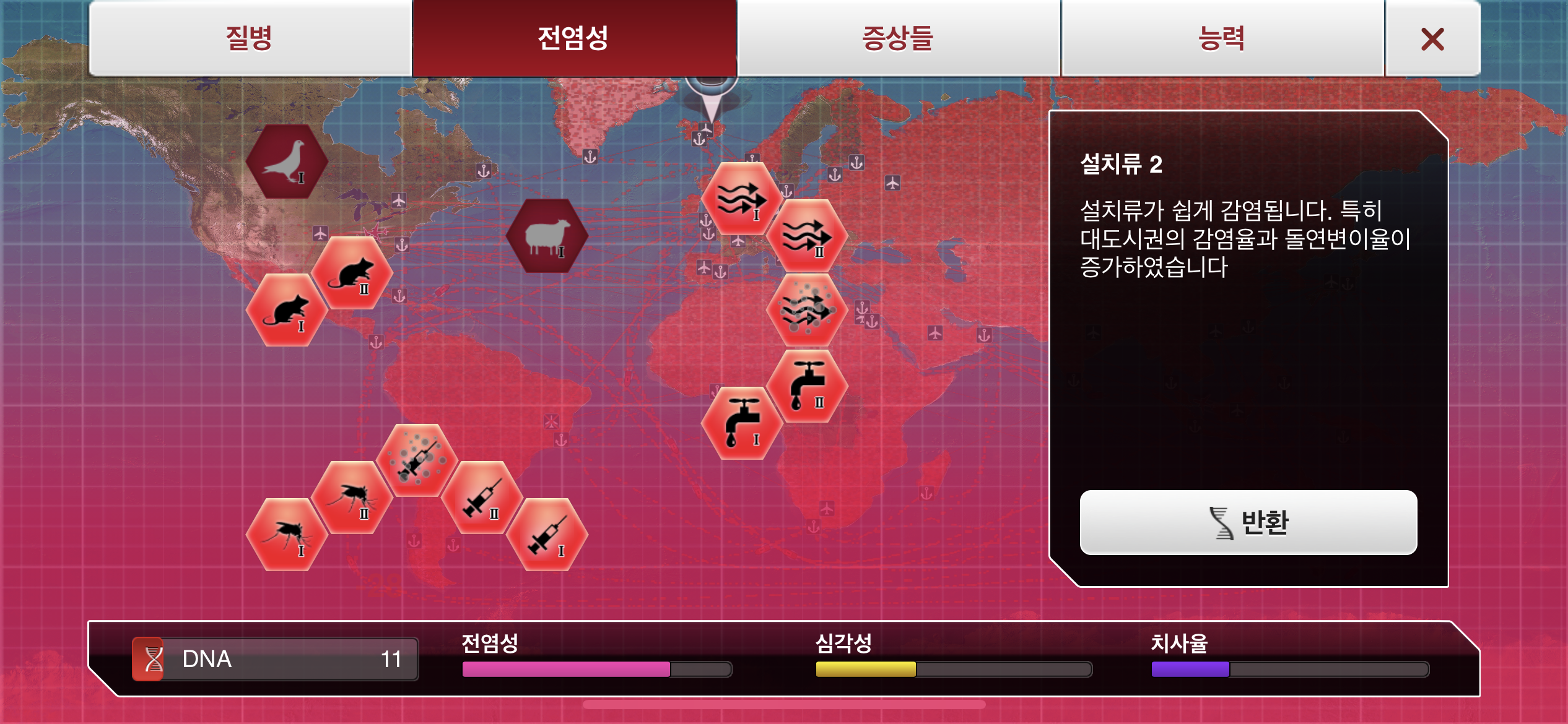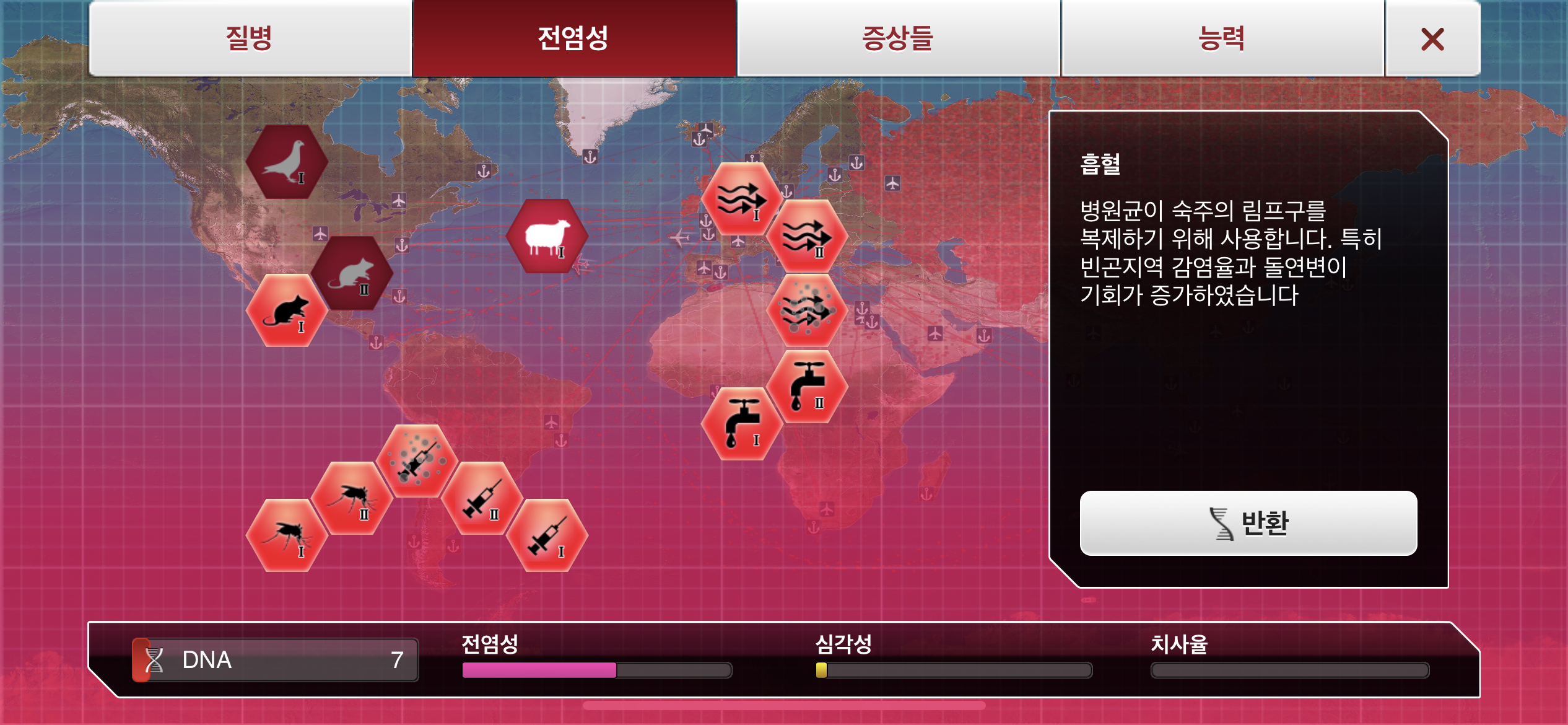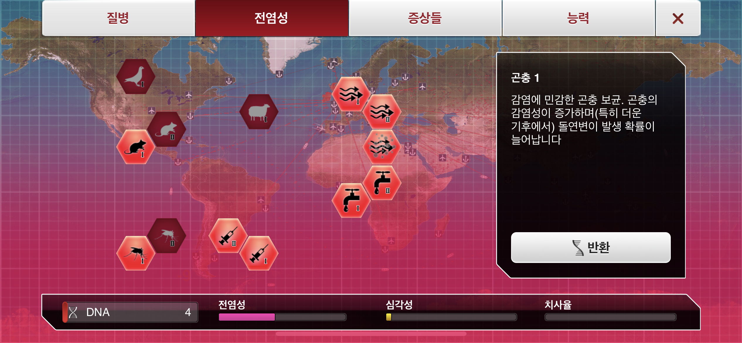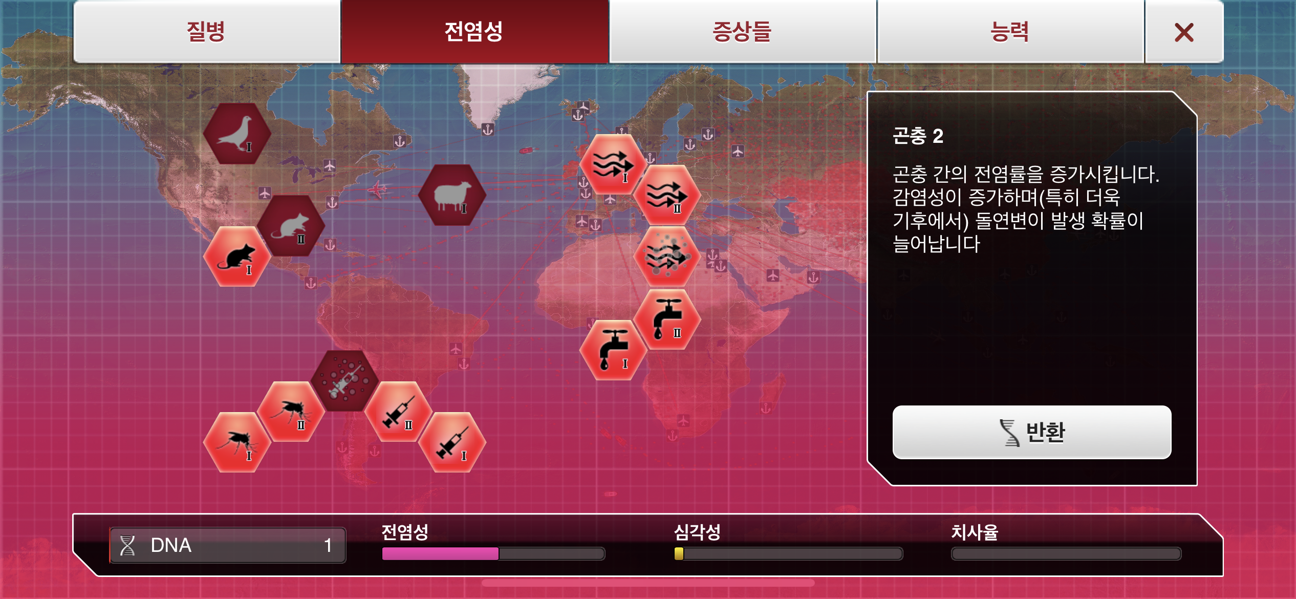 15. DNA가 모이는대로 곤충1-곤충2-흡혈 순으로 진화하며 전염병이 세계 곳곳으로 퍼질때까지 기다리며 DNA를 모아둡니다. 잠깐의 여유를 가지는 시간입니다.