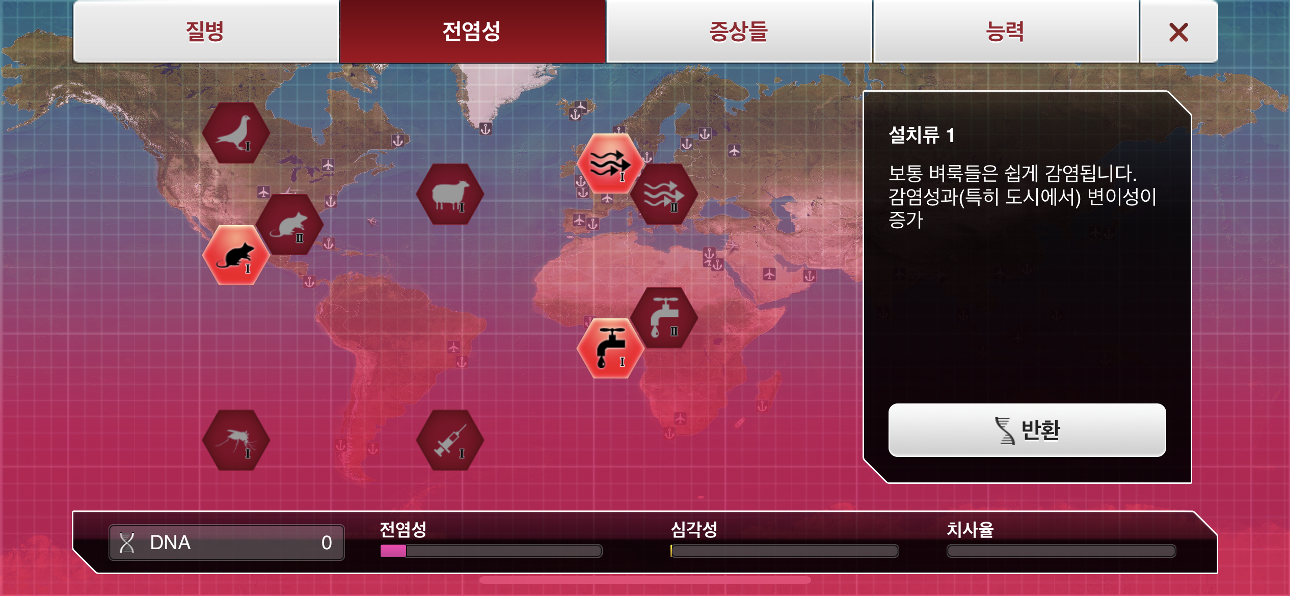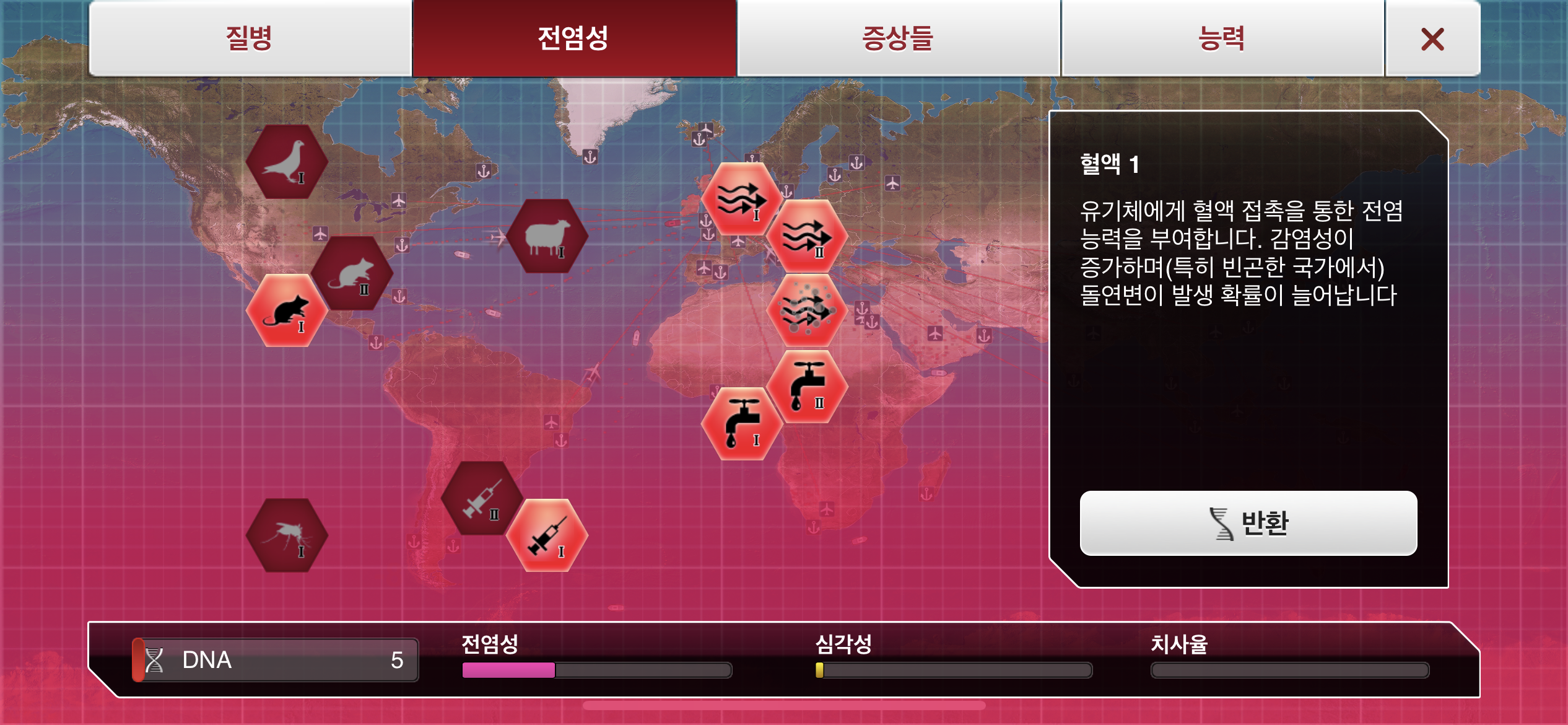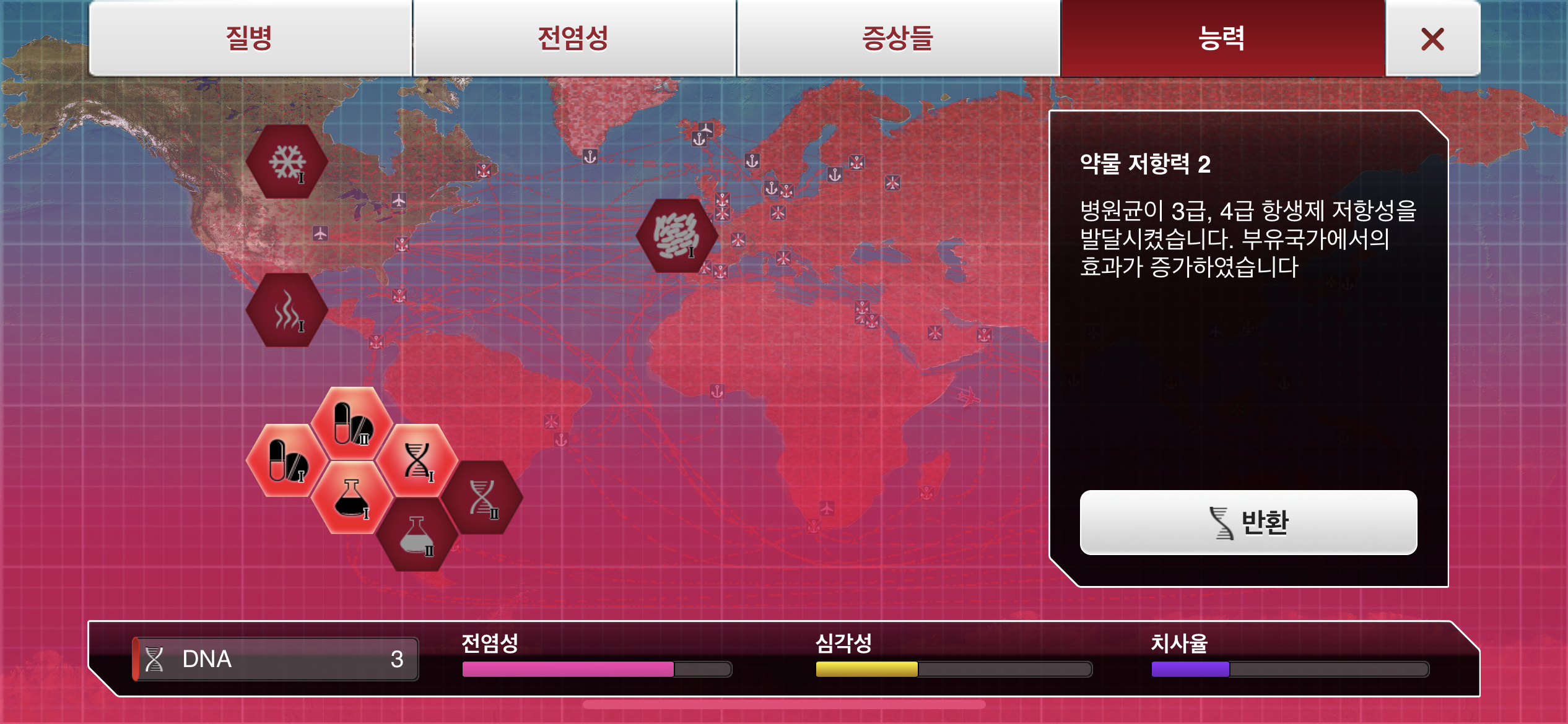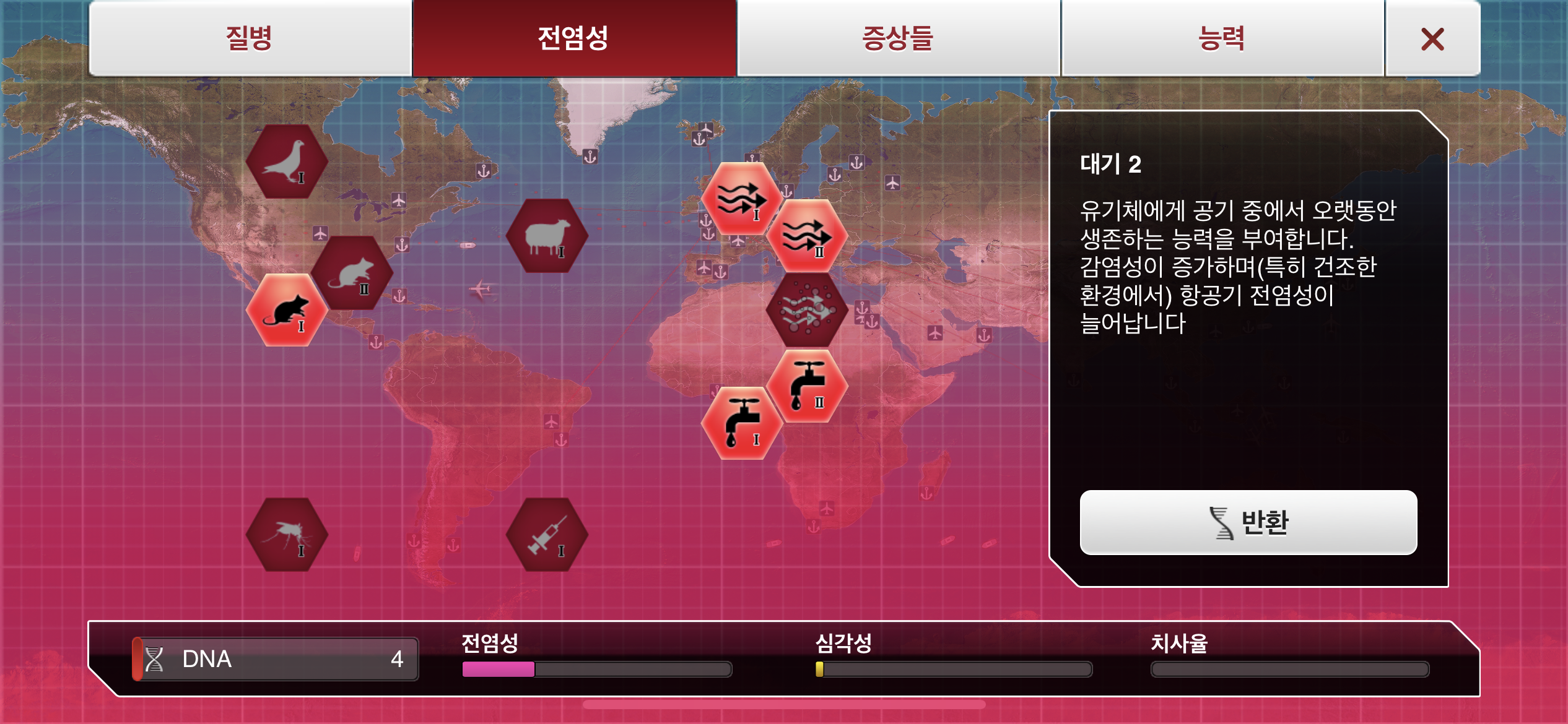 15. DNA가 모이는대로 곤충1-곤충2-흡혈 순으로 진화하며 전염병이 세계 곳곳으로 퍼질때까지 기다리며 DNA를 모아둡니다. 잠깐의 여유를 가지는 시간입니다.