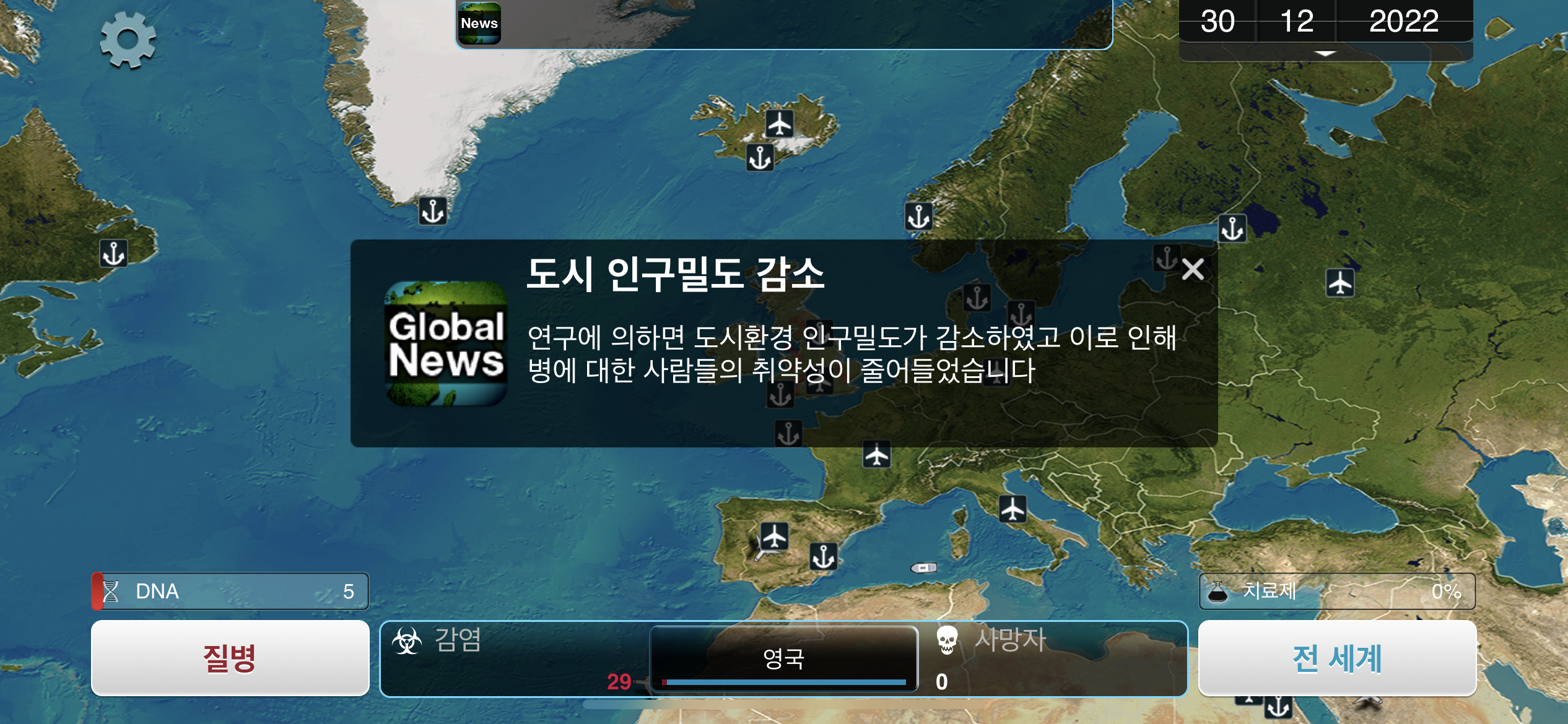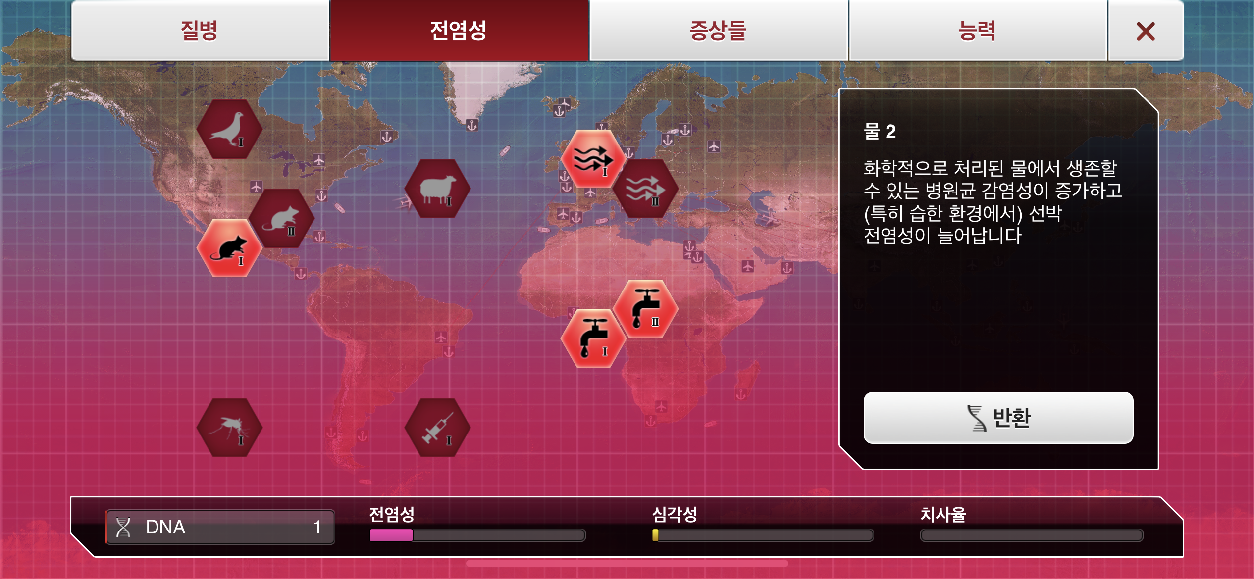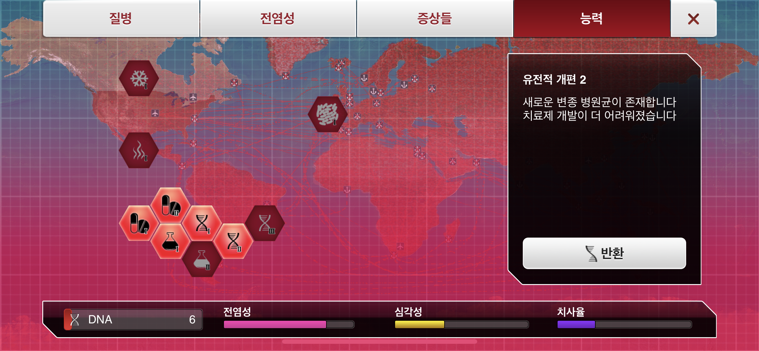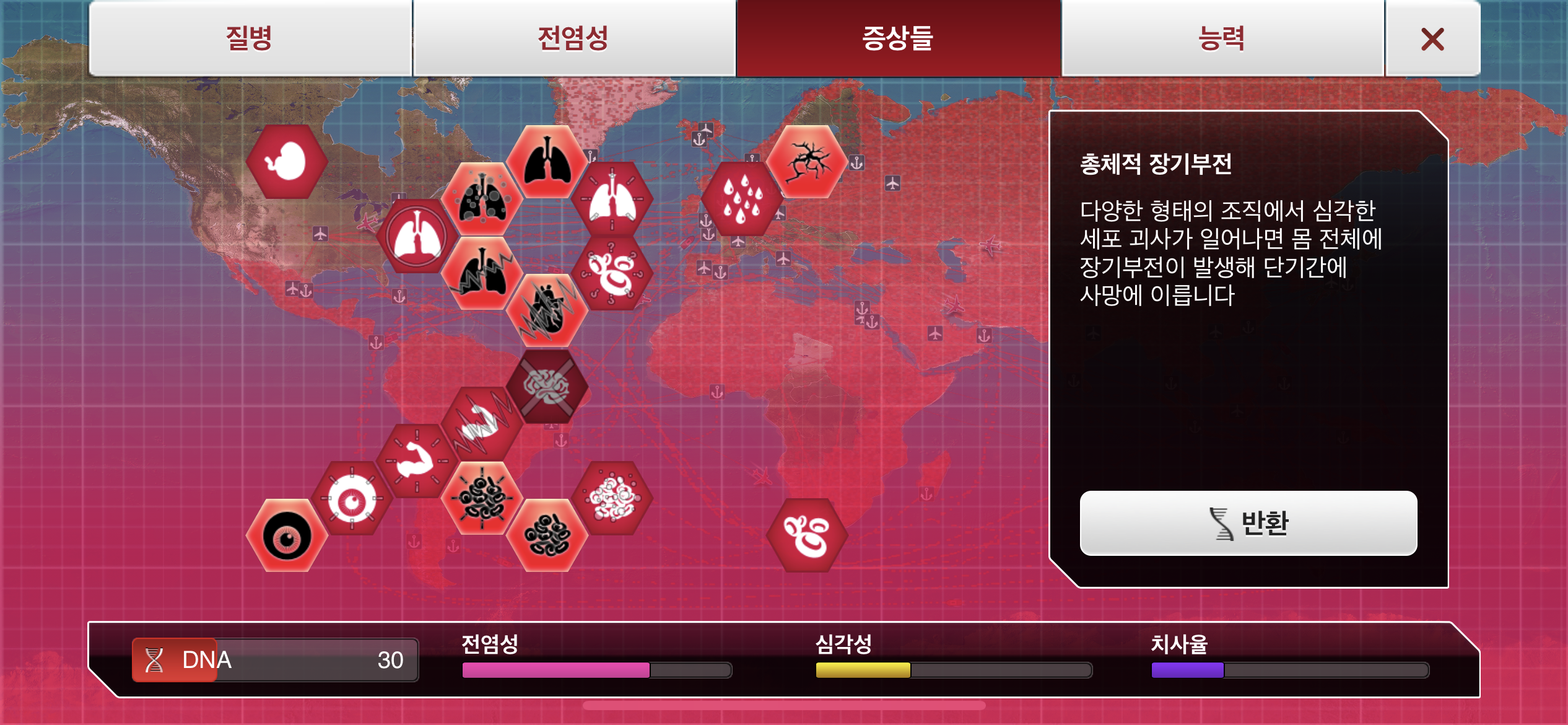 29. 치료제의 개발을 늦추기 위해 유전적 개편2를 진화했습니다. 유전적 개편1, 2, 3은 선택 사항이며 치명적인 증상을 진화해 심각성과 치사율을 높혀도 됩니다.