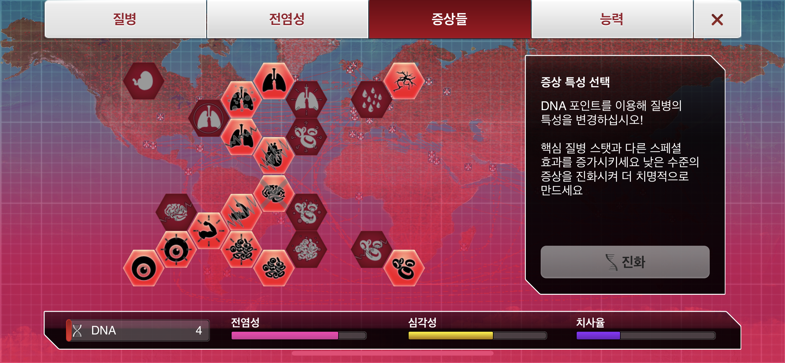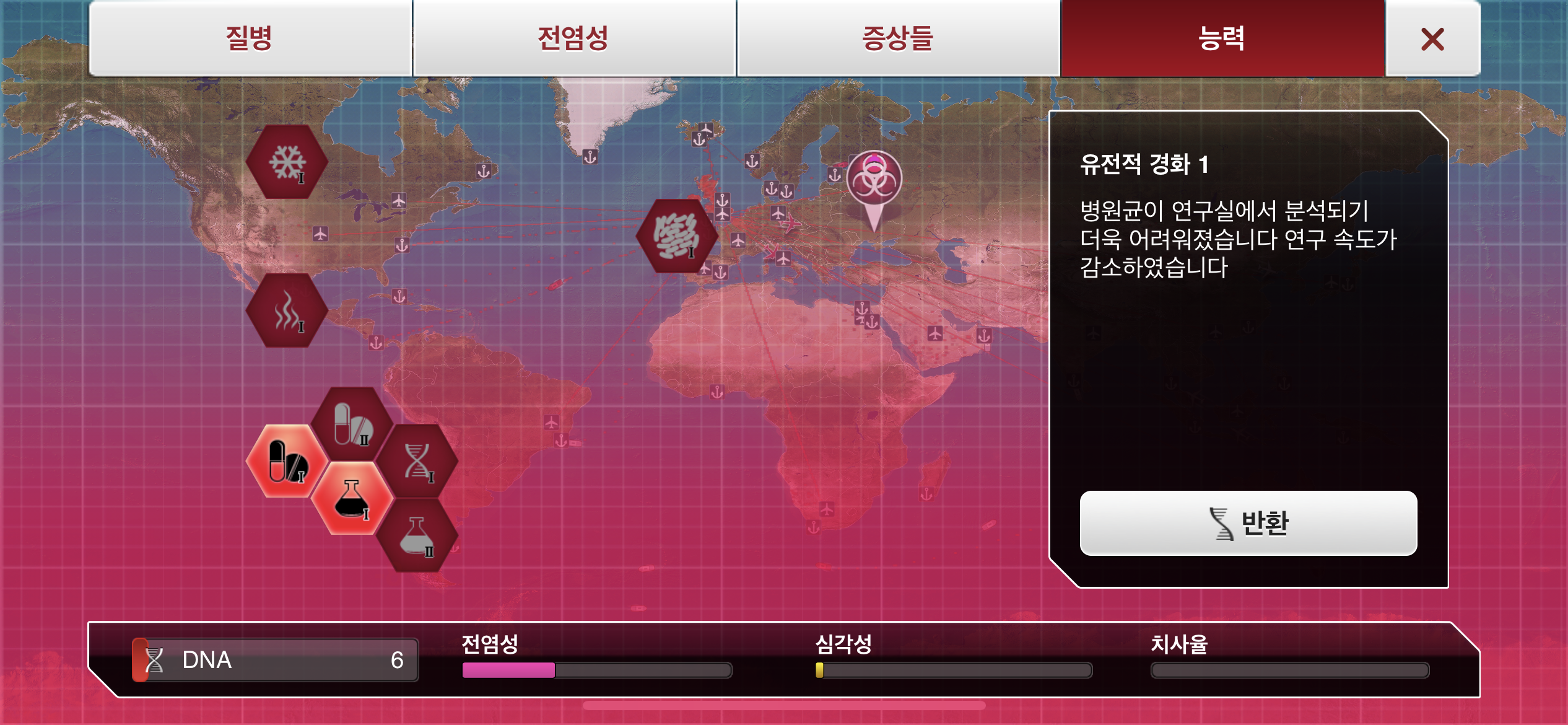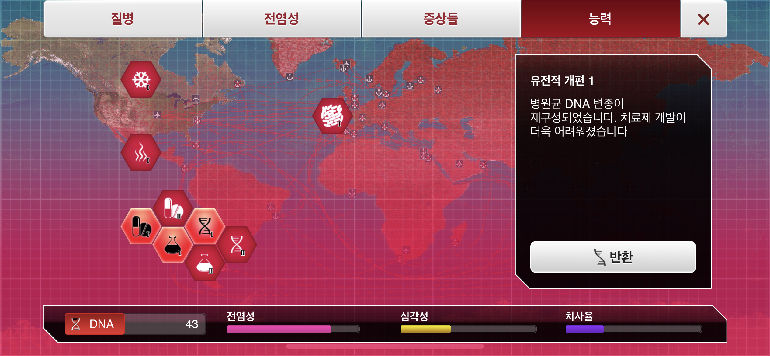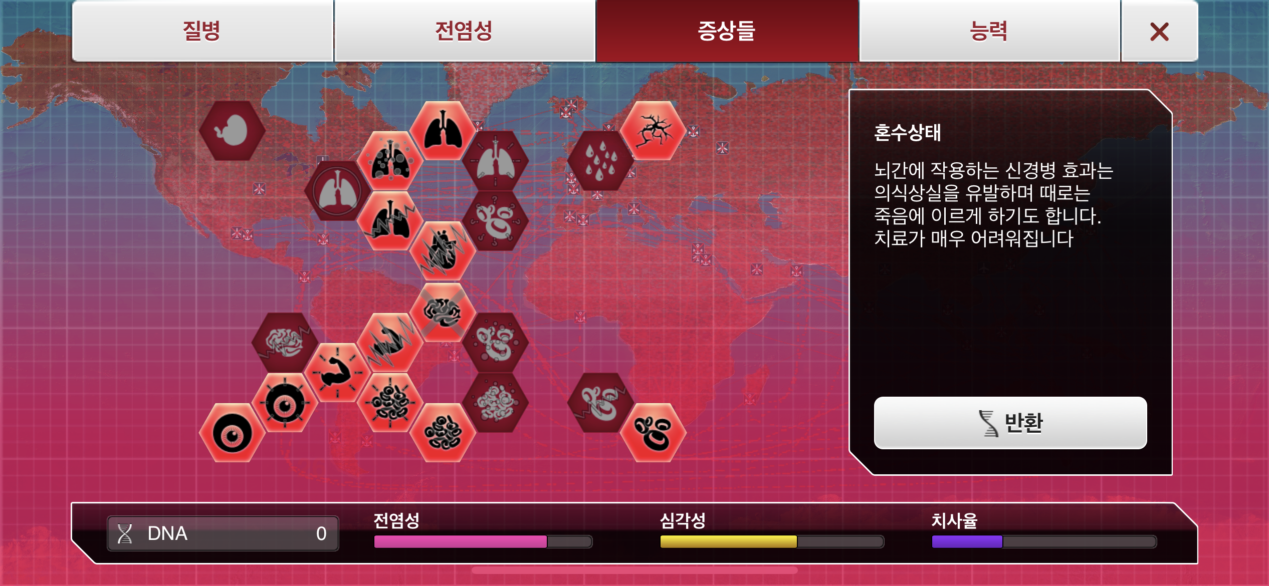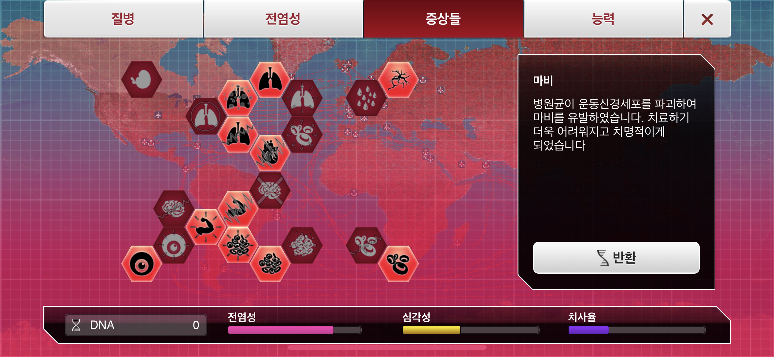 27. 치료제의 개발 속도가 제법 빨라 유전적 개편1을 진화했습니다. *유전적 개편1을 진행하지 않고 총체적 장기부전에 이어 혼수상태-마비 또는 불면증-편집증-발작-정신 이상을 진화해도 됩니다. 혼수상태와 마비, 정신 이상은 치료를 어렵게 만들기 때문에 심각성과 치사율은 높히고, 치료제 개발 진행도를 낮추는 효과가 있습니다.