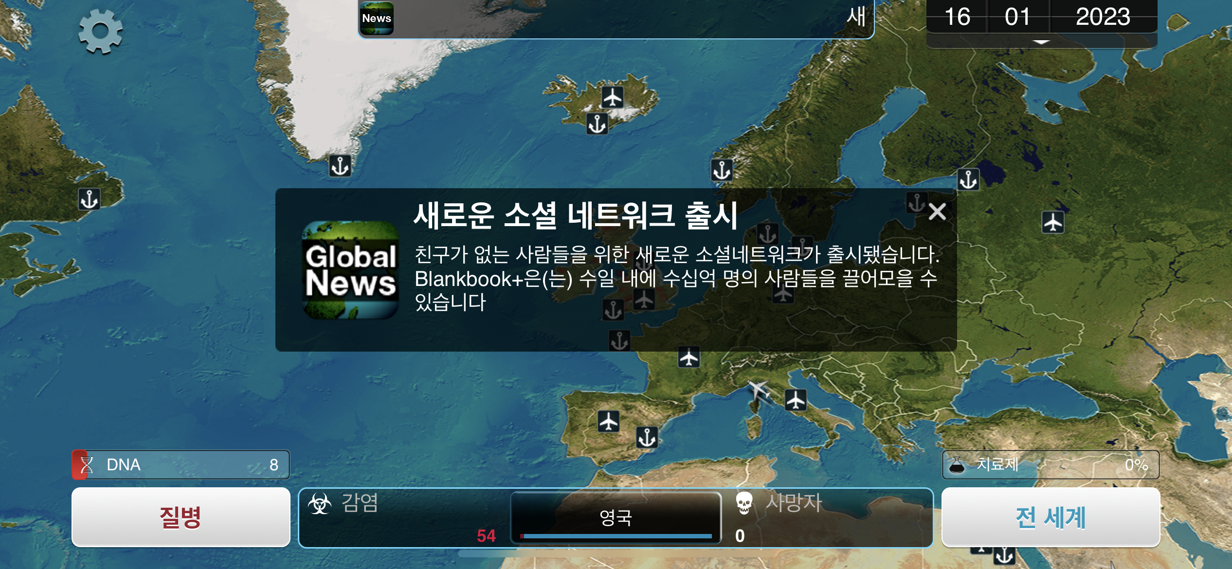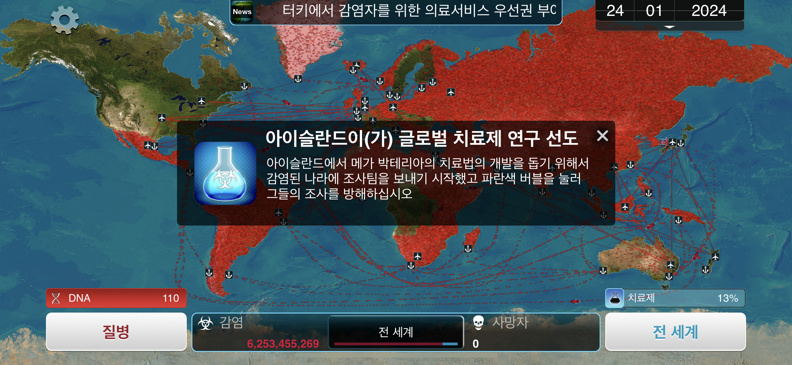 19. 전염병이 WHO 경계목록에 포함되면 머지않아 글로벌 치료제 연구가 시작됩니다. 2024년 1월 24일. 세계 감염자는 62억명이고, 아이슬란드(매번 랜덤 국가)의 선도하에 글로벌 치료제가 연구됩니다.