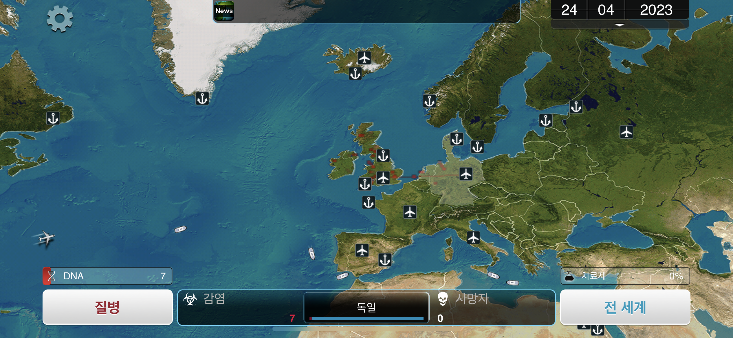 6. 2023년 4월 24일. 박테리아가 최초로 외국에 퍼졌습니다. 두번째 감염 국가는 독일이네요. 플레이마다 두번째 감염 국가는 매번 다릅니다. 노르웨이, 미국, 중국, 남아프리카, 이집트 등등.. 매번 달라도 진행에는 크게 문제되지 않습니다.