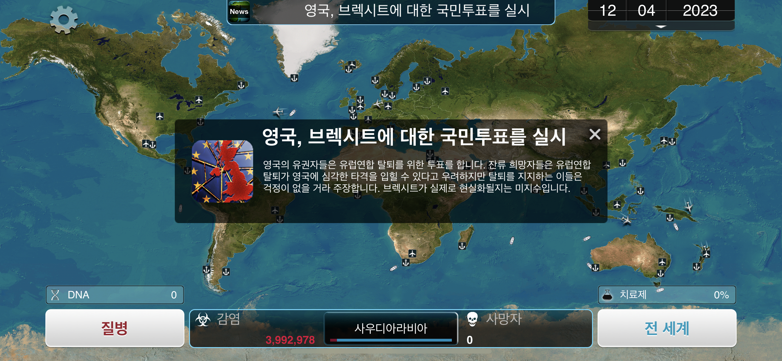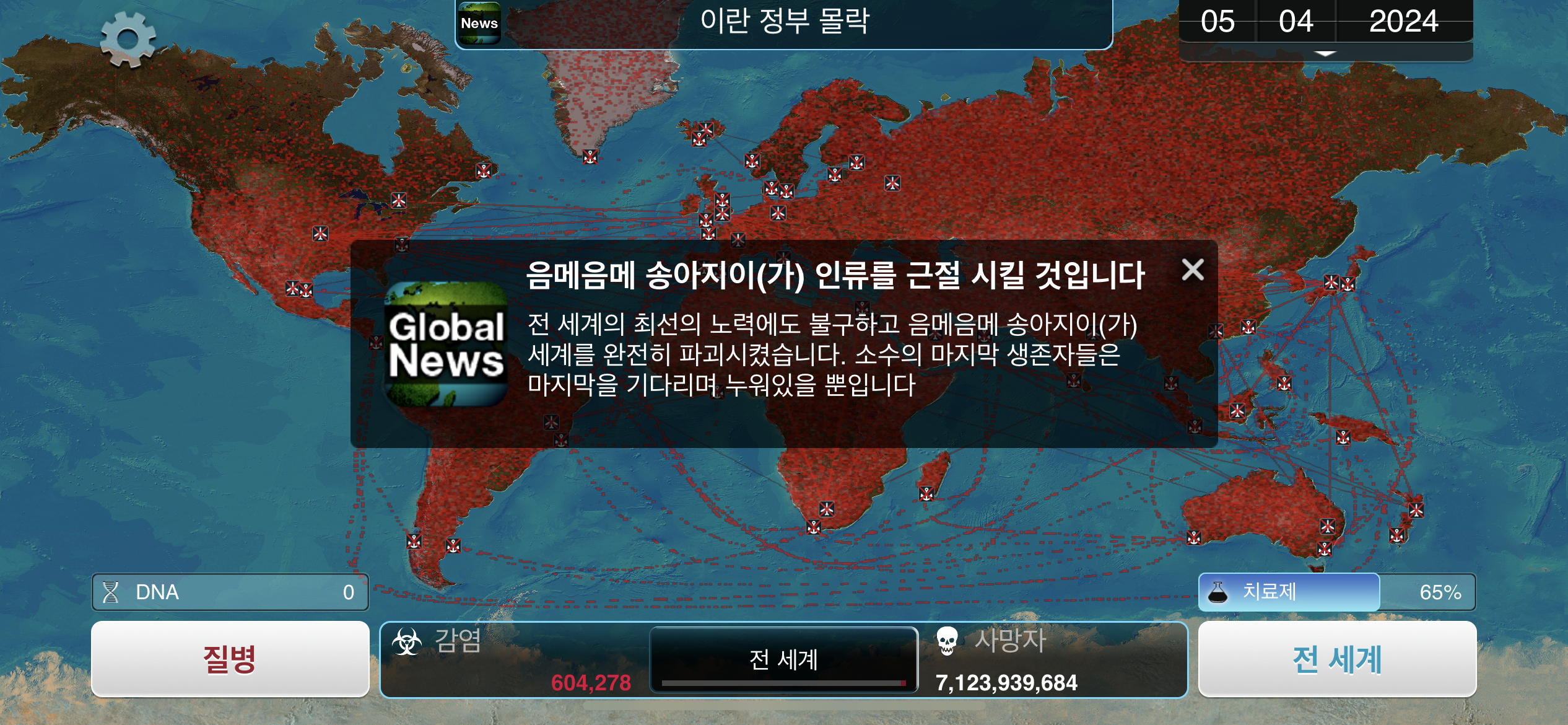 42. 2023년 12월 29일. 노르웨이 인구의 1/5가량이 사망하자 붕괴되기 시작합니다. 치료제 개발이 65%까지 진행됐습니다.