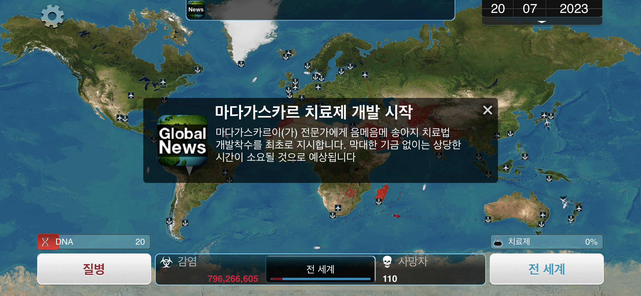 27. 2023년 7월 20일. 마다가스카르를 포함한 몇몇 국가에서 치료제 개발이 시작됩니다. 그 사이 감염자수는 점점늘어 8억명을 향해 가고있네요.
