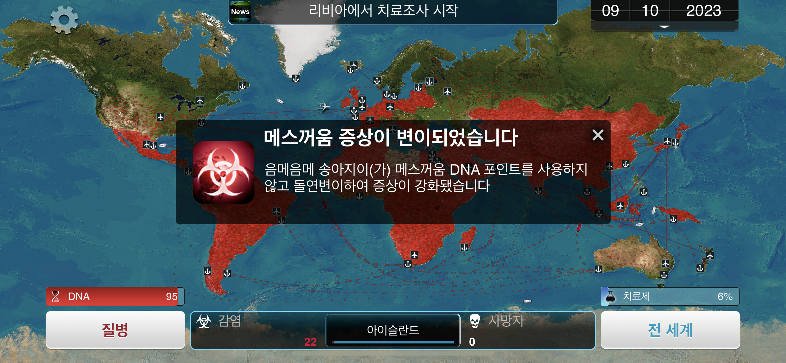 41. 2023년 12월 14일. 아이슬란드의 감염자 수는 네자리가 되었습니다. 괴사의 진화를 위해 DNA 포인트를 모으고 있었는데, 음메음메 송아지 곰팡이균이 똑똑하게 변이를 일으켰네요.