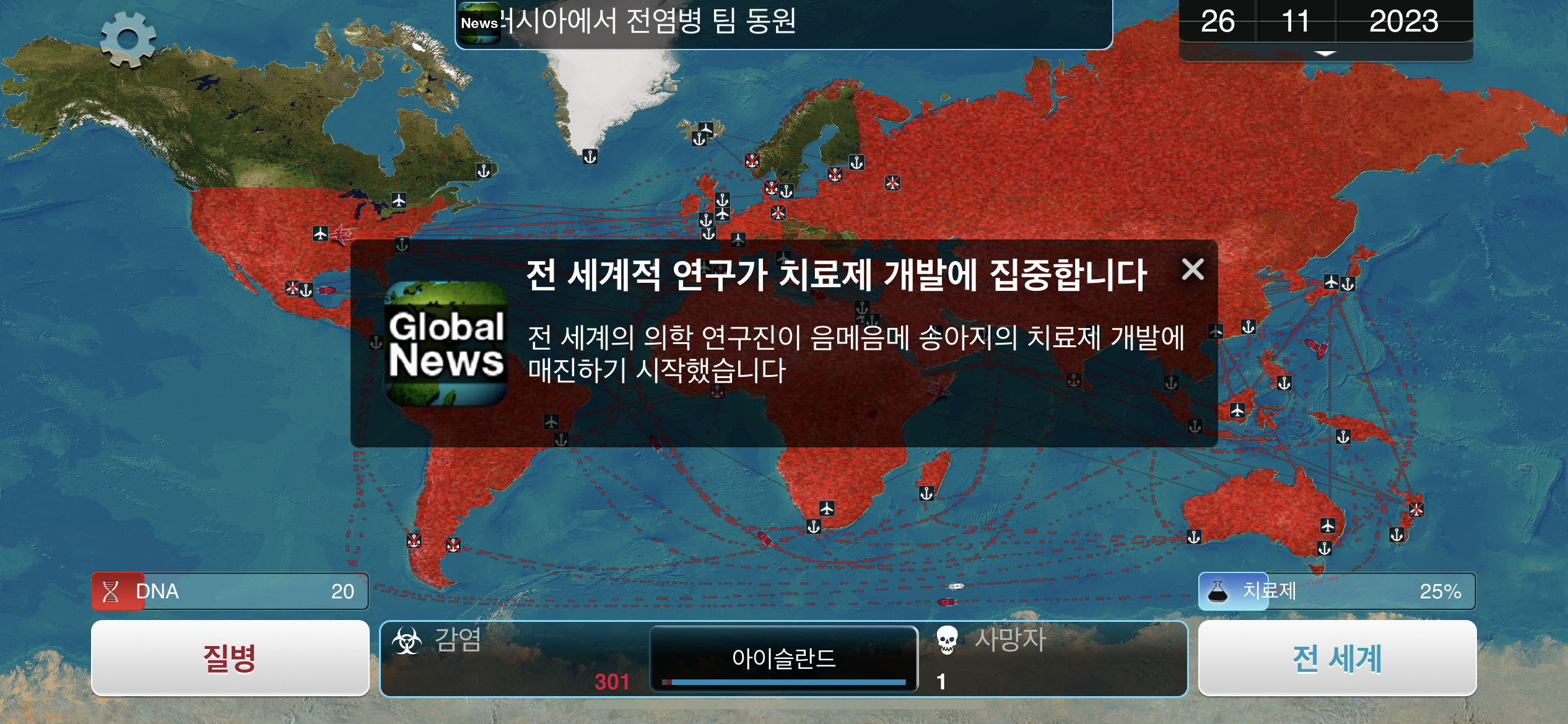 40. 2023년 11월 26일. 전 세계가 치료제 개발에 집중하기 시작합니다. 지금 아이슬란드의 감염자는 300명밖에 안되지만 곧 대폭 늘어날겁니다.