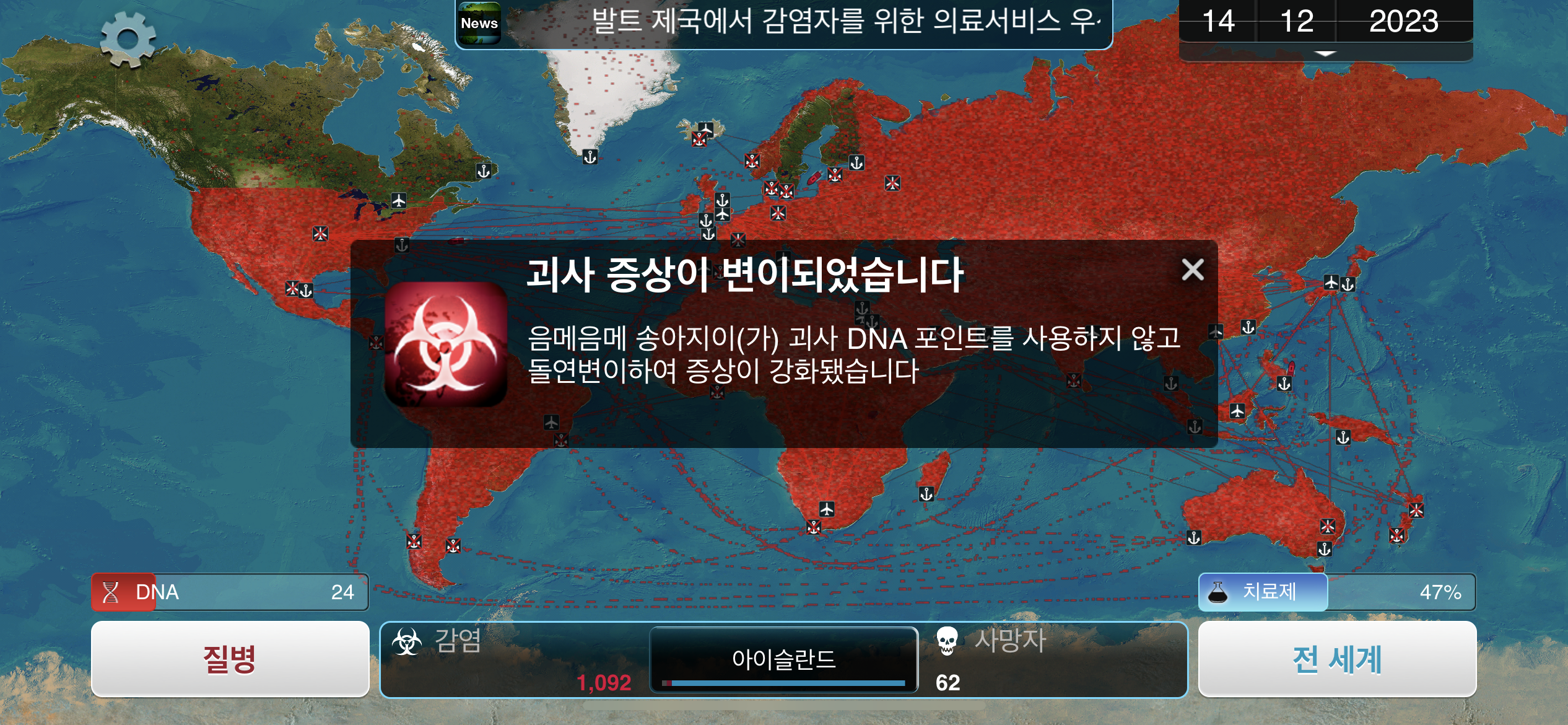 41. 2023년 12월 14일. 아이슬란드의 감염자 수는 네자리가 되었습니다. 괴사의 진화를 위해 DNA 포인트를 모으고 있었는데, 음메음메 송아지 곰팡이균이 똑똑하게 변이를 일으켰네요.