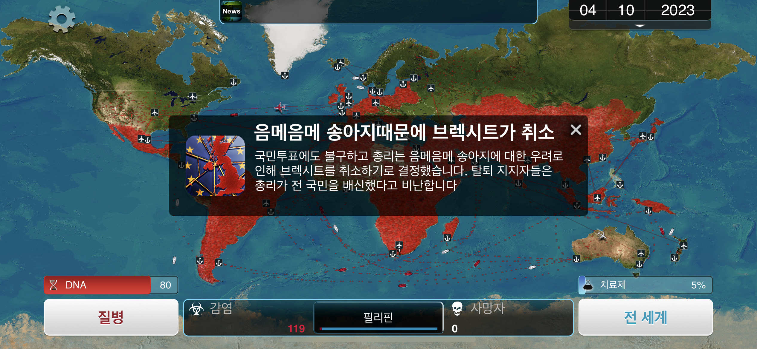 42. 2023년 12월 29일. 노르웨이 인구의 1/5가량이 사망하자 붕괴되기 시작합니다. 치료제 개발이 65%까지 진행됐습니다.