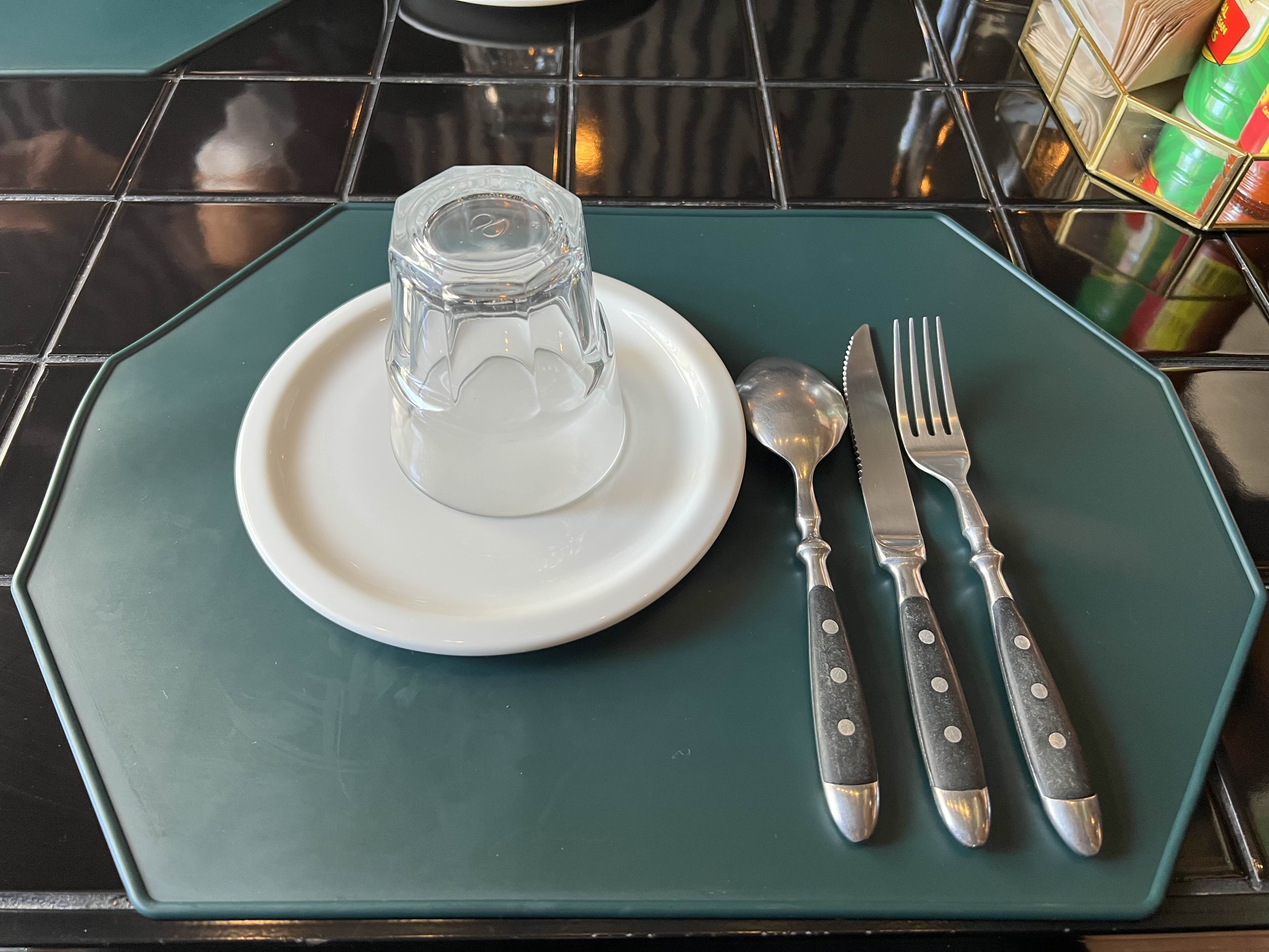 타일로 된 테이블에 앉았습니다. 귀여운 스푼과 포크, 나이프가 가지런히 세팅되어 있습니다.