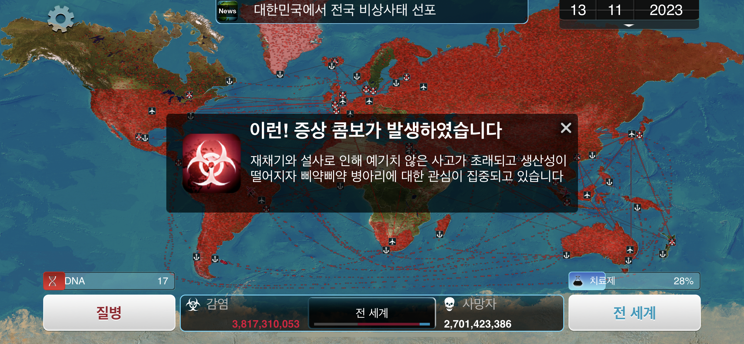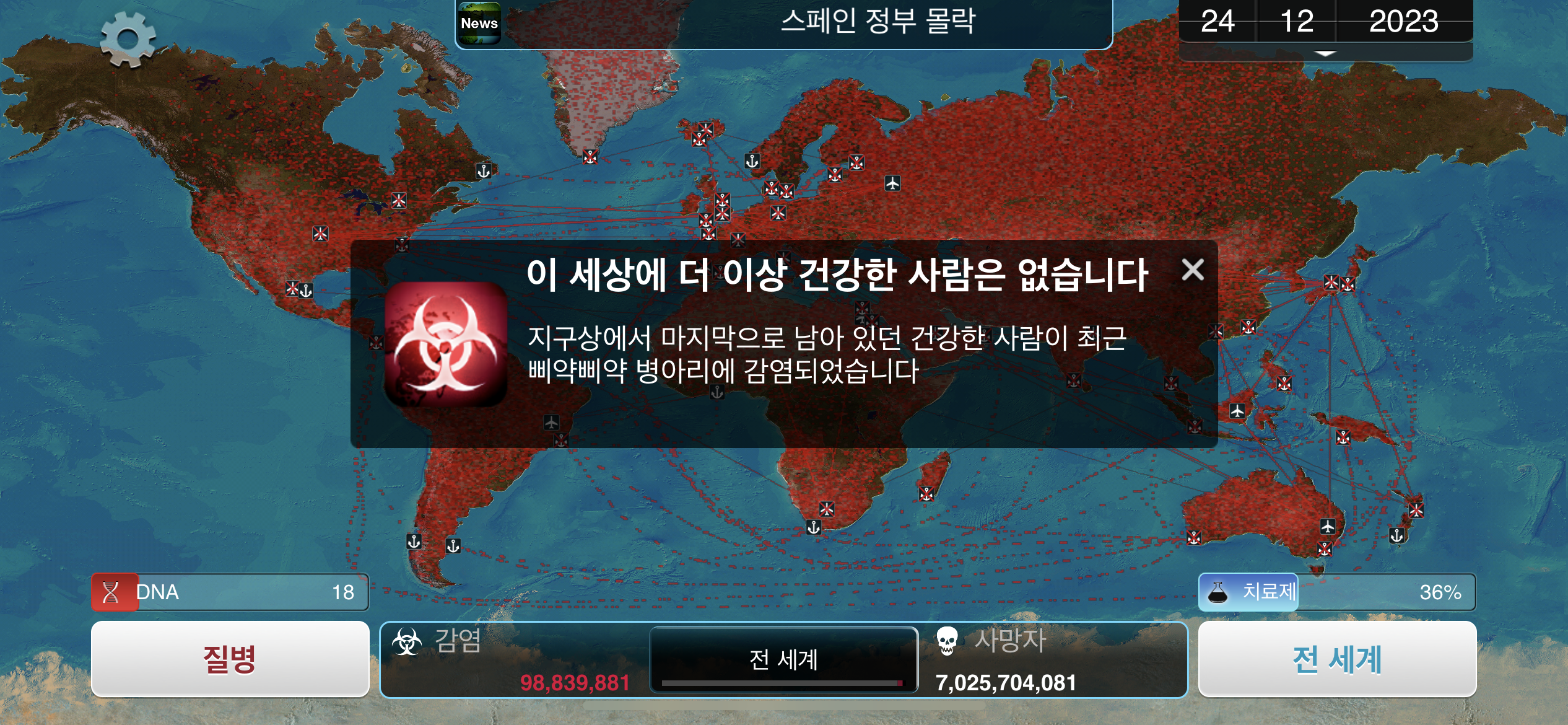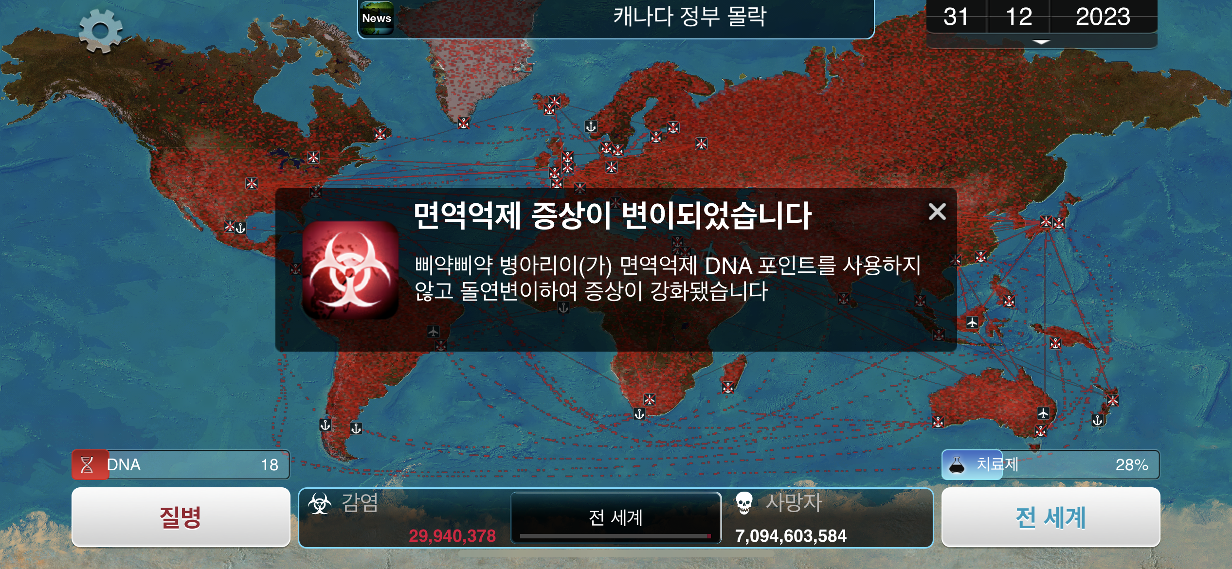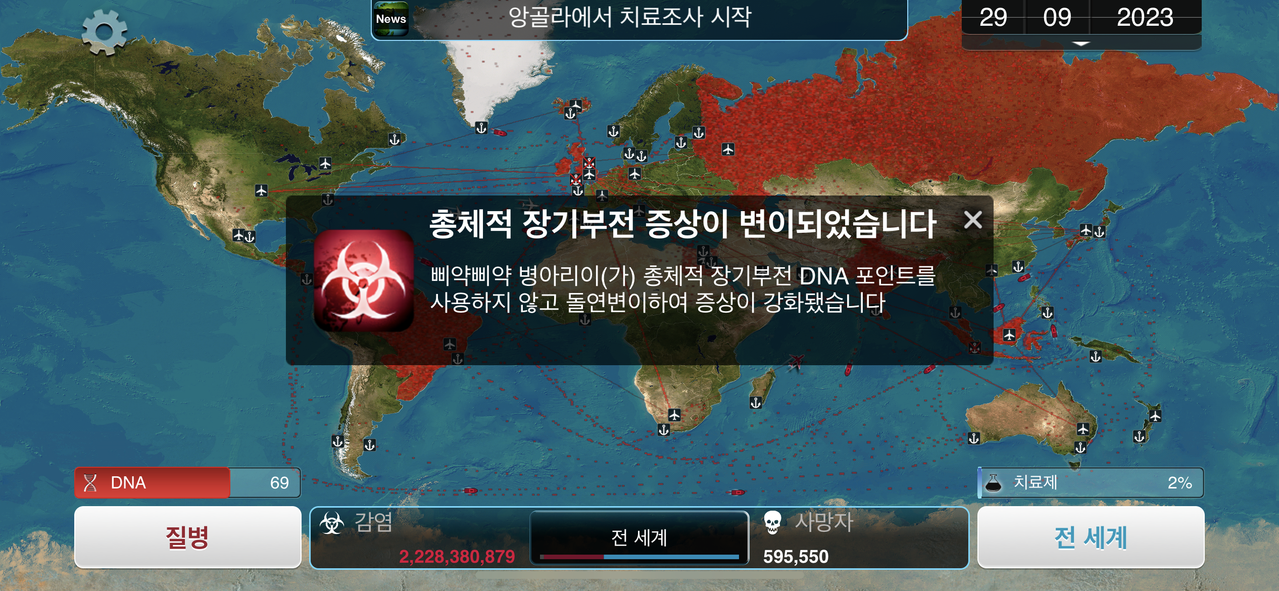 24. 2023년 9월 29일. 세계 인구 22억명이 감염되었습니다. DNA 포인트를 사용해 진화하려 했던 총체적 장기부전 증상이 돌연변이됩니다.