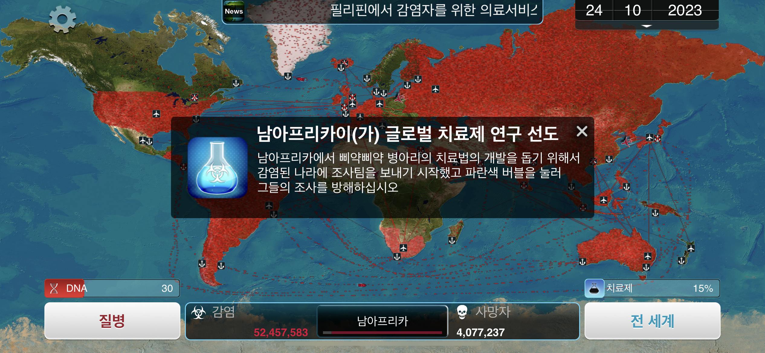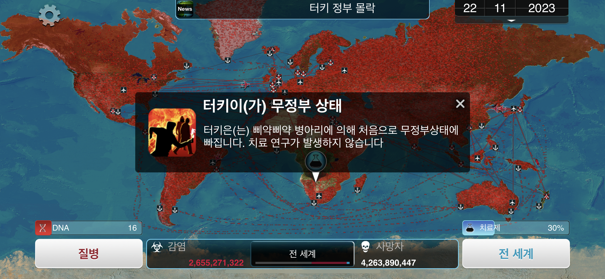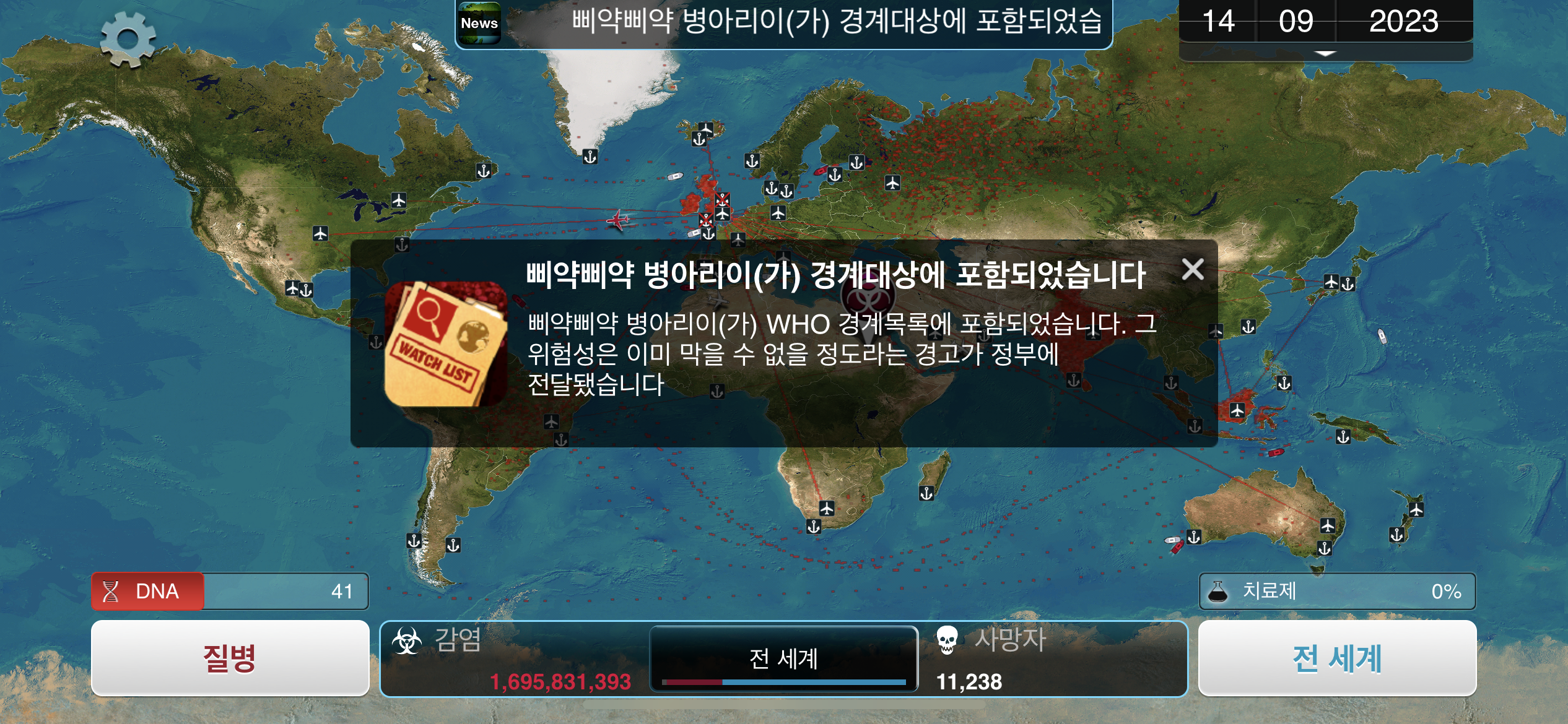 24. 2023년 9월 29일. 세계 인구 22억명이 감염되었습니다. DNA 포인트를 사용해 진화하려 했던 총체적 장기부전 증상이 돌연변이됩니다.