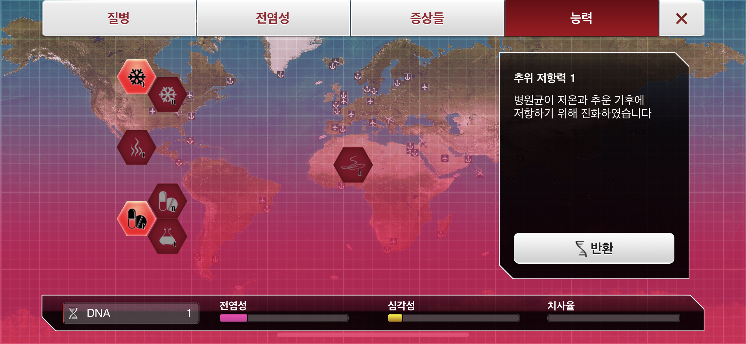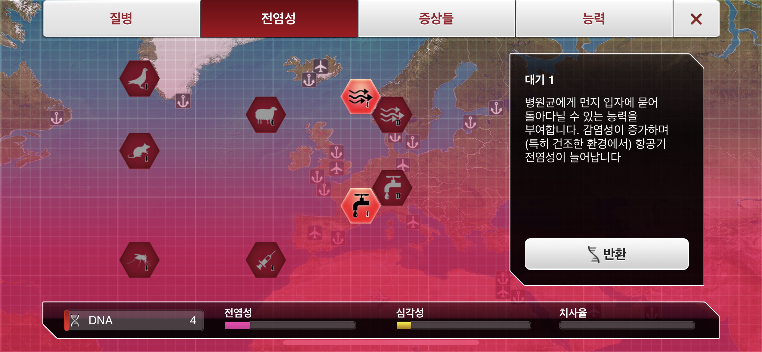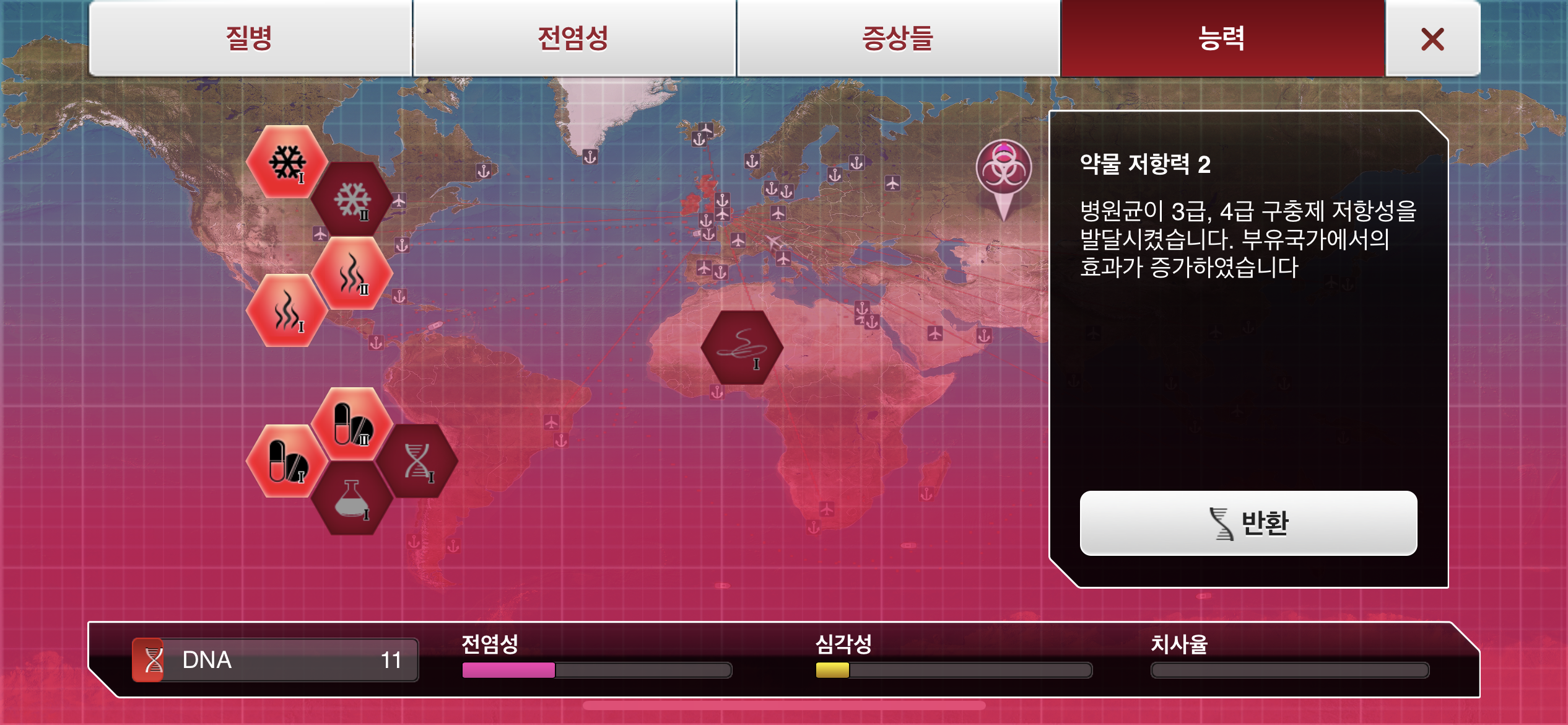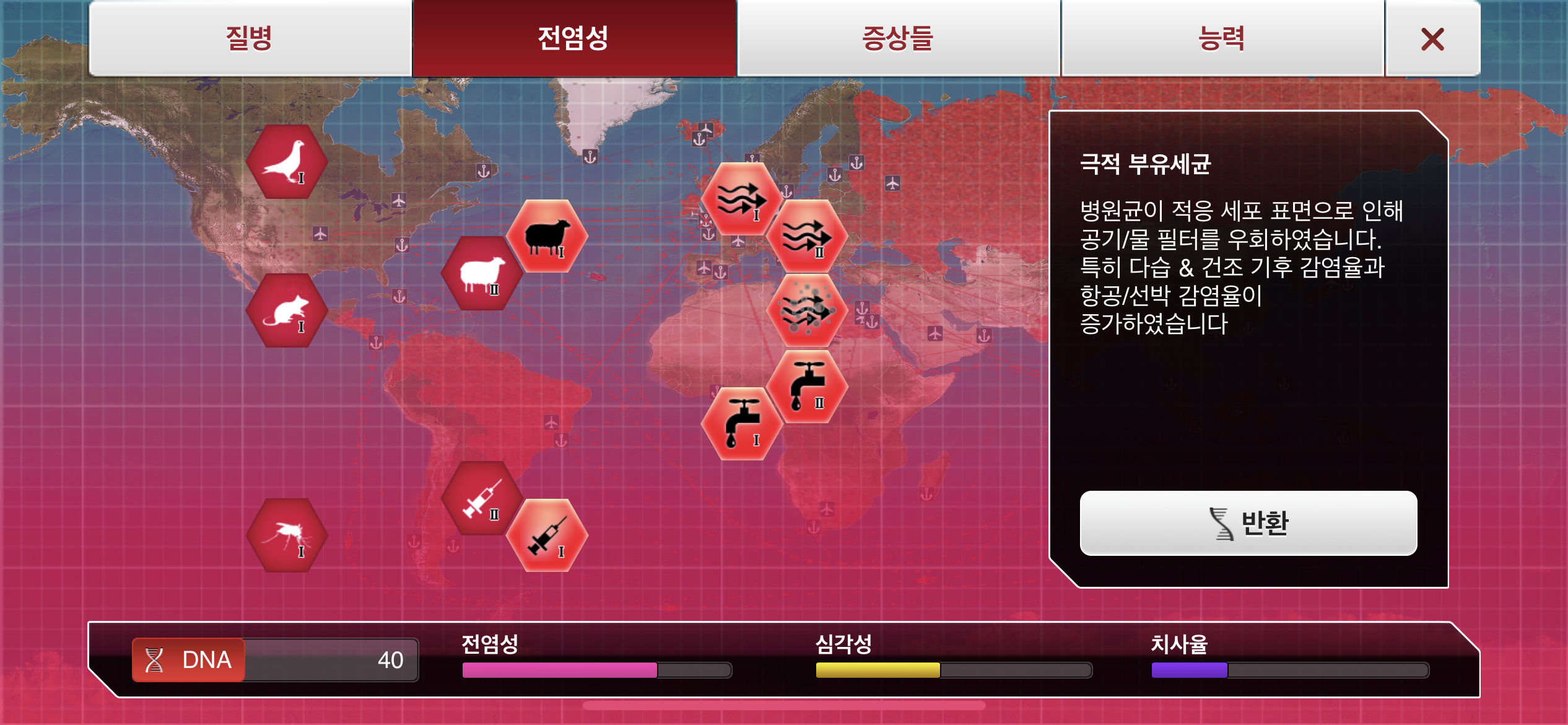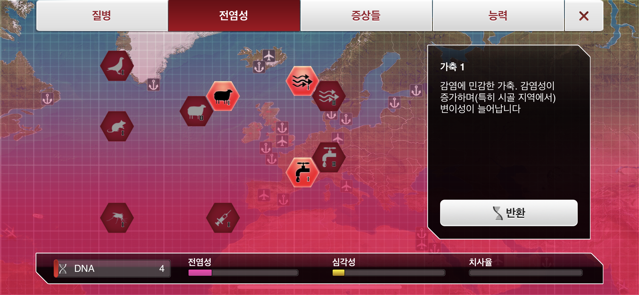 6. DNA 포인트가 모이는대로 물1, 대기1, 가축1, 약물 저항력1 순으로 진화합니다.