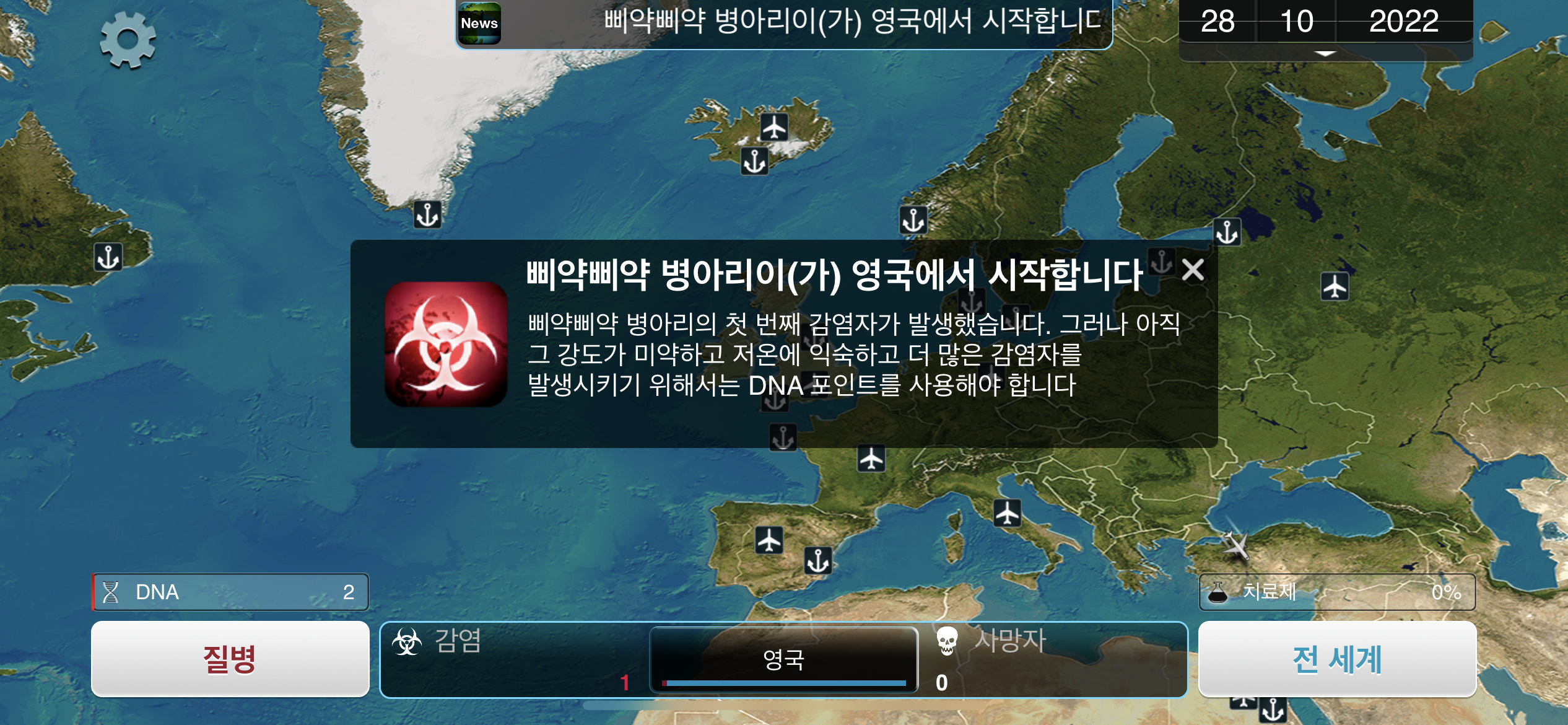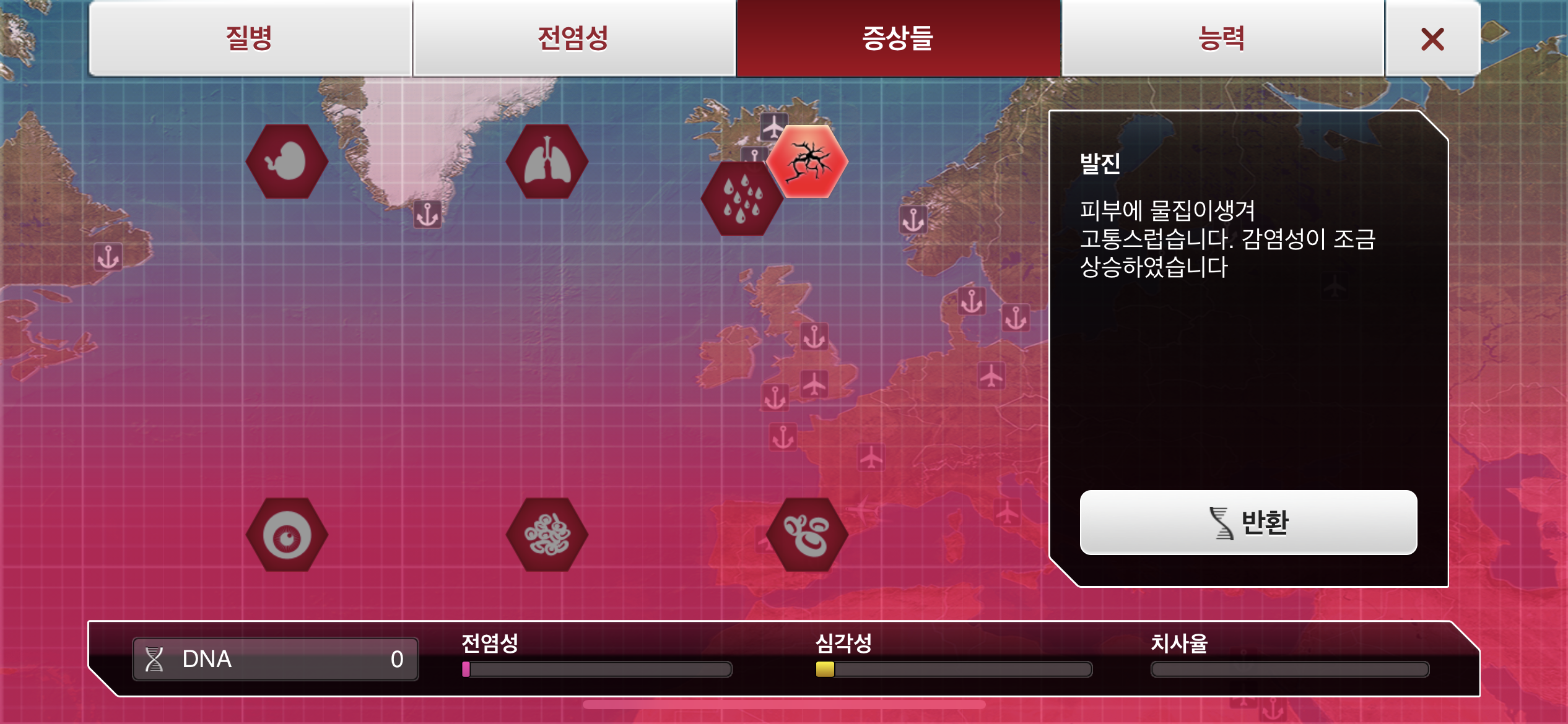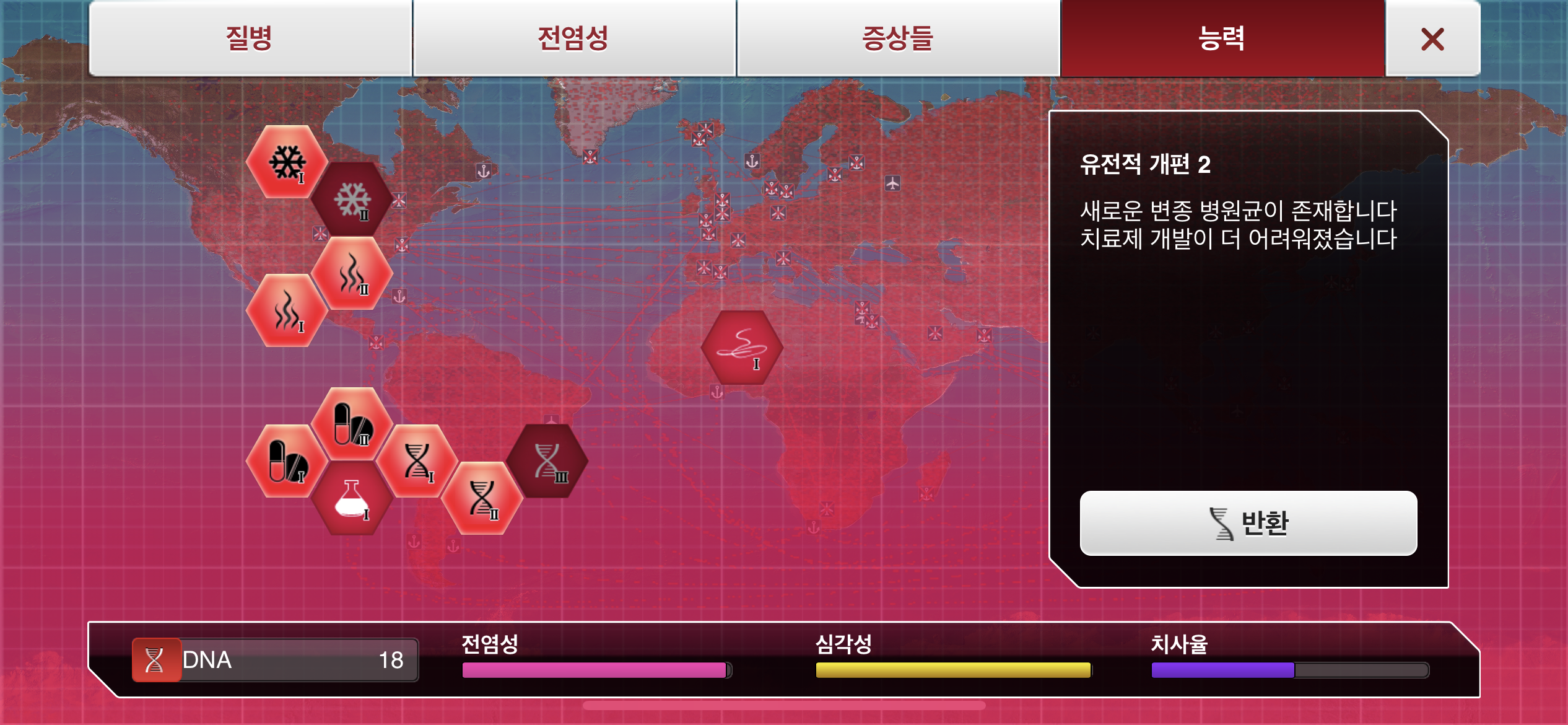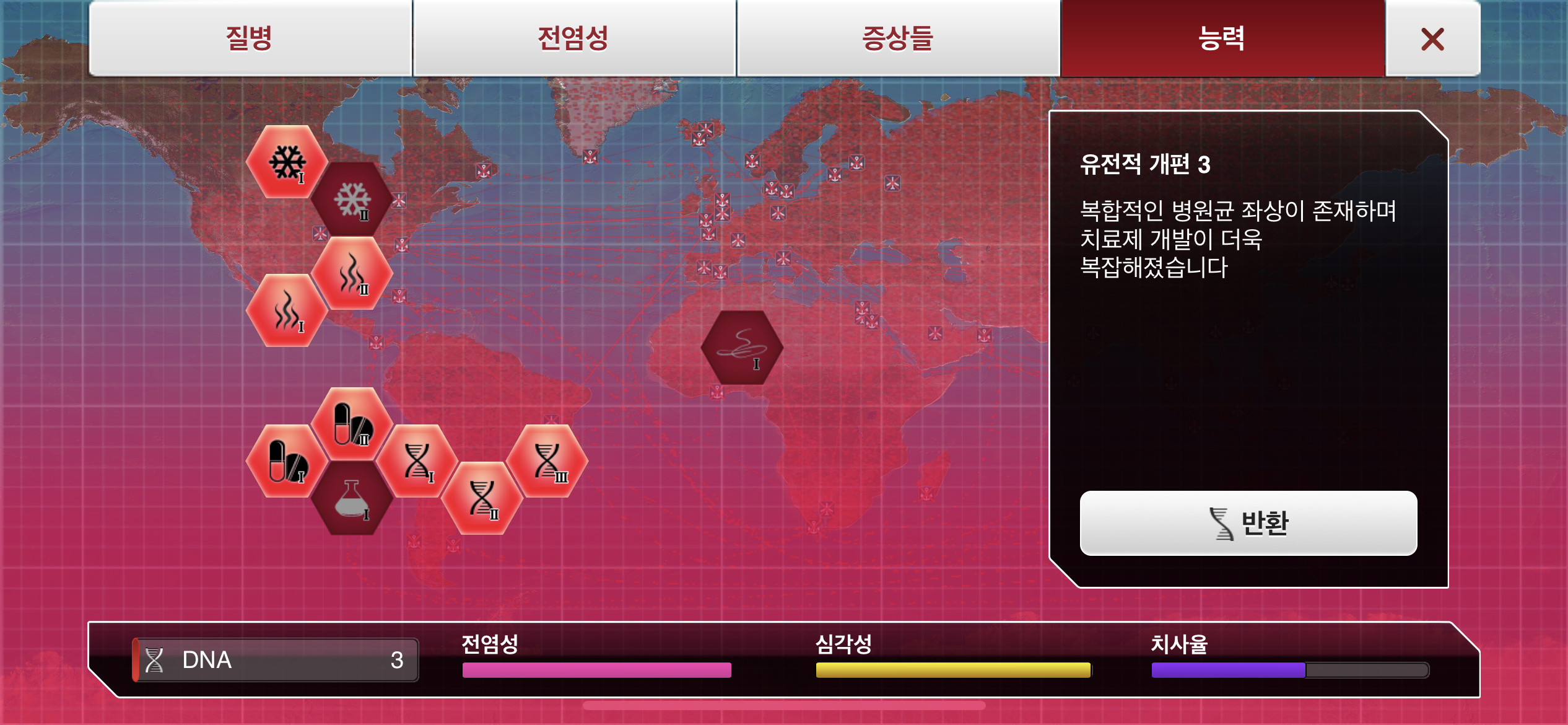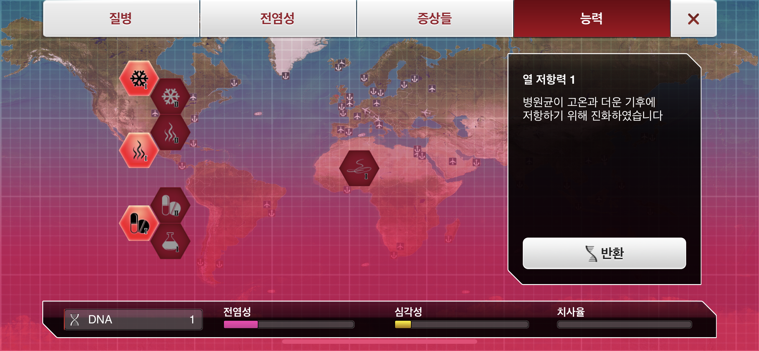 6. DNA 포인트가 모이는대로 물1, 대기1, 가축1, 약물 저항력1 순으로 진화합니다.