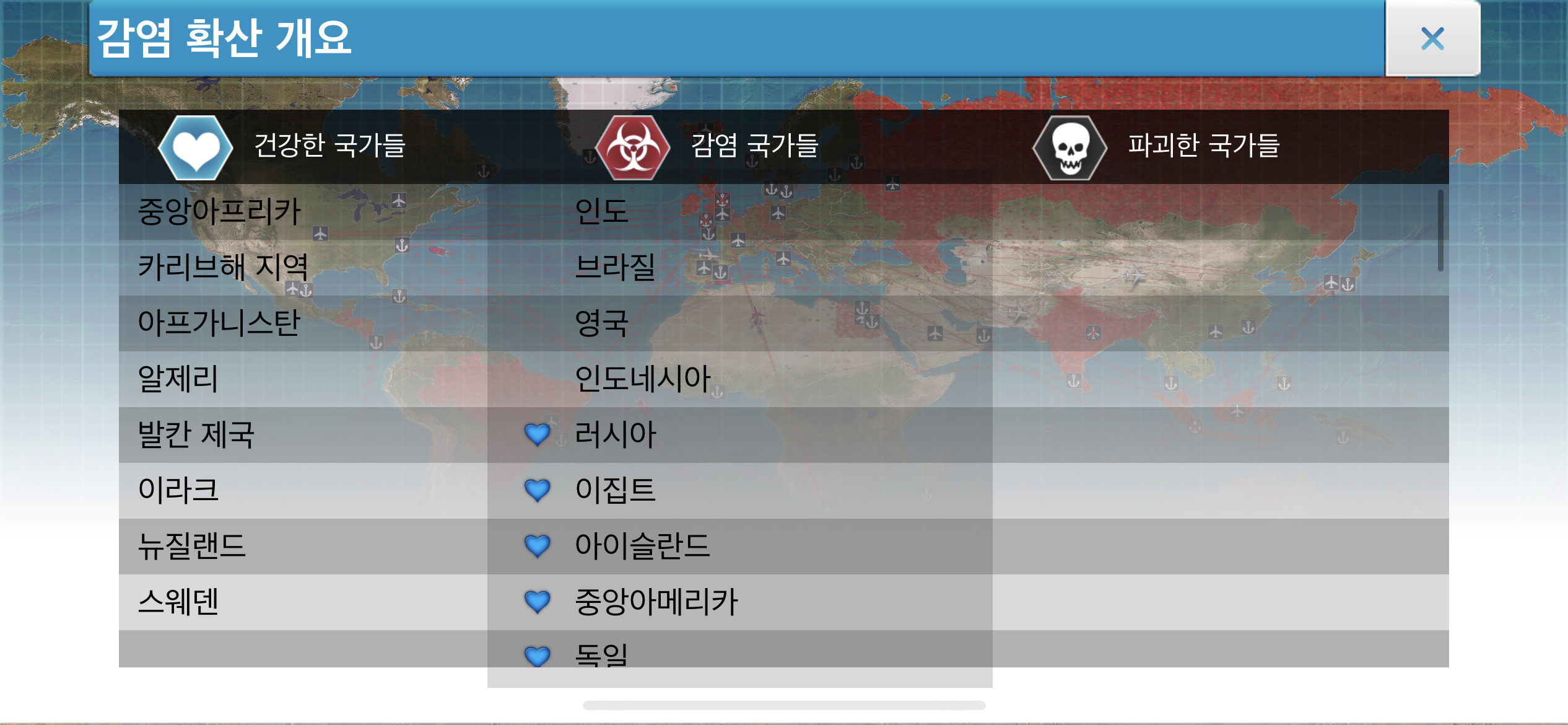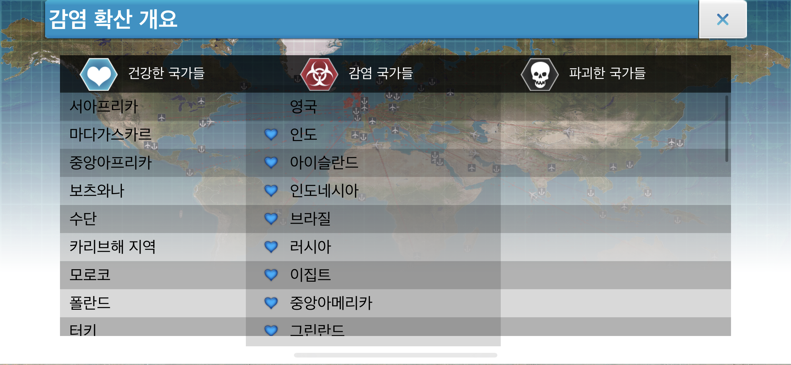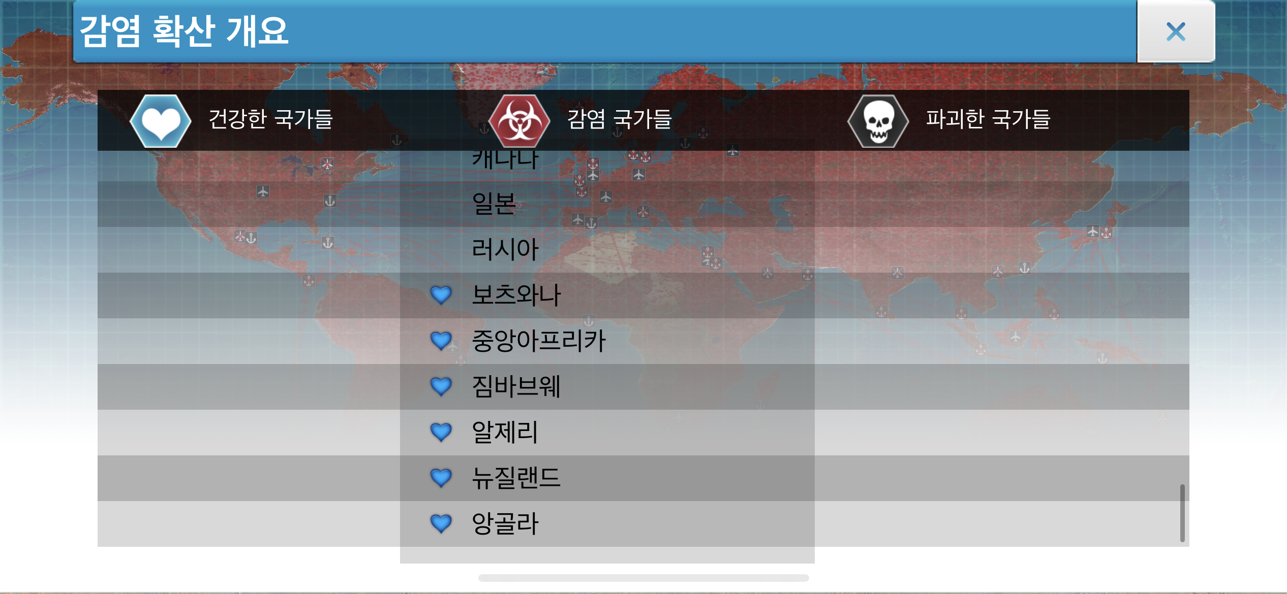 34. 감염 국가들 목록 가장 아래를 확인하면 건강한(감염되지 않은) 사람들이 남아있는 국가를 확인할 수 있습니다. 뉴질랜드를 제외한 몇몇 아프리카 국가들에 건강한 사람들이 아직 남아있네요.
