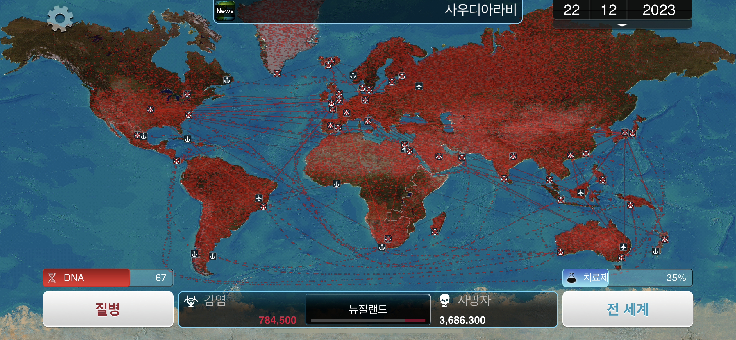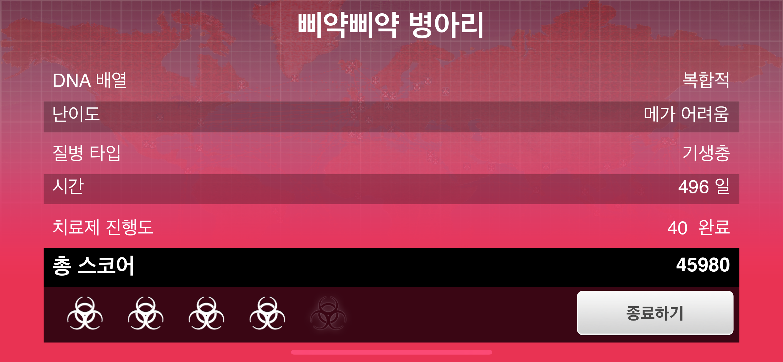 변이가 잘 진행된 경우에는 조금 더 높은 스코어로 클리어가 가능합니다. 기생충의 시작 국가를 사우디아라비아로 선택해서도 클리어가 가능함을 확인했습니다. 다만 이때는 열 저항력과 추위 저항력을 반대로 진화해야 합니다.