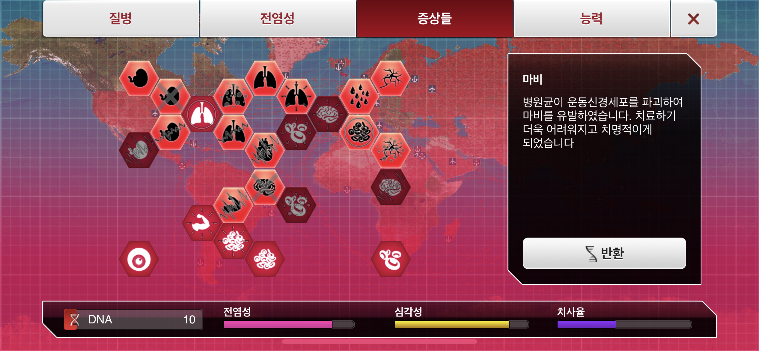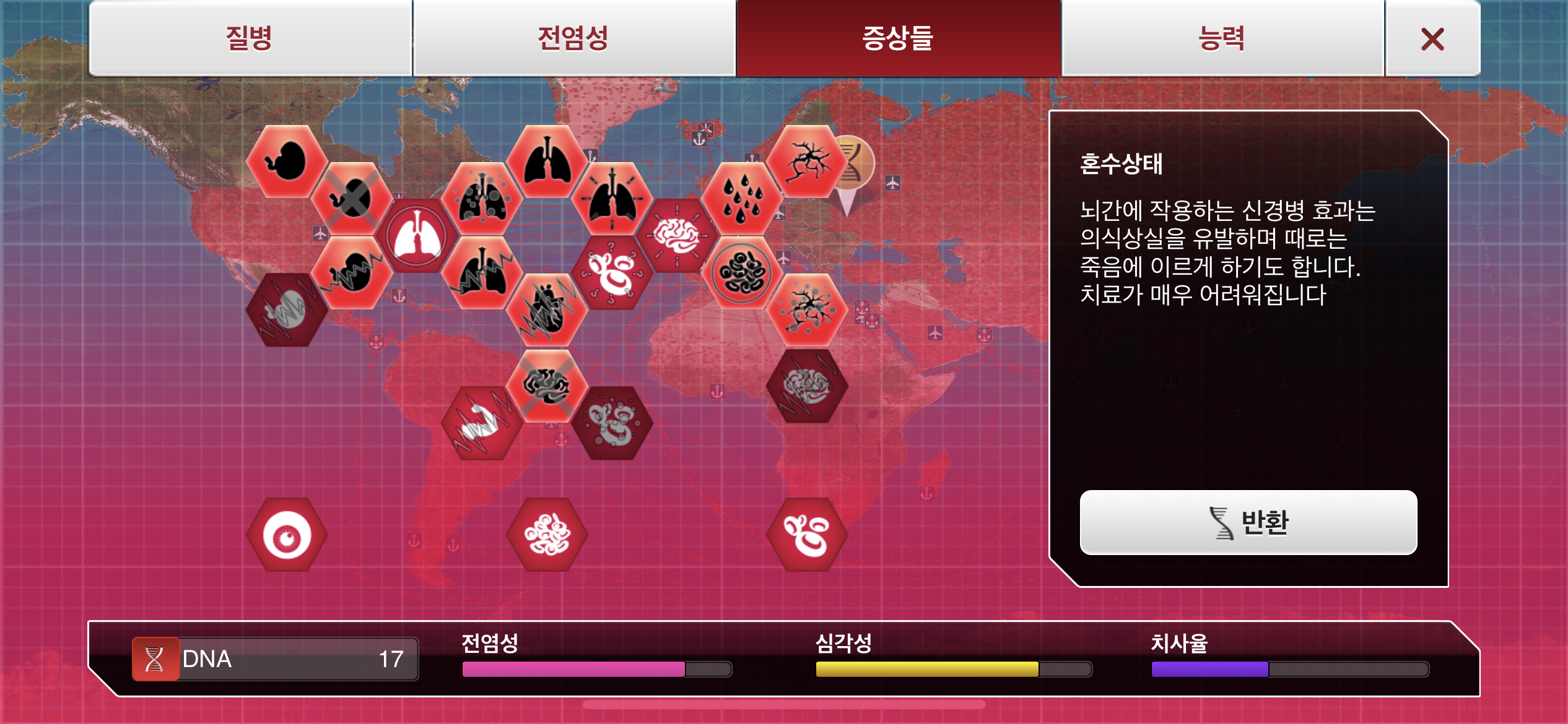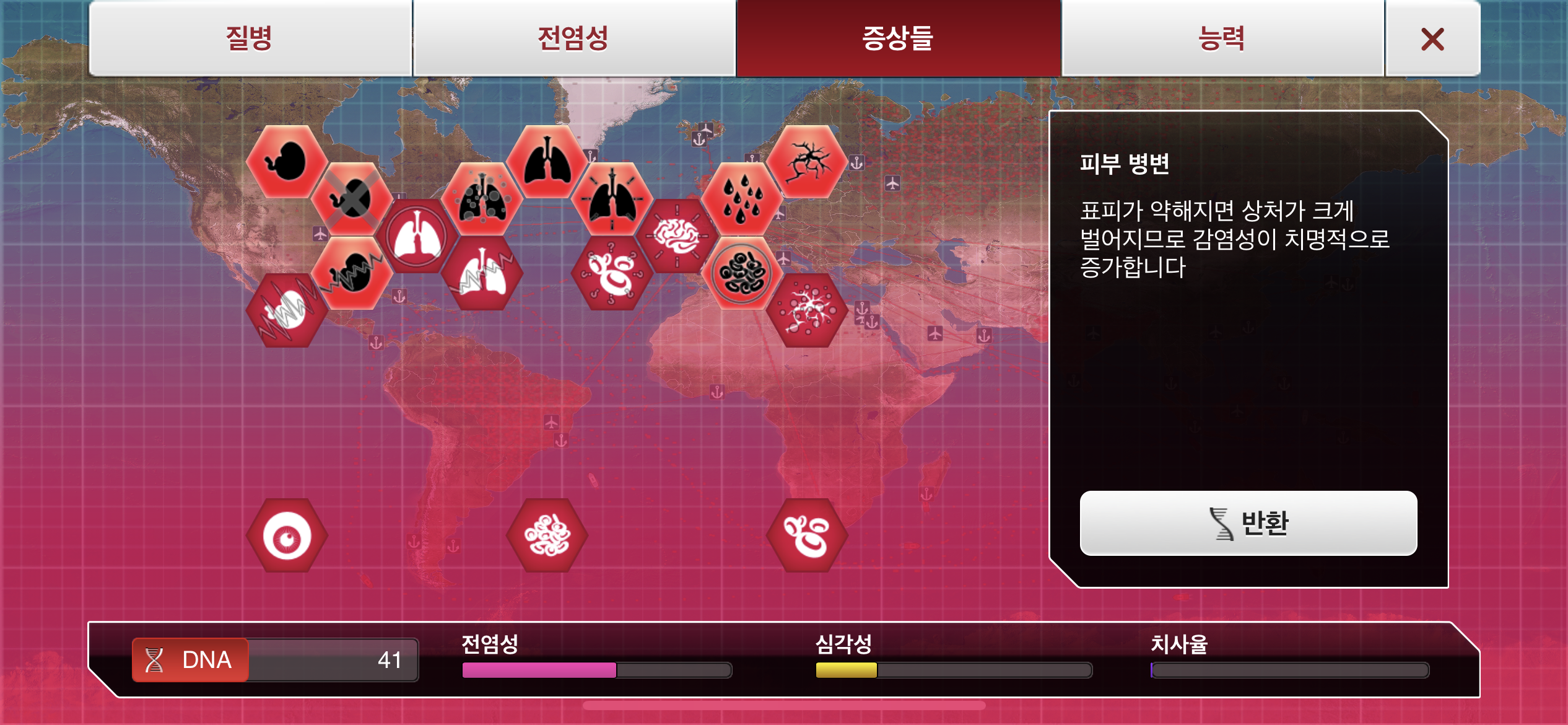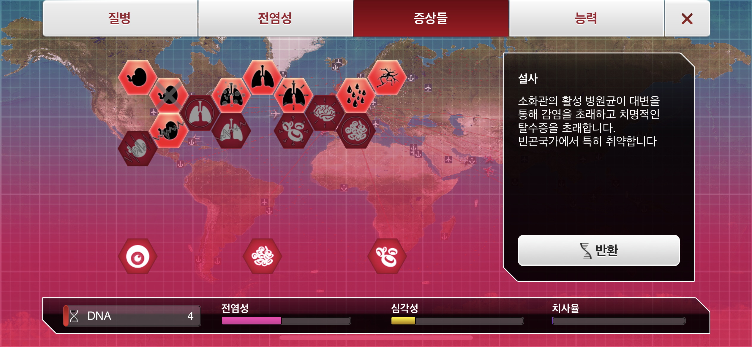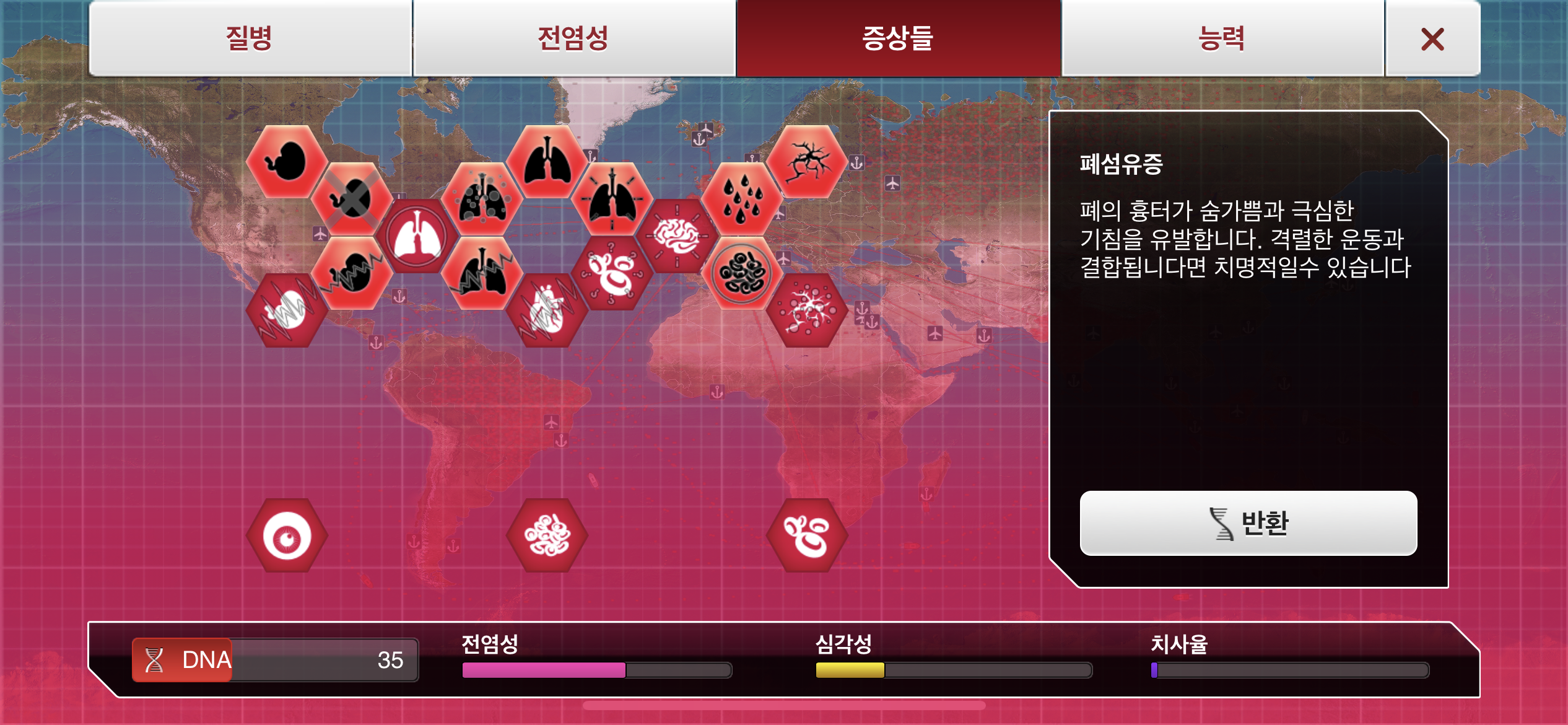 4. 기침-폐렴 증상과 땀흘림 증상까지 DNA 포인트를 사용해 진화 시킵니다.