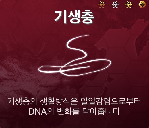 기생충은 주황색 버블을 터뜨려 DNA 포인트를 얻을때, 다른 전염병보다 더 많은 포인트를 획득합니다. 그리고 기생충의 특수 능력인 공생 능력은 발견될 확률이 낮아진다고 하는데, 사실상 메가 어려움(메가 브루탈) 난이도에서는 차이가 없습니다.. 특수 능력인 공생에 낚여 DNA 포인트를 절대 투자하지 마세요!!