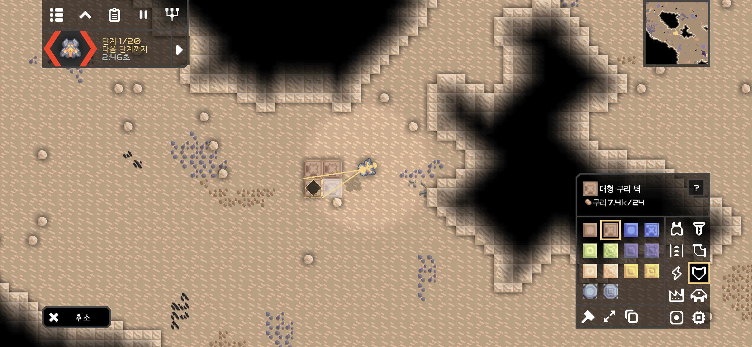 디펜스 라인과 아군 코어의 중간위치 정도에 대형 구리 벽을 네 개 건설하여 폴리를 끌어옵니다.