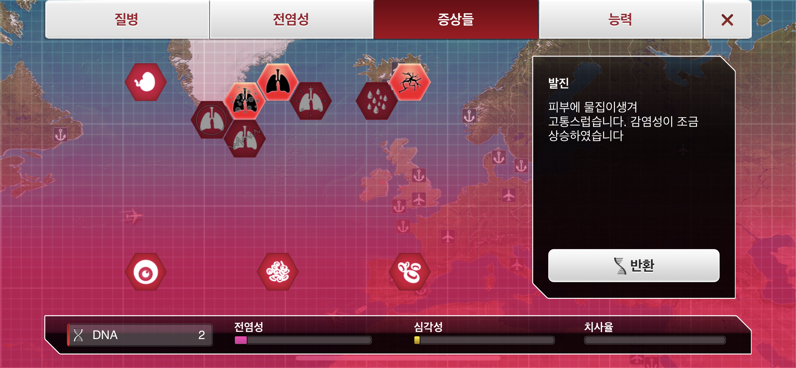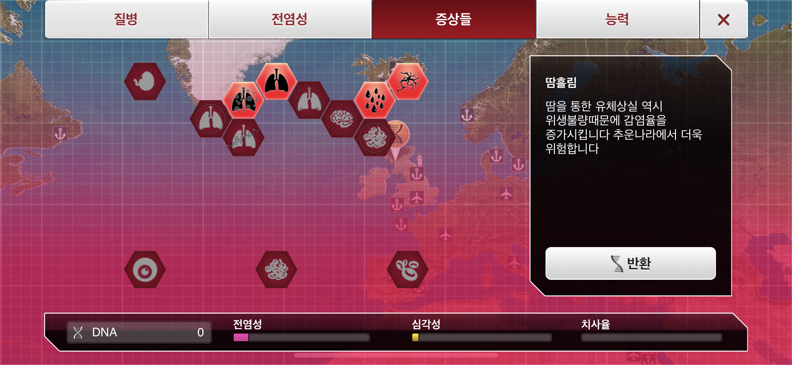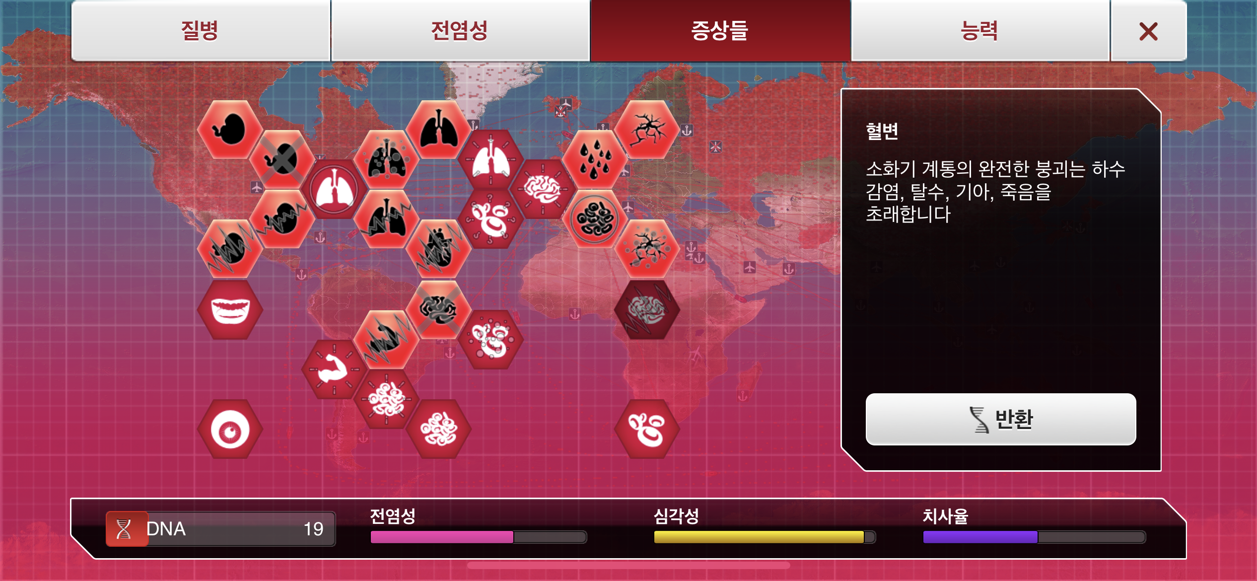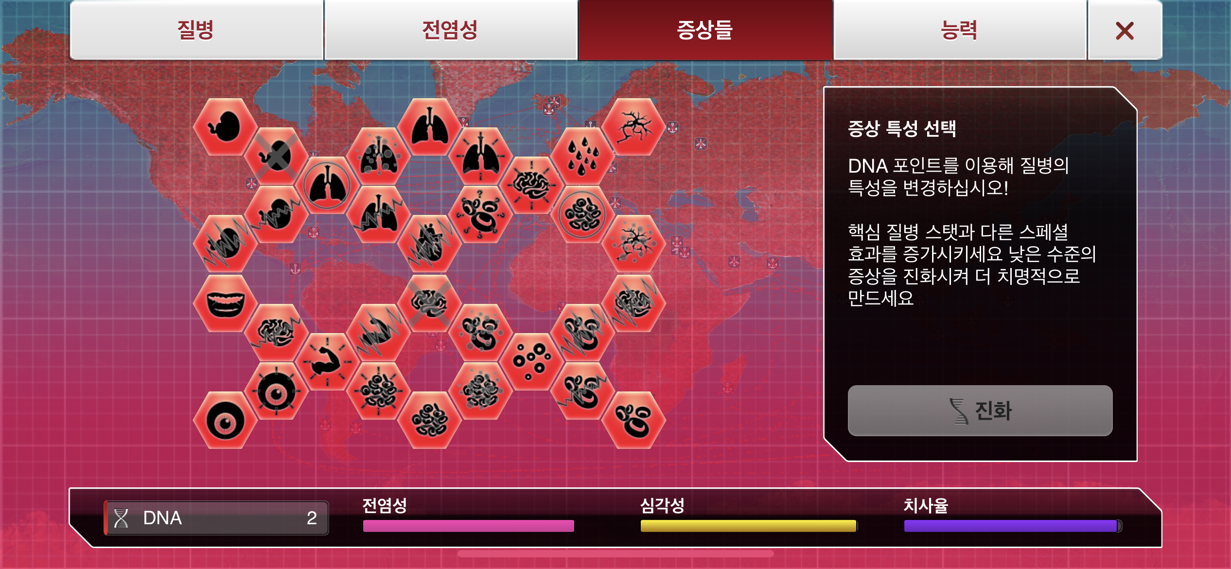 24. 슬슬 치명적인 증상을 미리 준비할 시간입니다. DNA 포인트가 모이는대로 총체적 장기부전 증상을 진화합니다!