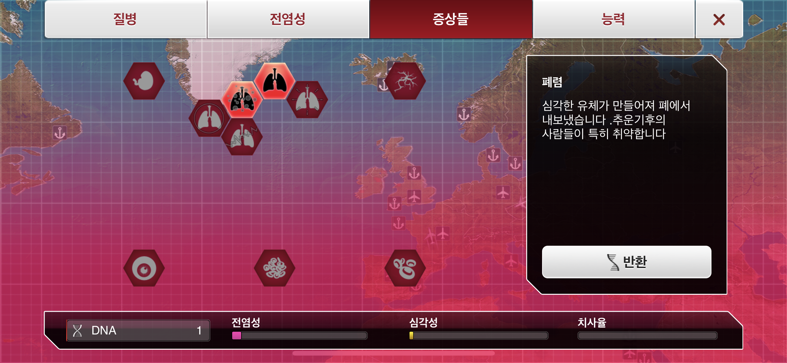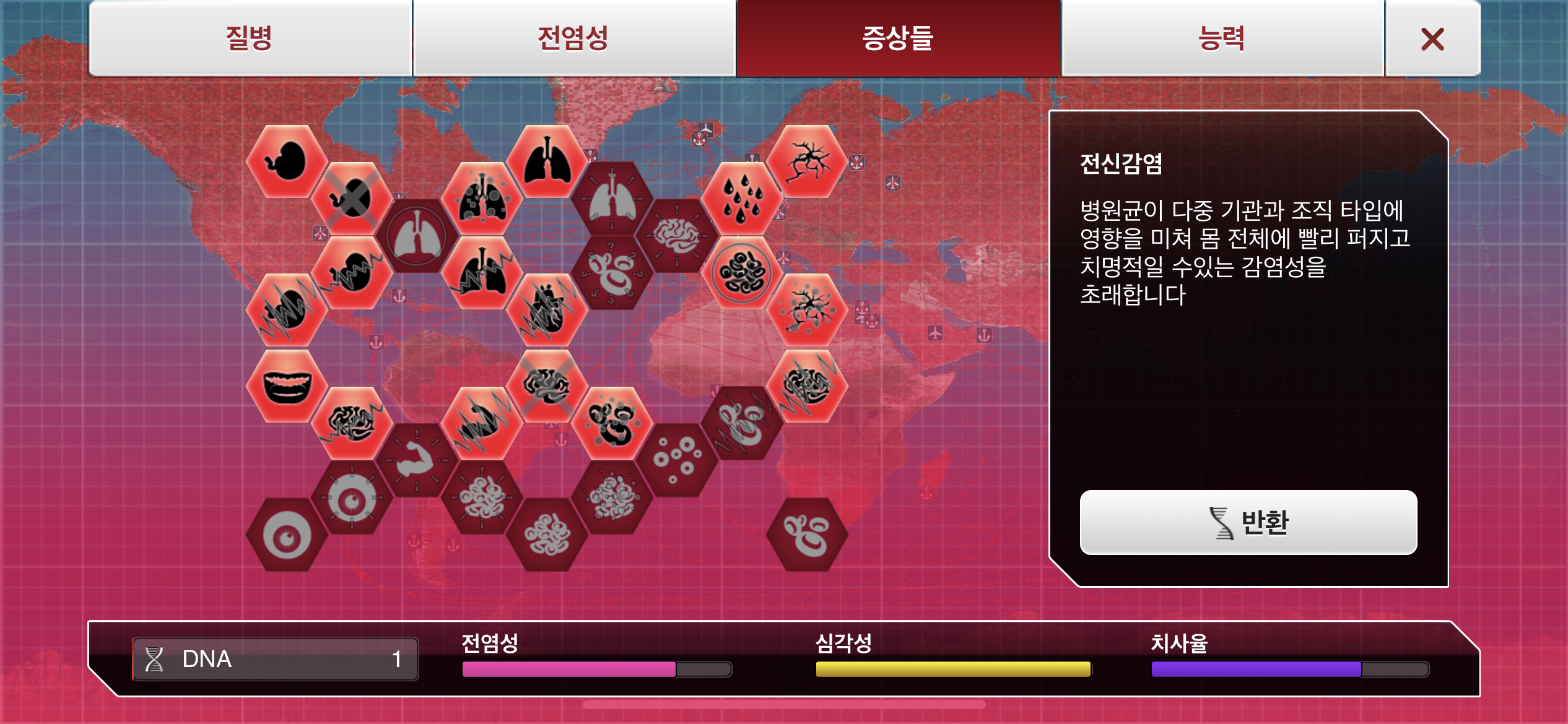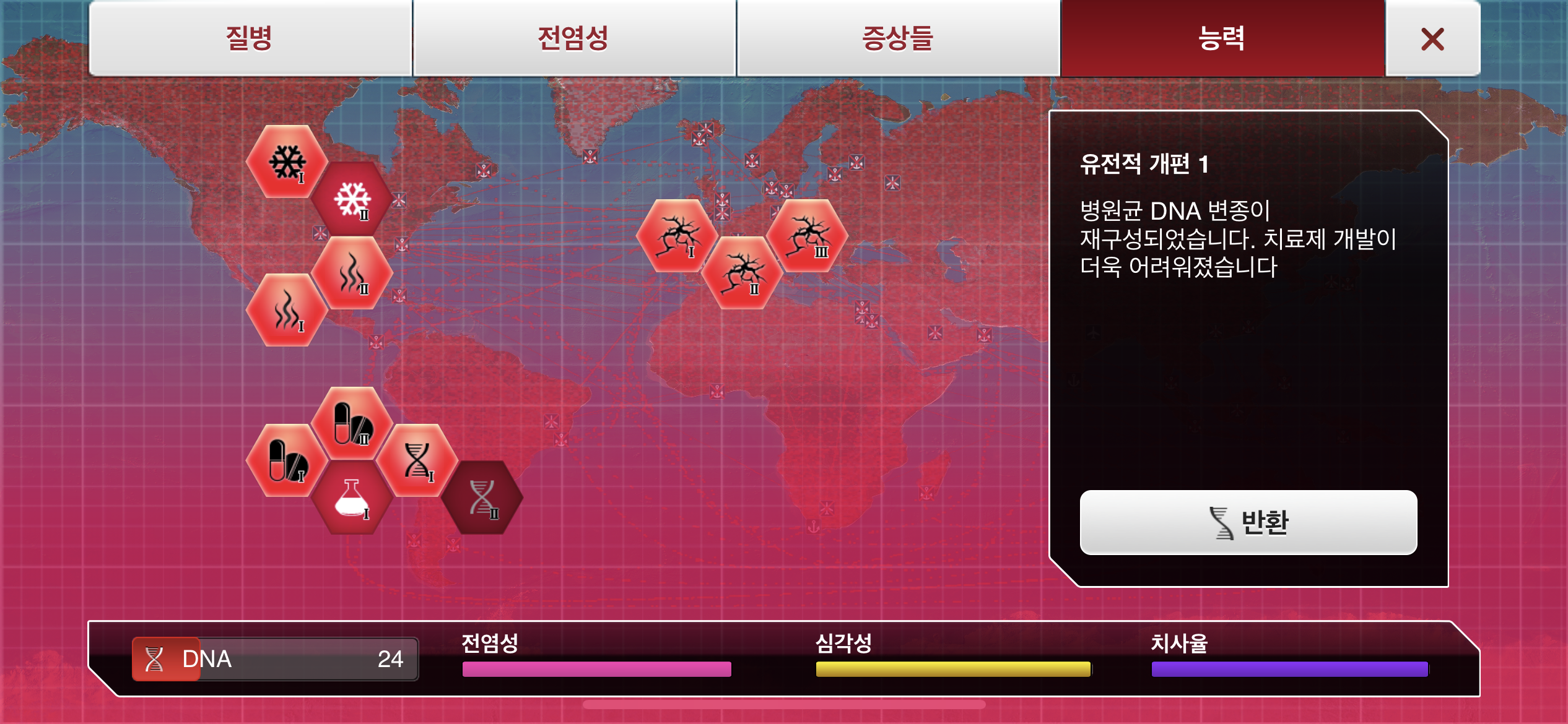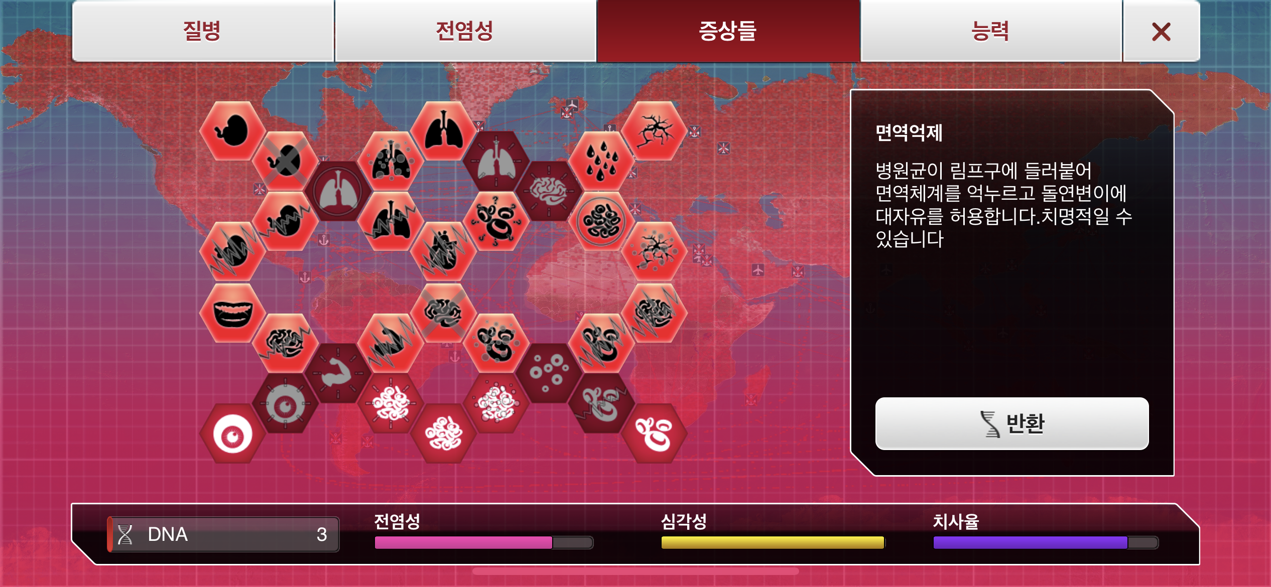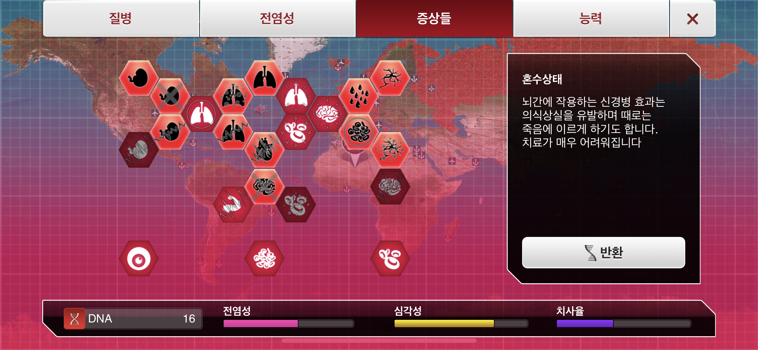 24. 슬슬 치명적인 증상을 미리 준비할 시간입니다. DNA 포인트가 모이는대로 총체적 장기부전 증상을 진화합니다!