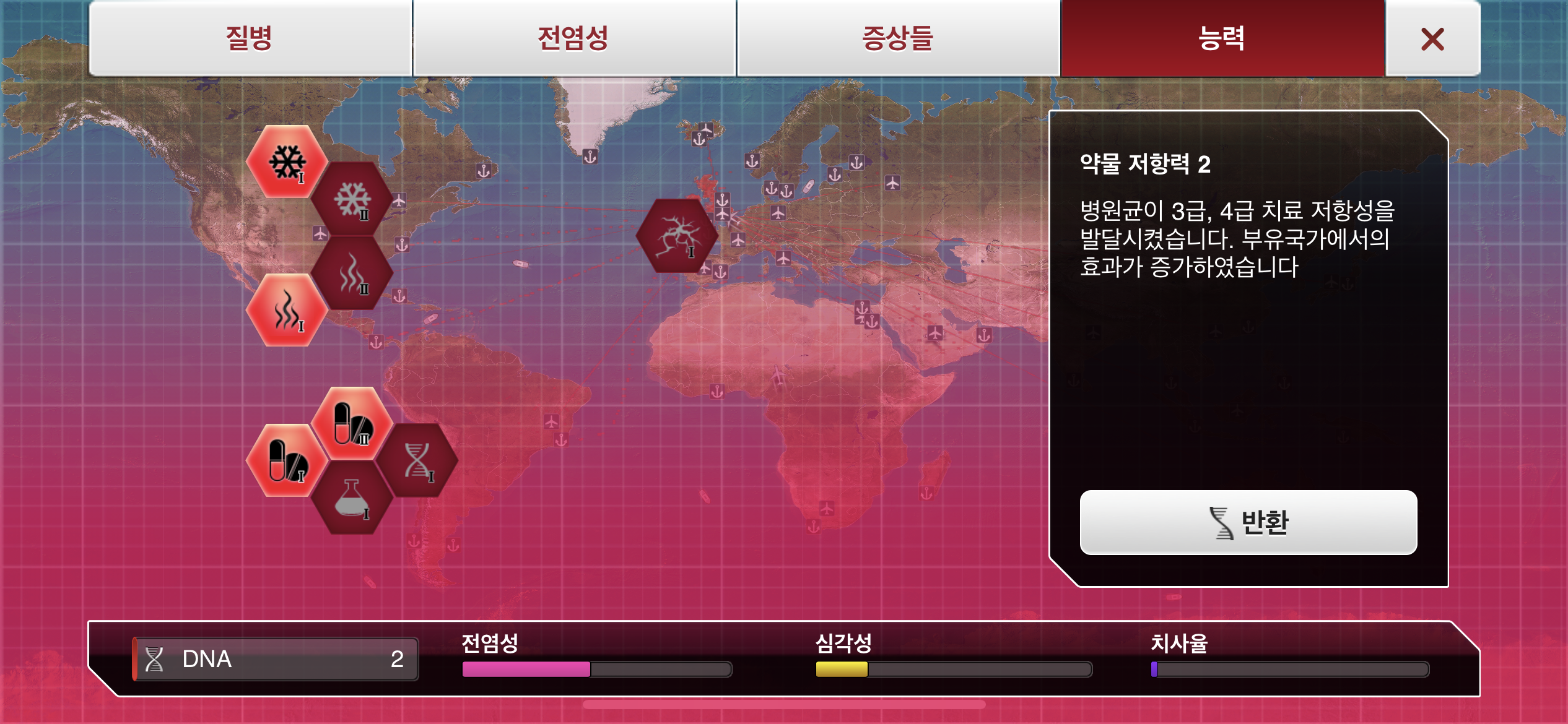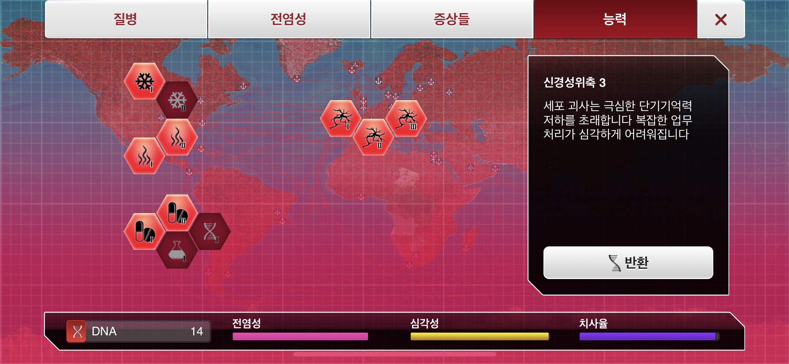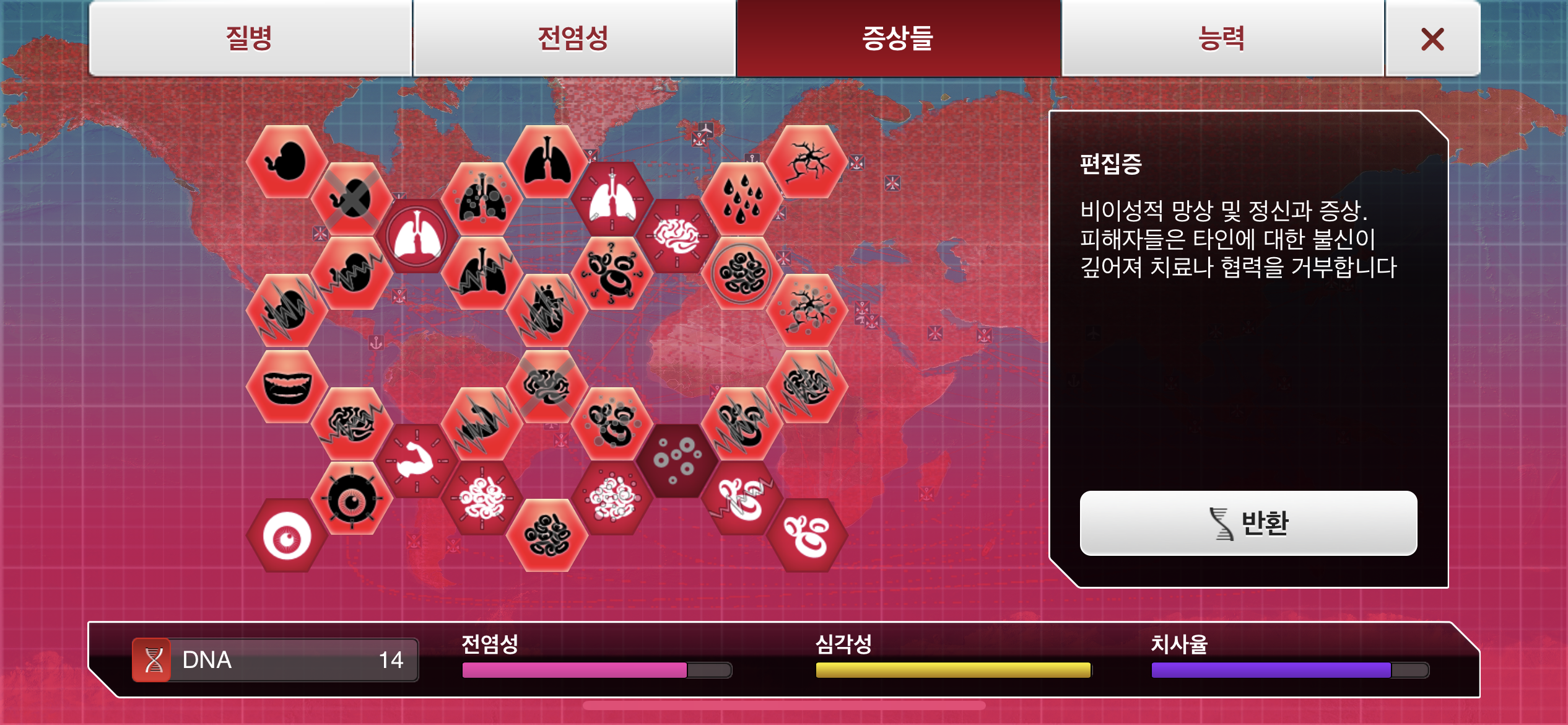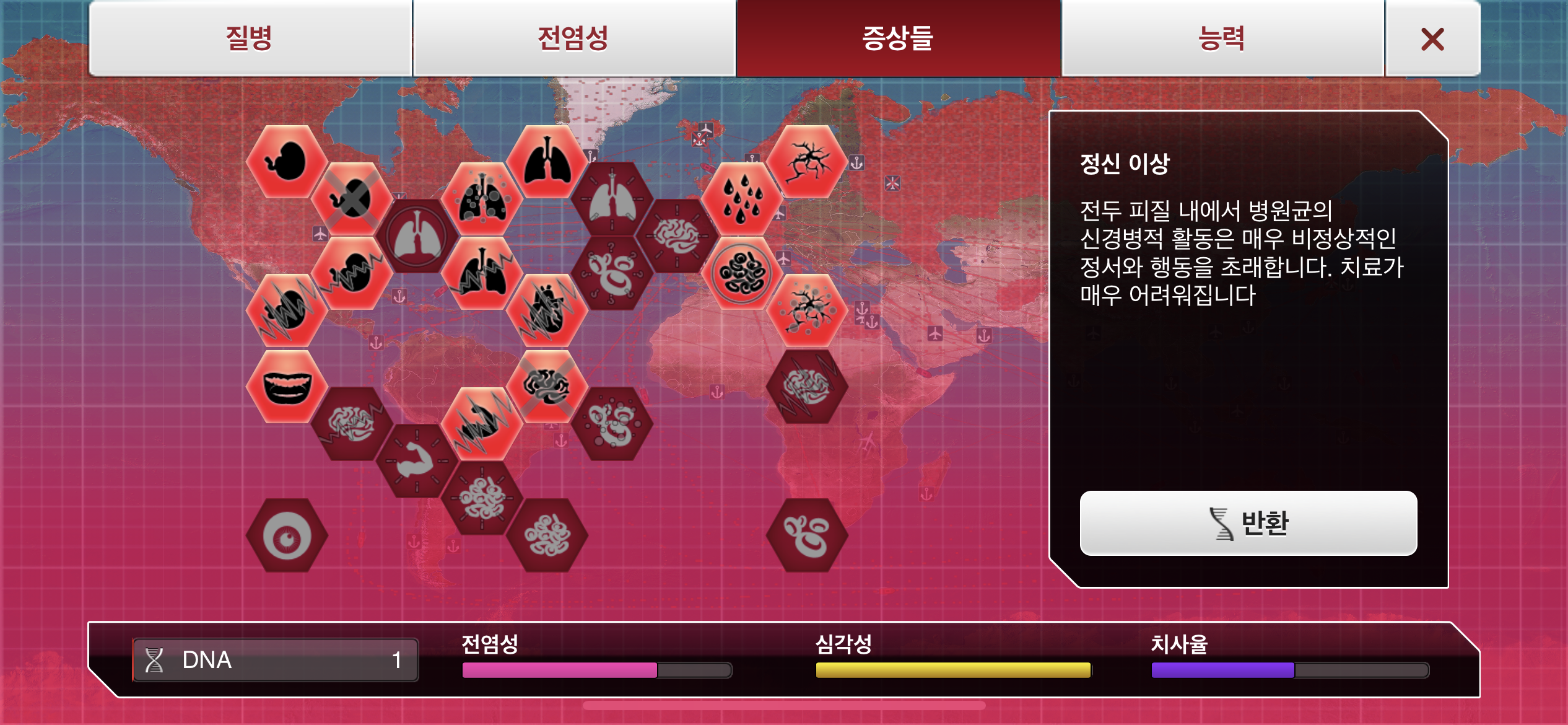 24. 슬슬 치명적인 증상을 미리 준비할 시간입니다. DNA 포인트가 모이는대로 총체적 장기부전 증상을 진화합니다!