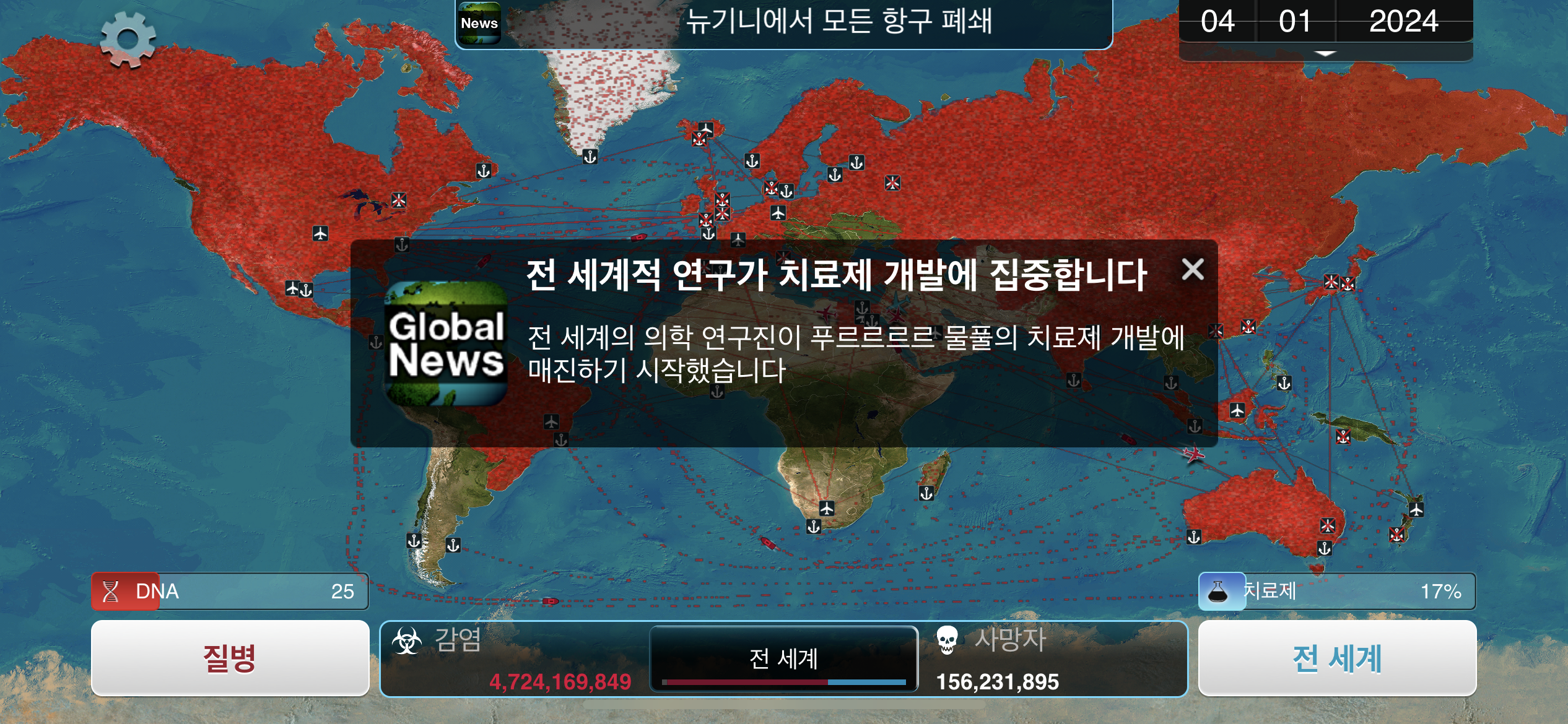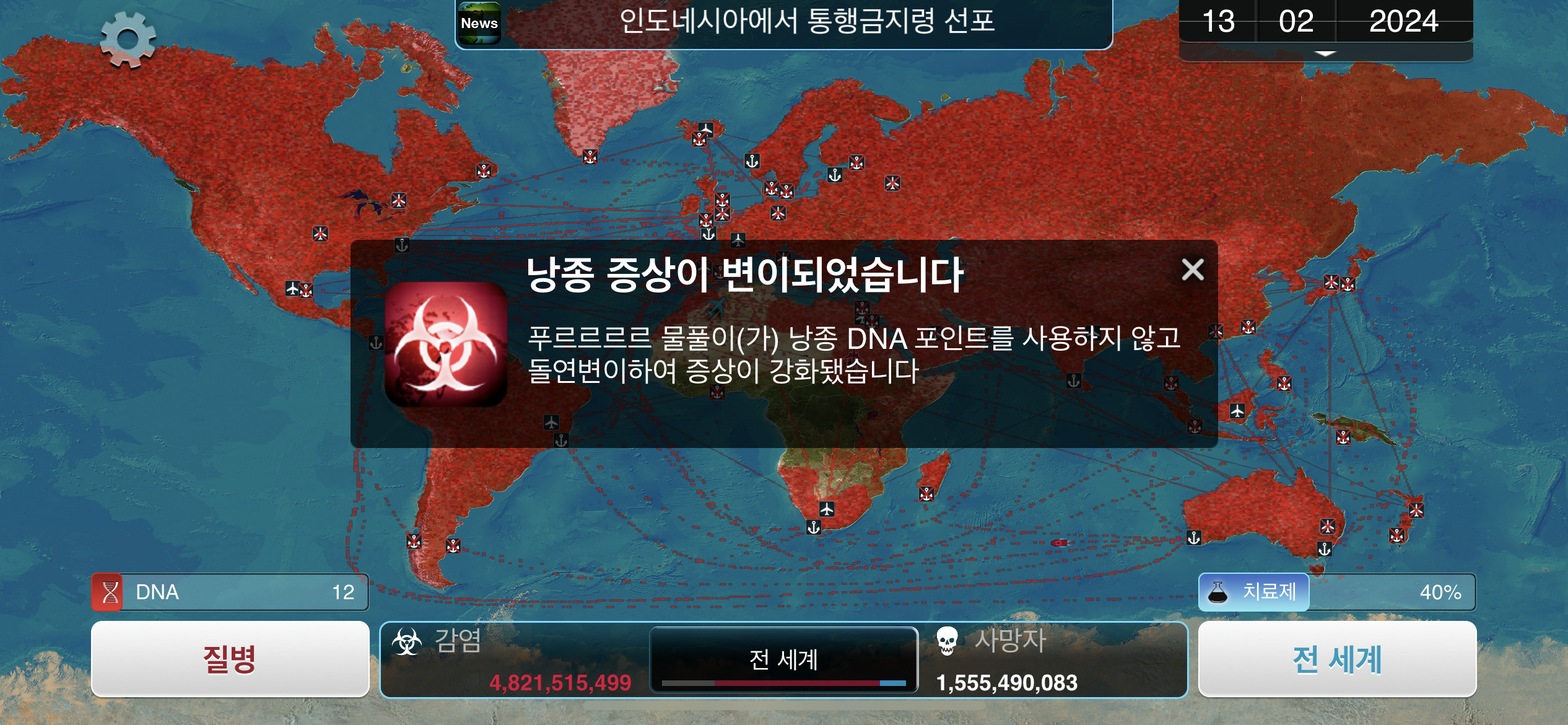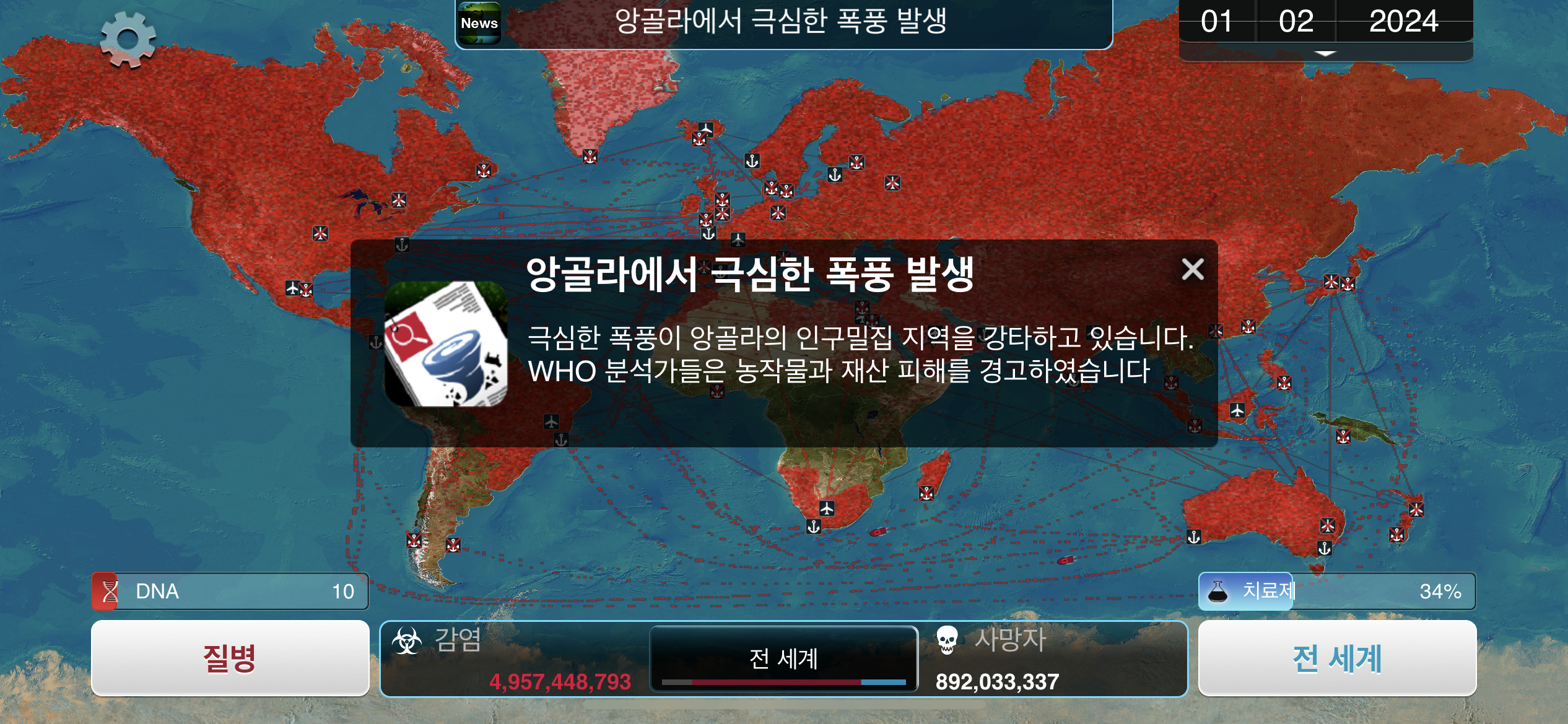 33. 2024년 1월 10일. 사망자 수가 점점 늘어감에 따라 붕괴되는 국가들이 생기기 시작합니다. 이후 모이는 DNA 포인트로는 모든 증상을 진화하면 됩니다.
