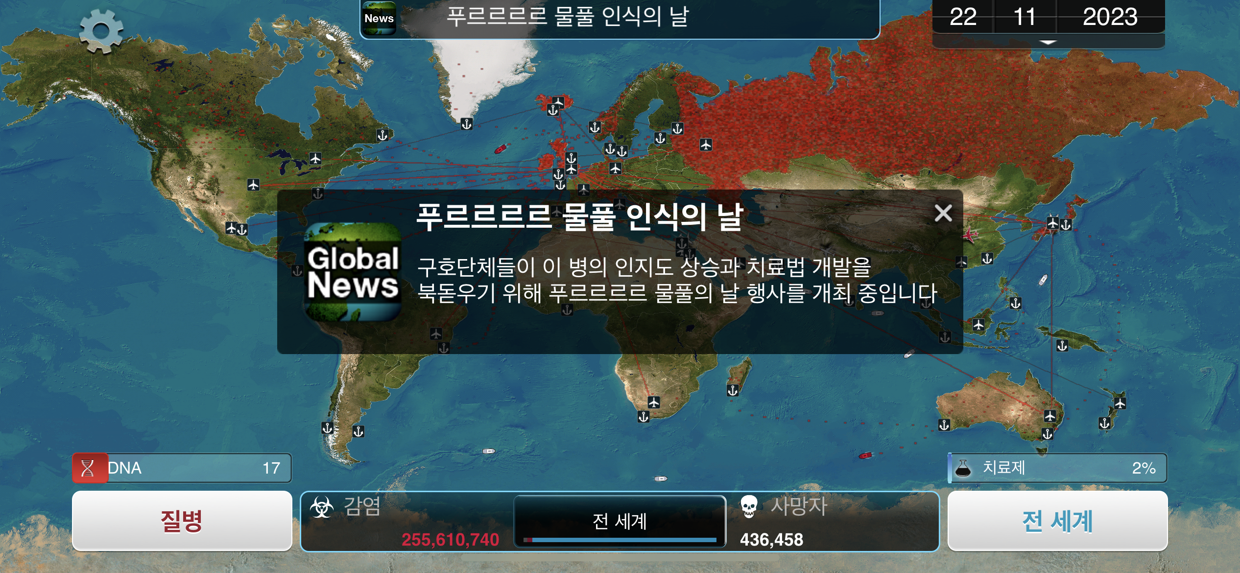 27. 2023년 11월 22일. 푸르르르르 물풀 프리온 인식의 날 행사가 개최됩니다. 세계 인구 2.5억명이 감염되었습니다.