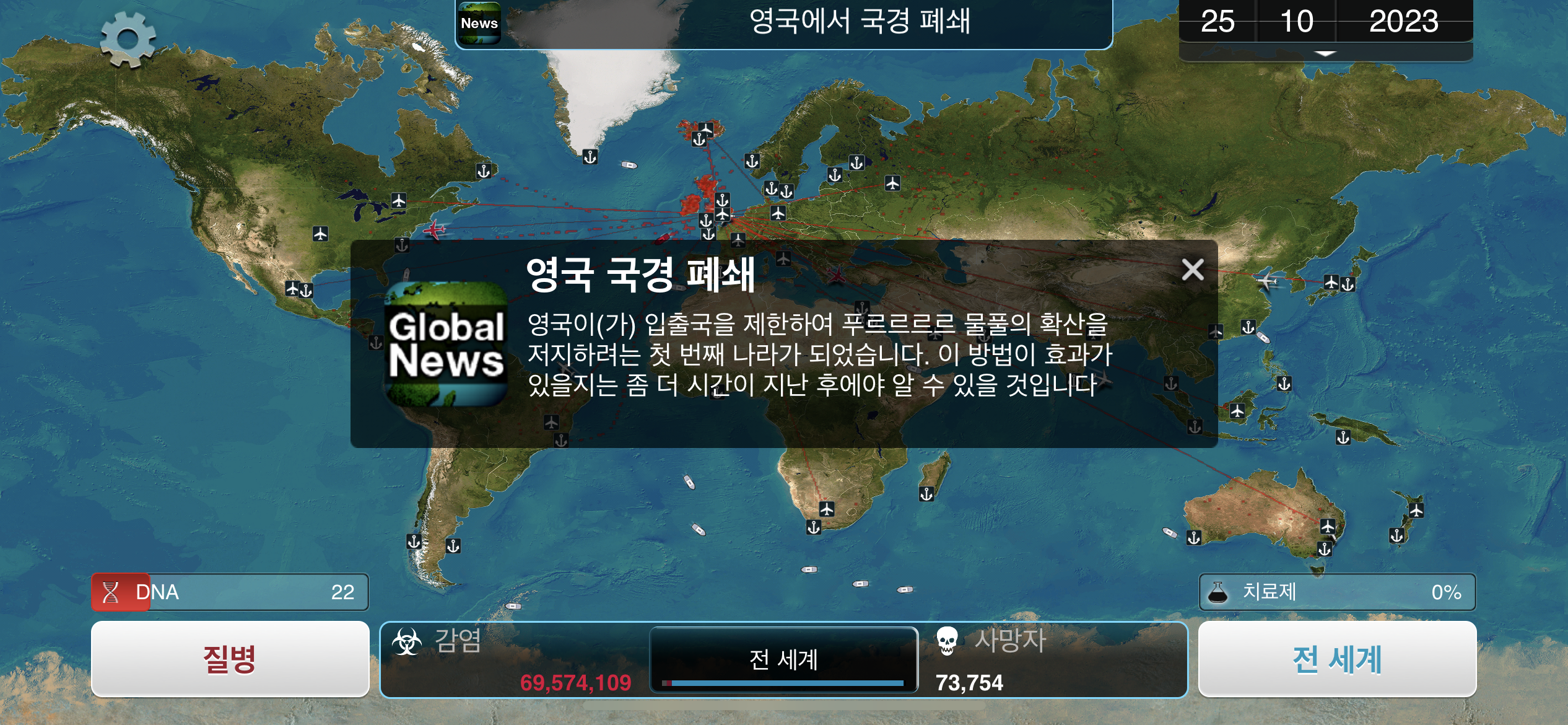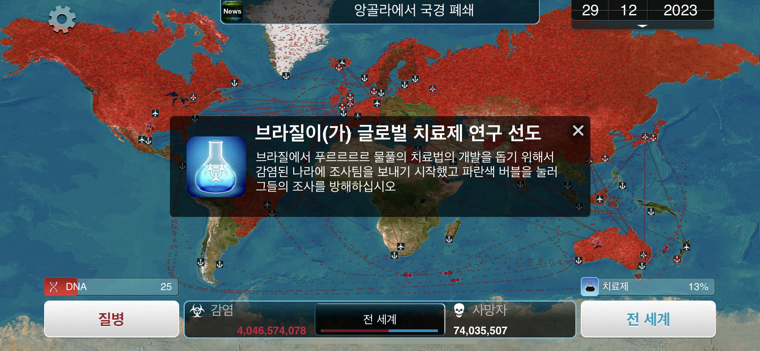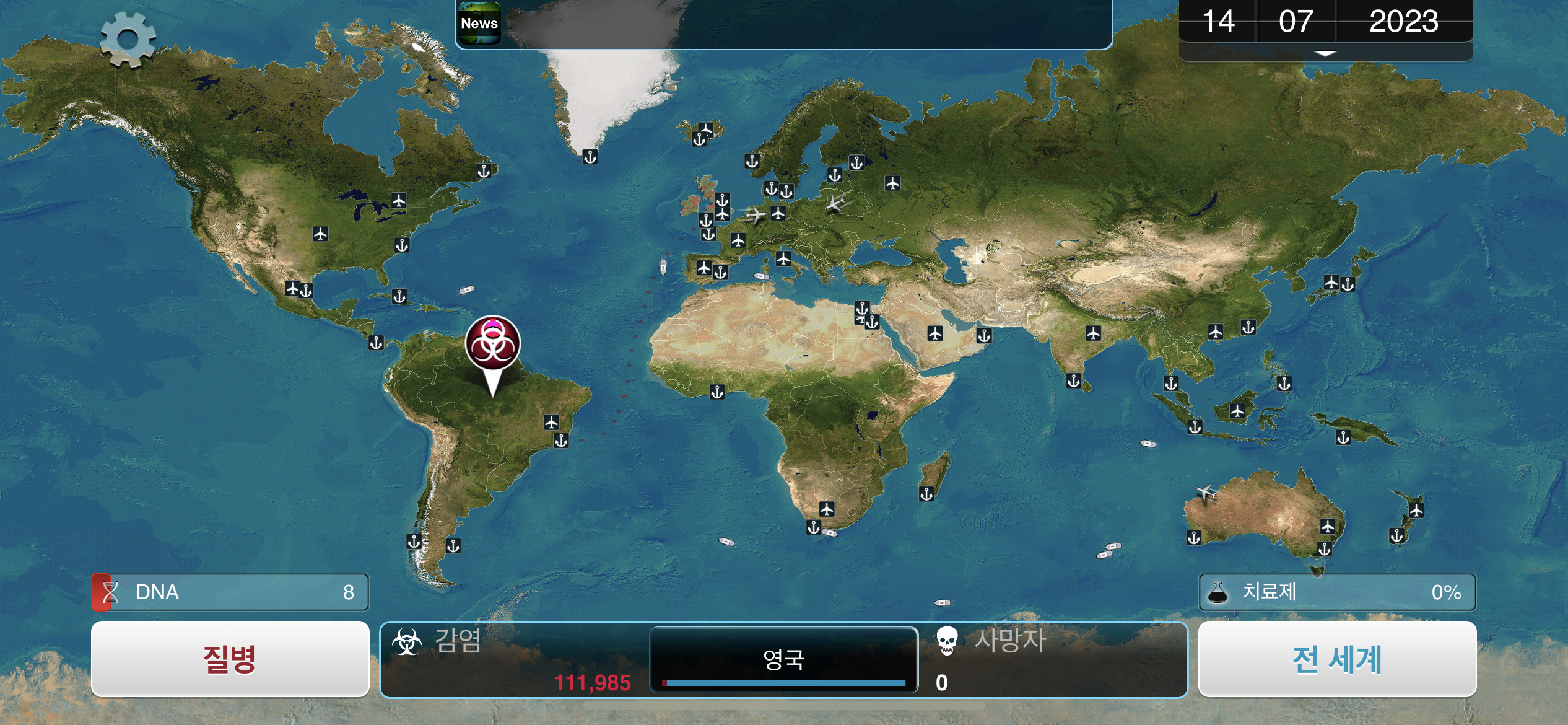 13. 2023년 7월 14일. 푸르르르르 물풀 프리온의 다음 감염국가는 영국에 이어 브라질이 선택되었습니다. 영국의 감염자 수는 11만명.