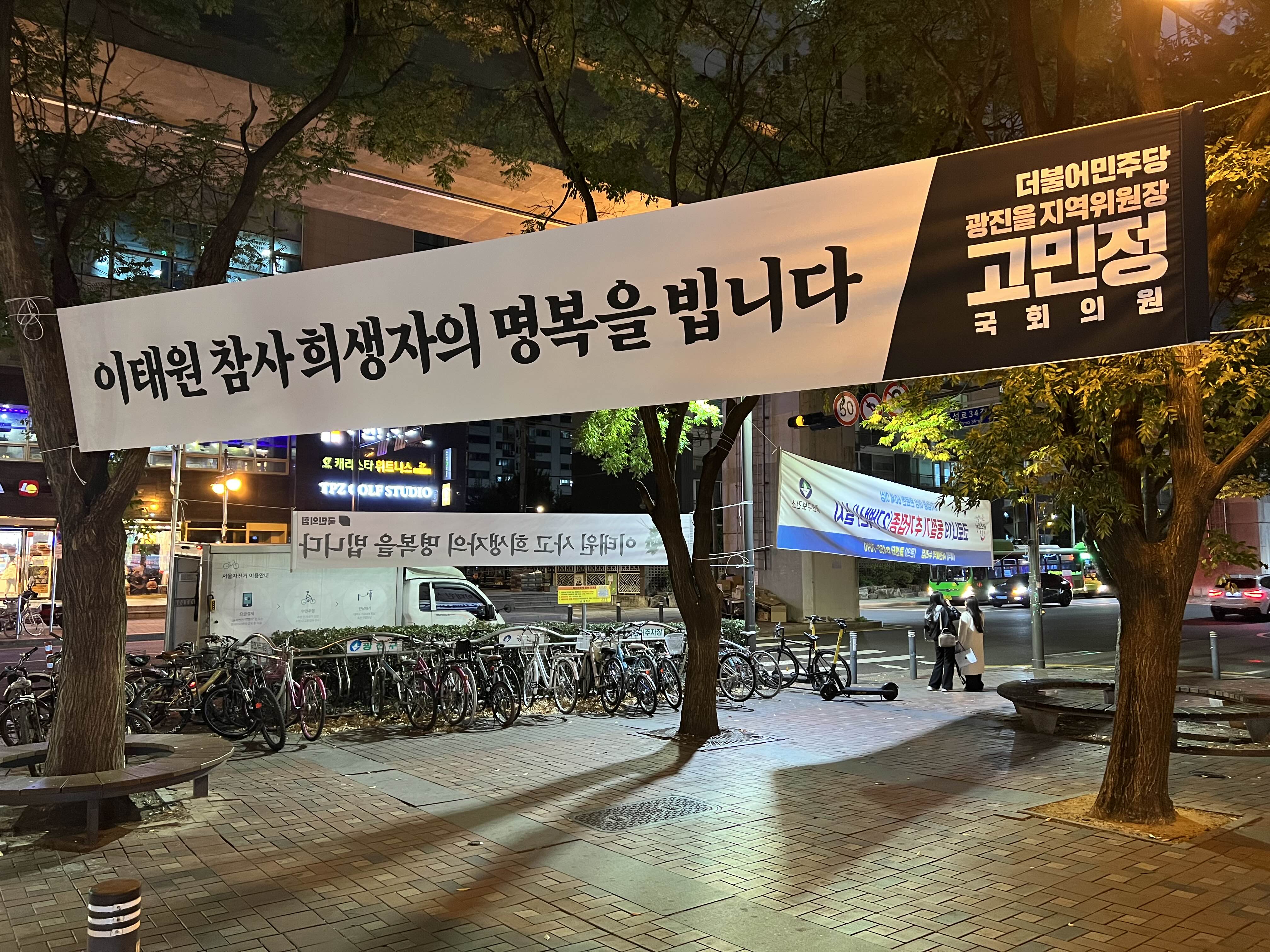 뚝섬유원지역 1번 출구앞 고민정 의원의 현수막이 게시 되었습니다. 이번 이태원 사고로 추모 현수막을 게시했는데요, 저 또한 이 사고로 인한 사망자들의 명복을 빕니다.