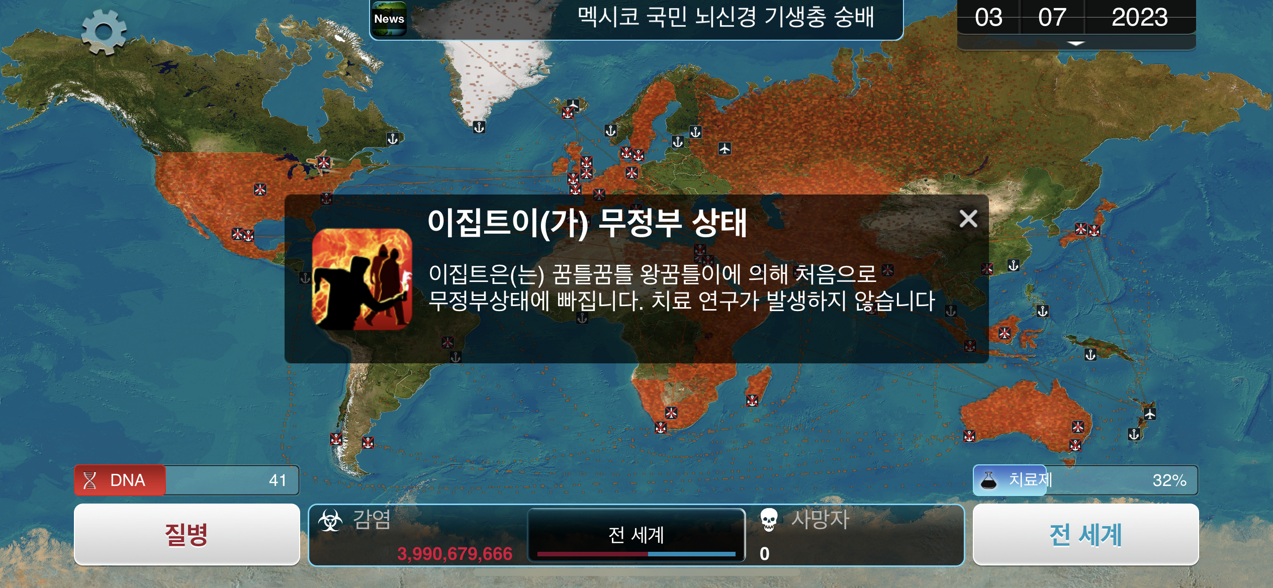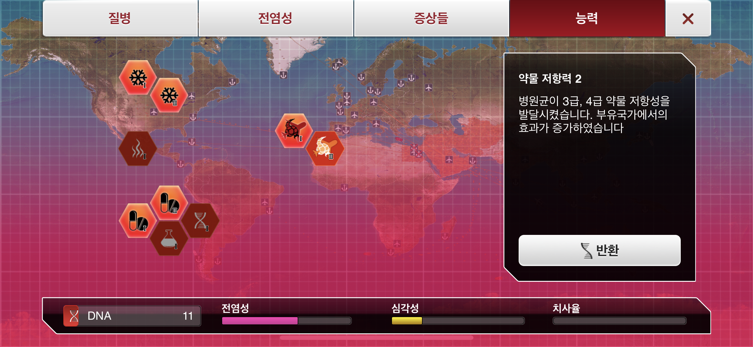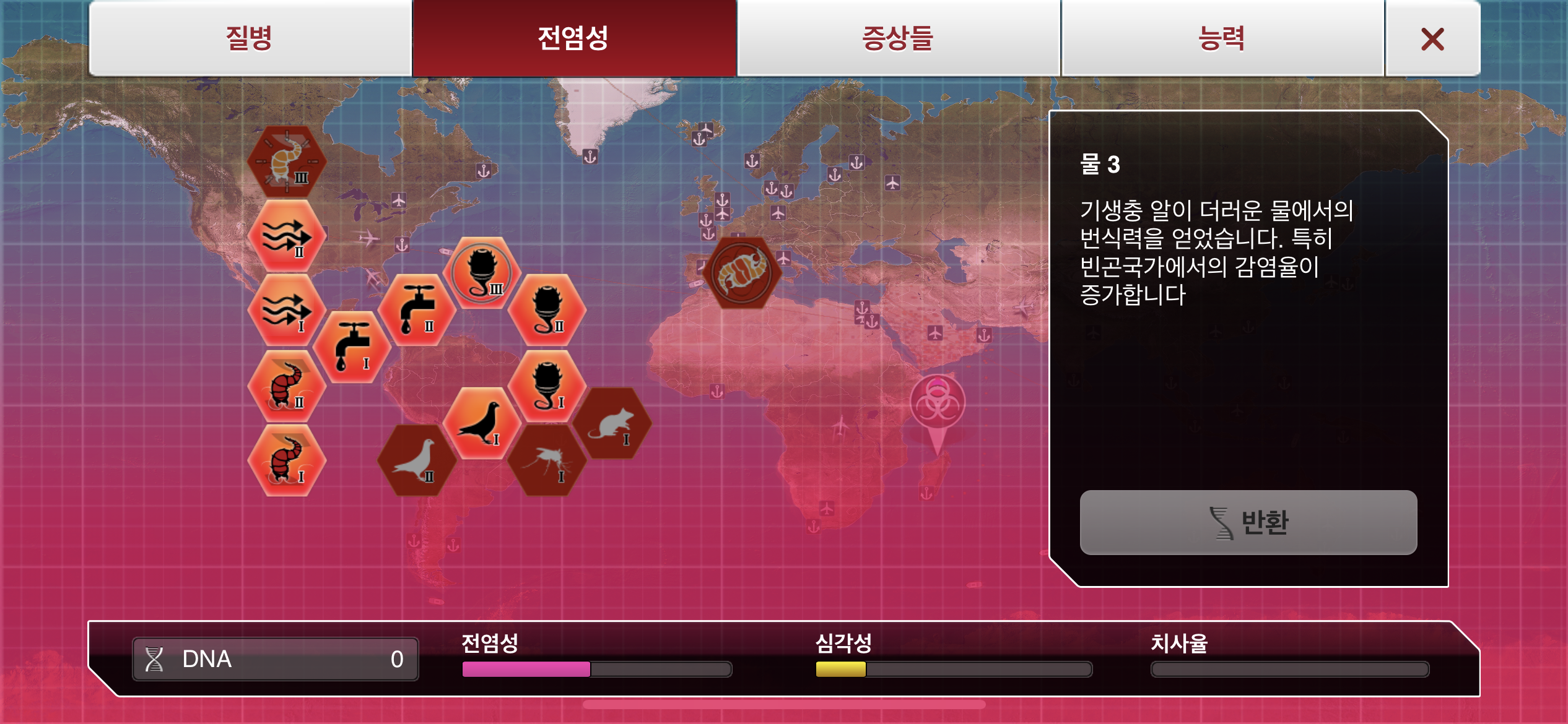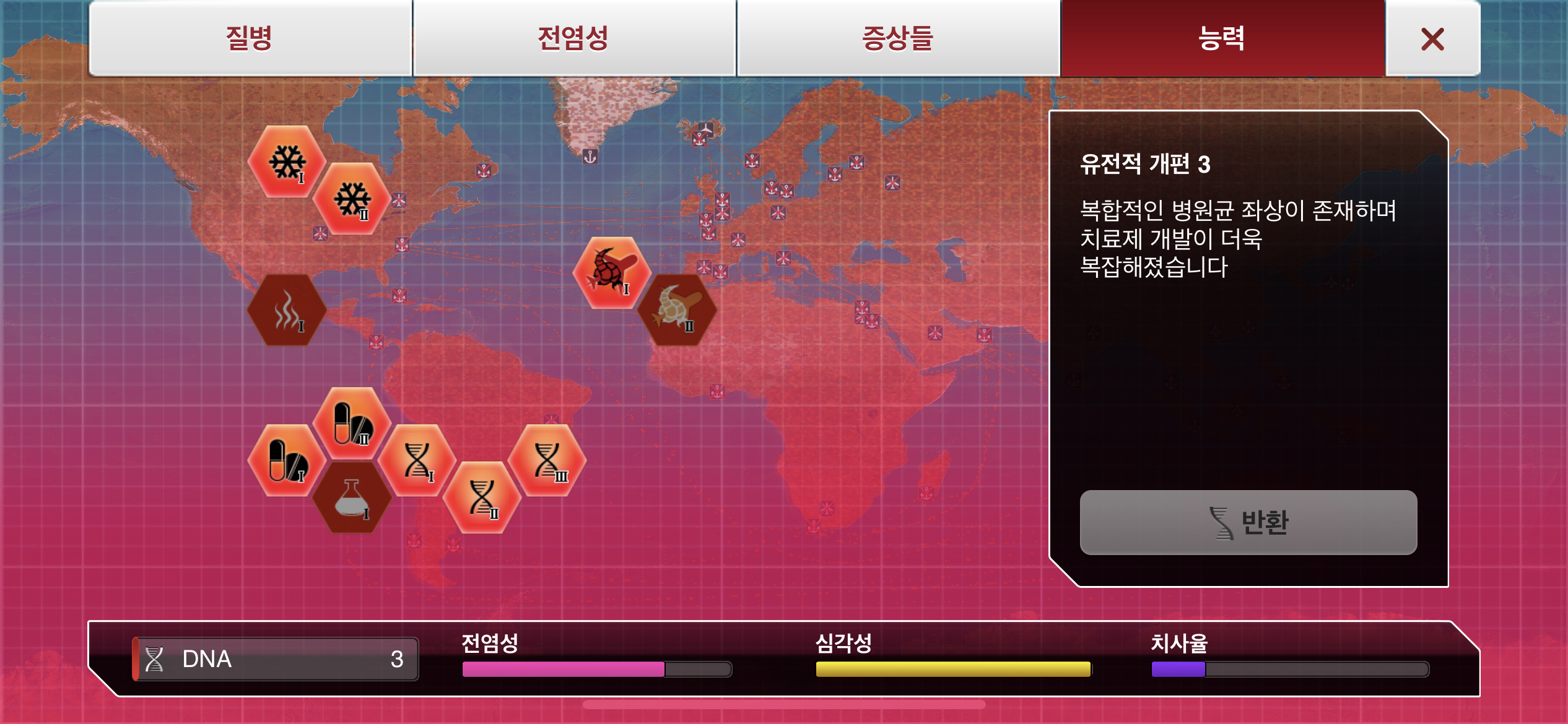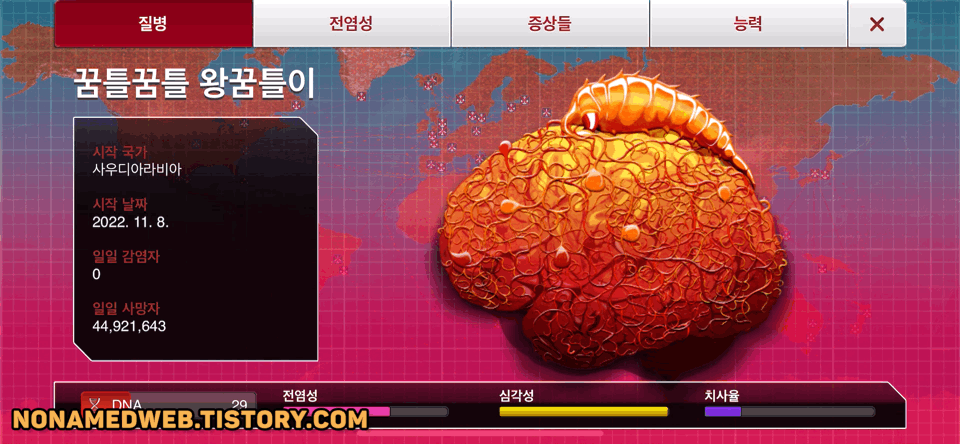 35. 공략에서는 진행 도중에 유전적 개편1, 2, 3을 진화했는데요, 사망자로 인해 감염자가 줄어들 수록 진화에 소모되는 DNA 포인트가 적어지기 때문에, ”뇌신경 기생충이 인류를 지배하고 있습니다“라는 메시지 이후 유전적 개편 1, 2, 3을 한번에 진화하는게 이득입니다.