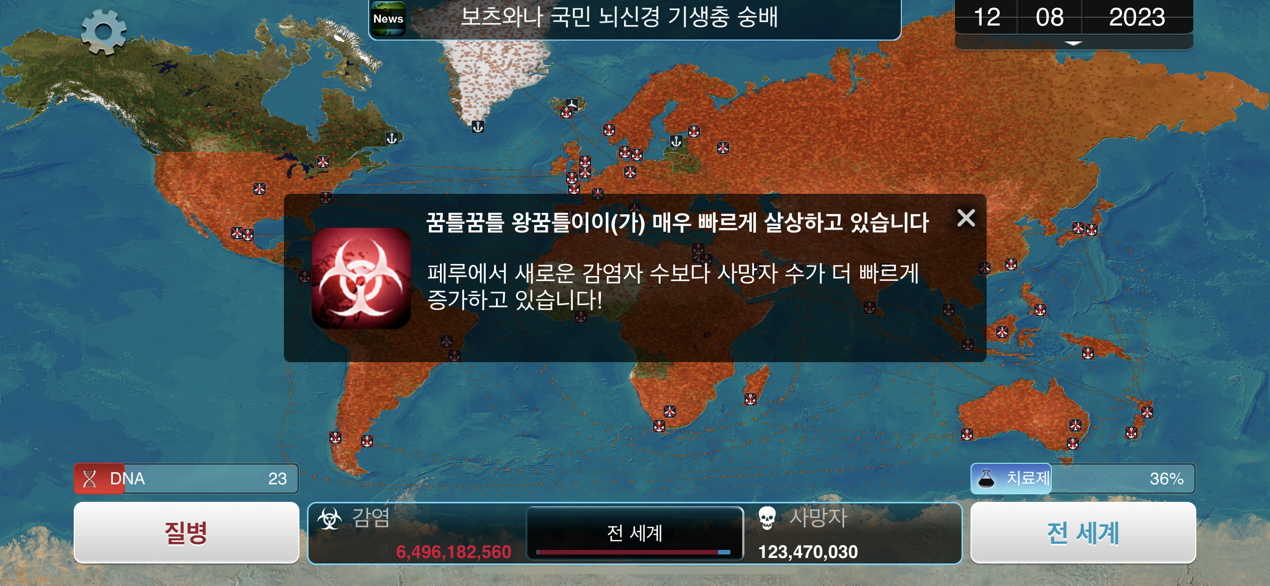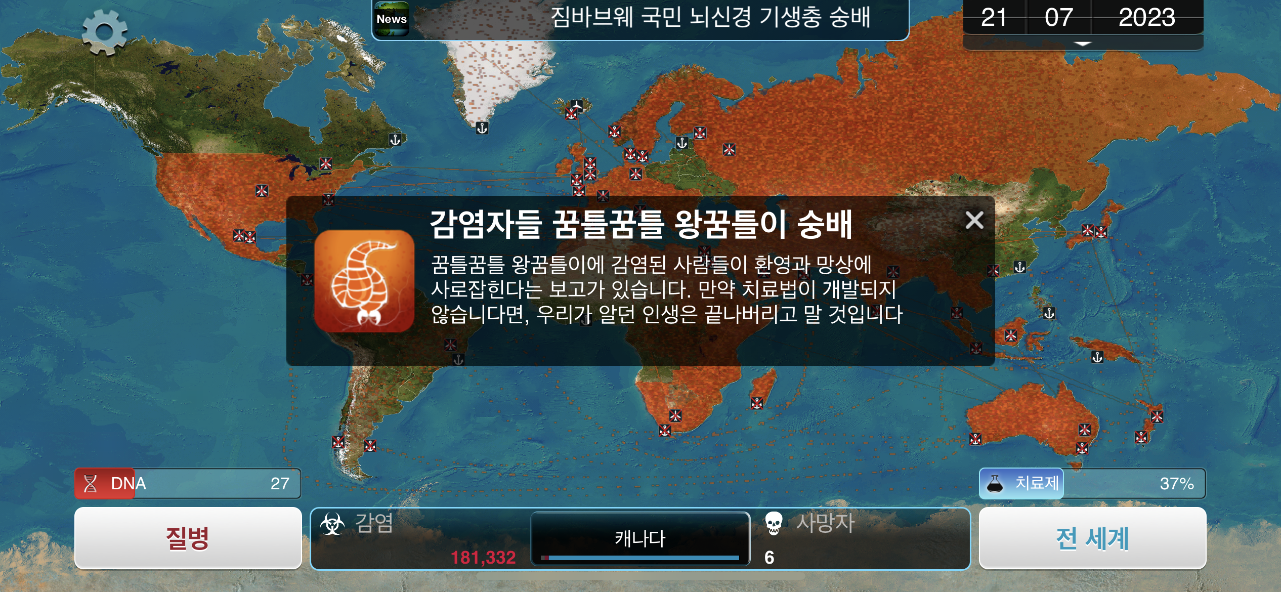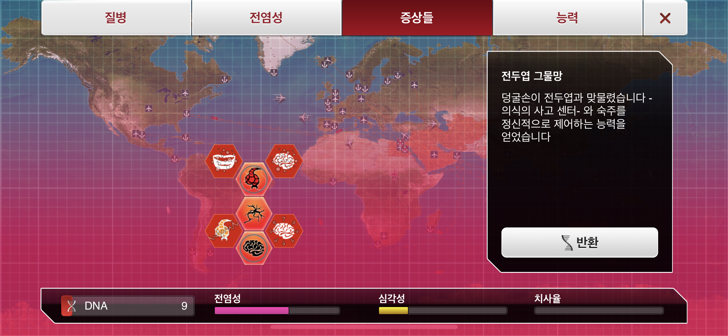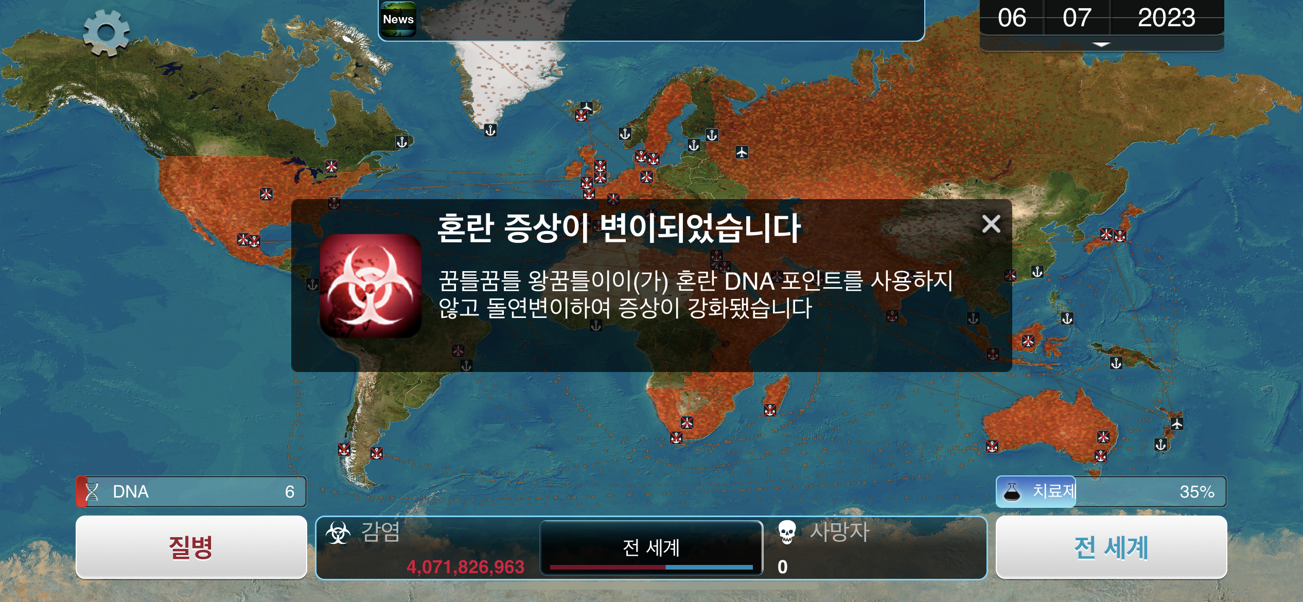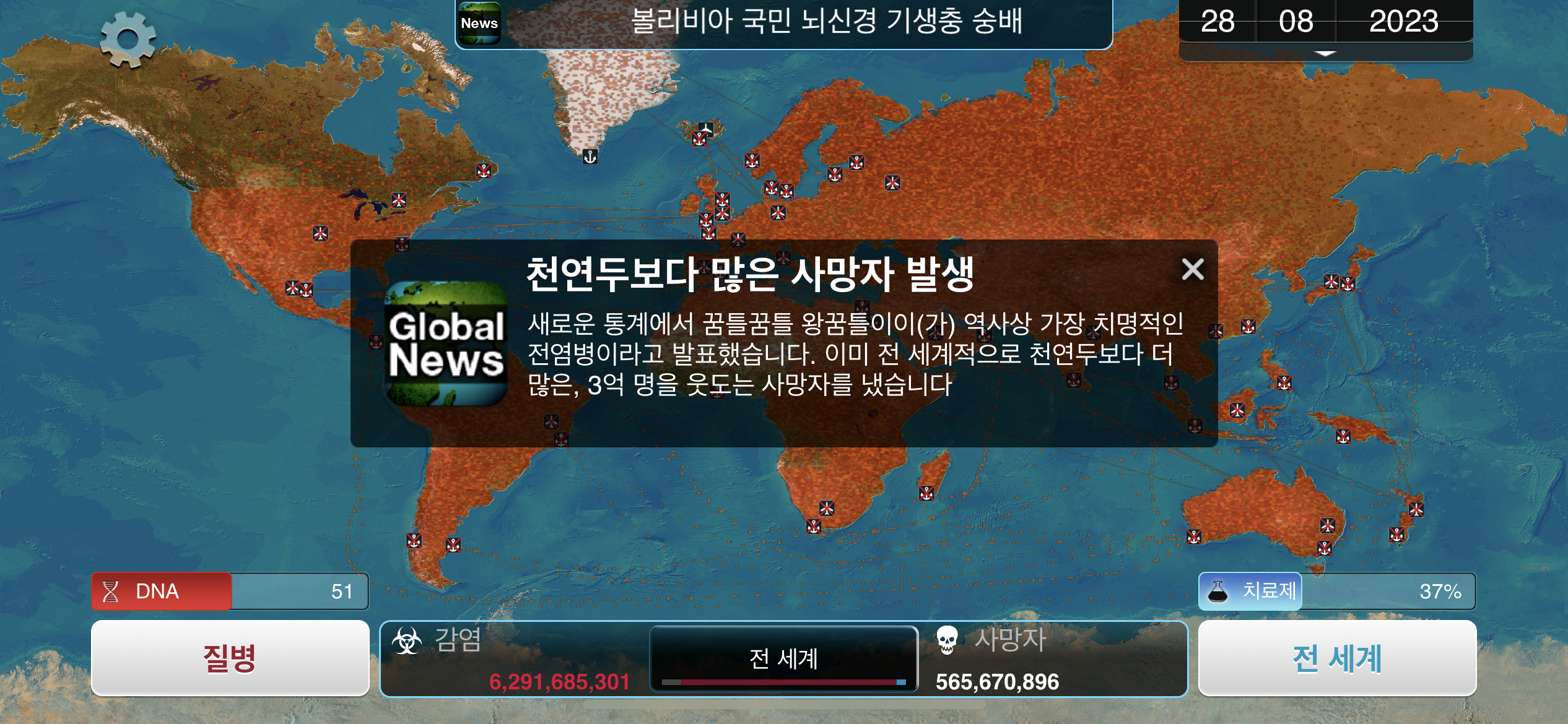 35. 공략에서는 진행 도중에 유전적 개편1, 2, 3을 진화했는데요, 사망자로 인해 감염자가 줄어들 수록 진화에 소모되는 DNA 포인트가 적어지기 때문에, ”뇌신경 기생충이 인류를 지배하고 있습니다“라는 메시지 이후 유전적 개편 1, 2, 3을 한번에 진화하는게 이득입니다.