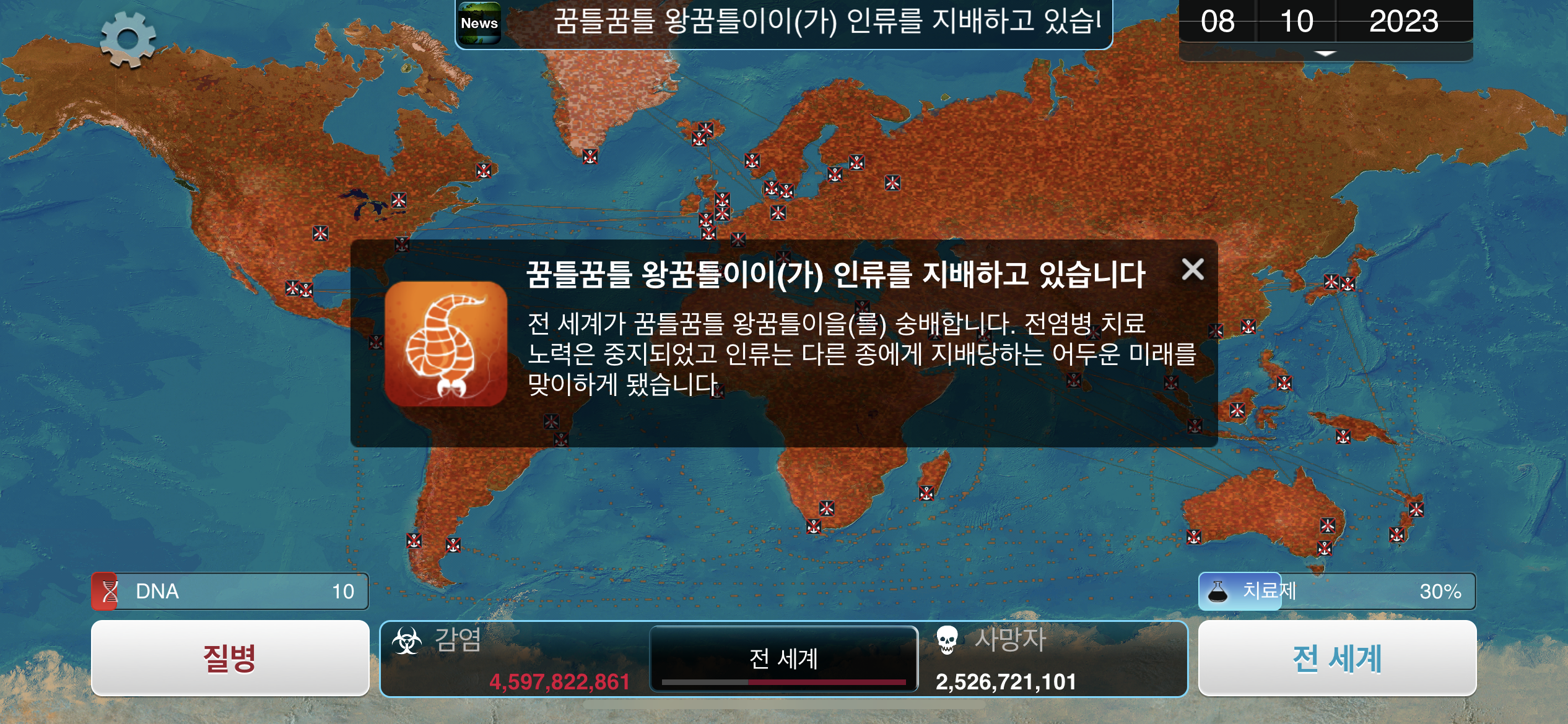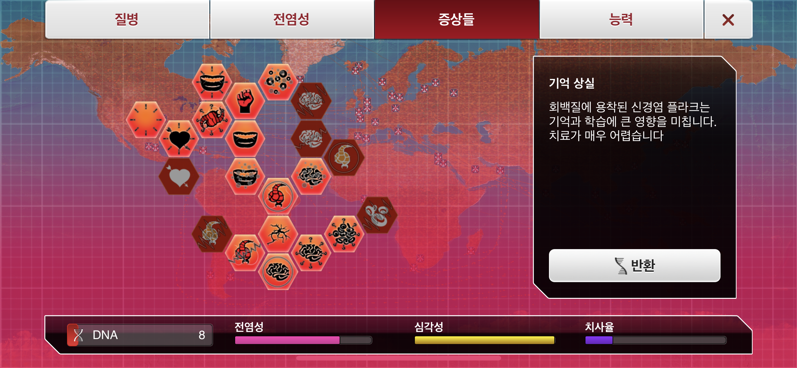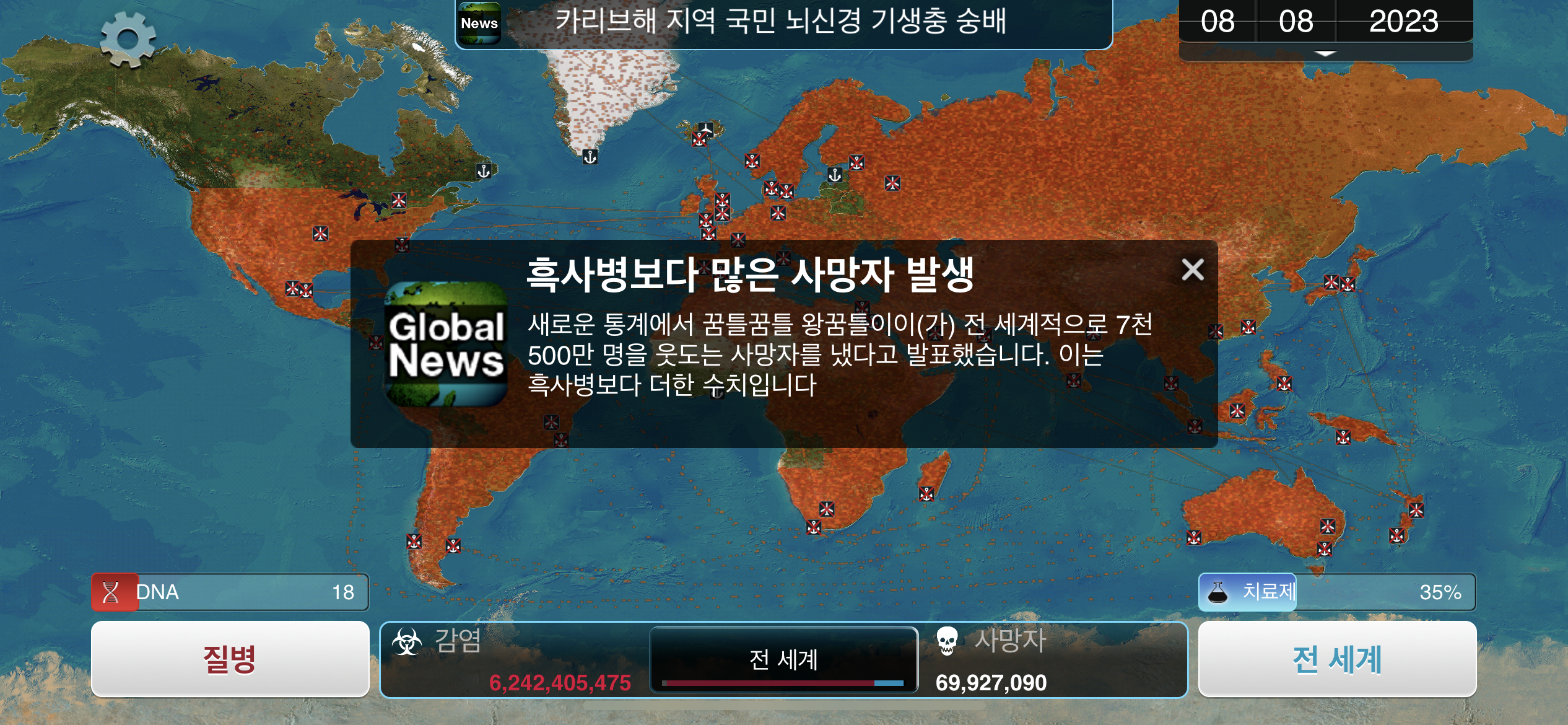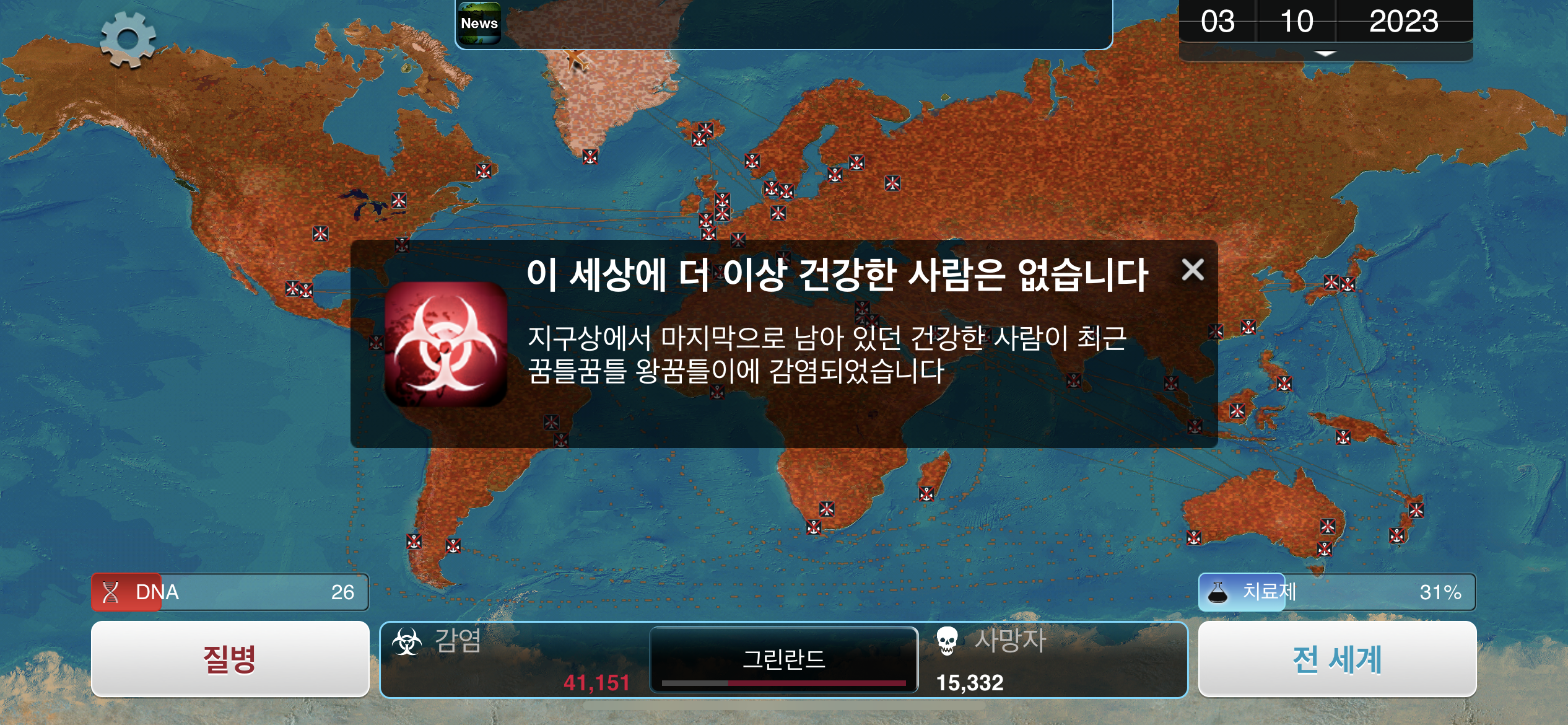 35. 공략에서는 진행 도중에 유전적 개편1, 2, 3을 진화했는데요, 사망자로 인해 감염자가 줄어들 수록 진화에 소모되는 DNA 포인트가 적어지기 때문에, ”뇌신경 기생충이 인류를 지배하고 있습니다“라는 메시지 이후 유전적 개편 1, 2, 3을 한번에 진화하는게 이득입니다.
