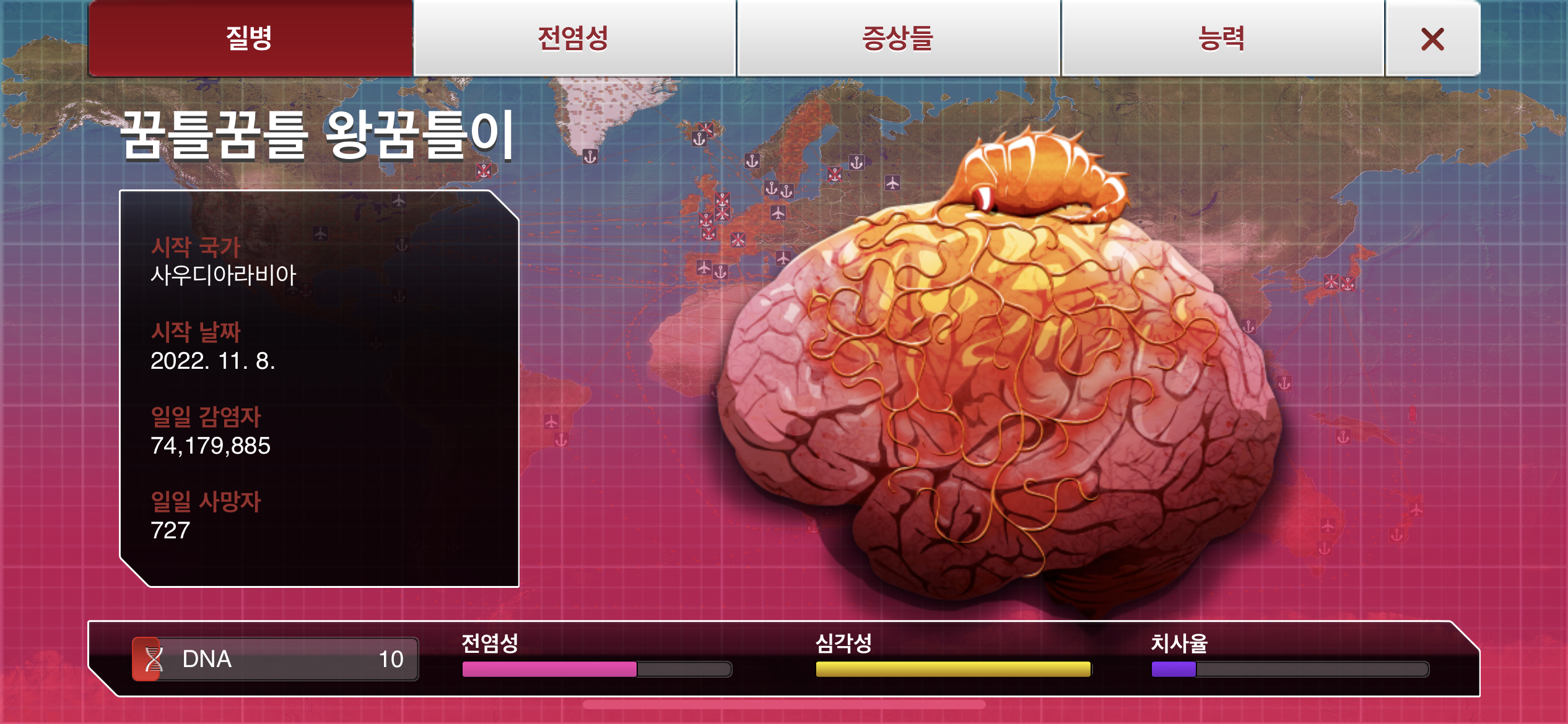 이 공략은 3번의 기생충을 숭배하도록 인간의 뇌를 조종함과 동시에, +1번의 방법으로 DNA 포인트를 추가적으로 수급해 뇌신경 기생충메가 어려움 난이도나름대로 고득점하는 방법의 공략입니다.