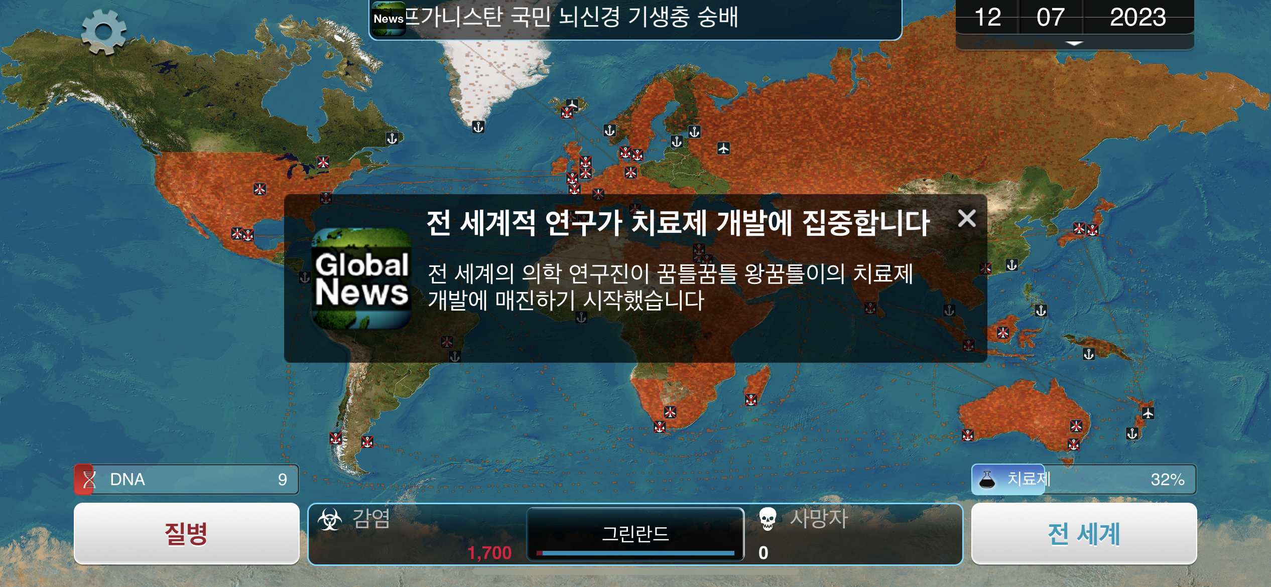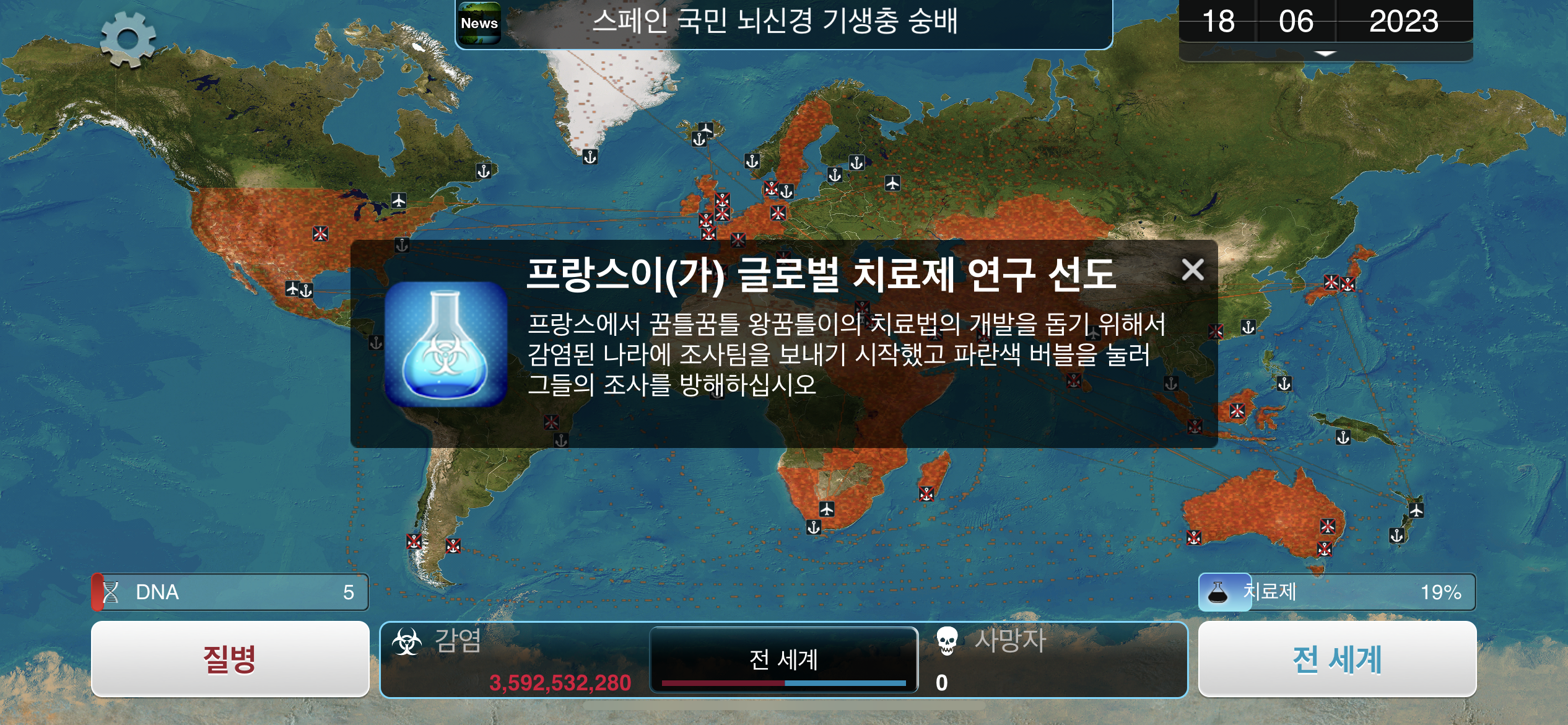 12. 2023년 3월 4일. 뇌신경 기생충의 특수 능력인 트로잔 플레인 발동됩니다. 감염을 원하는 국가로 드레그하여 뇌신경 기생충을 보낼 수 있습니다. 트로잔 플레인의 첫 국가는 그린란드로 선택합니다.