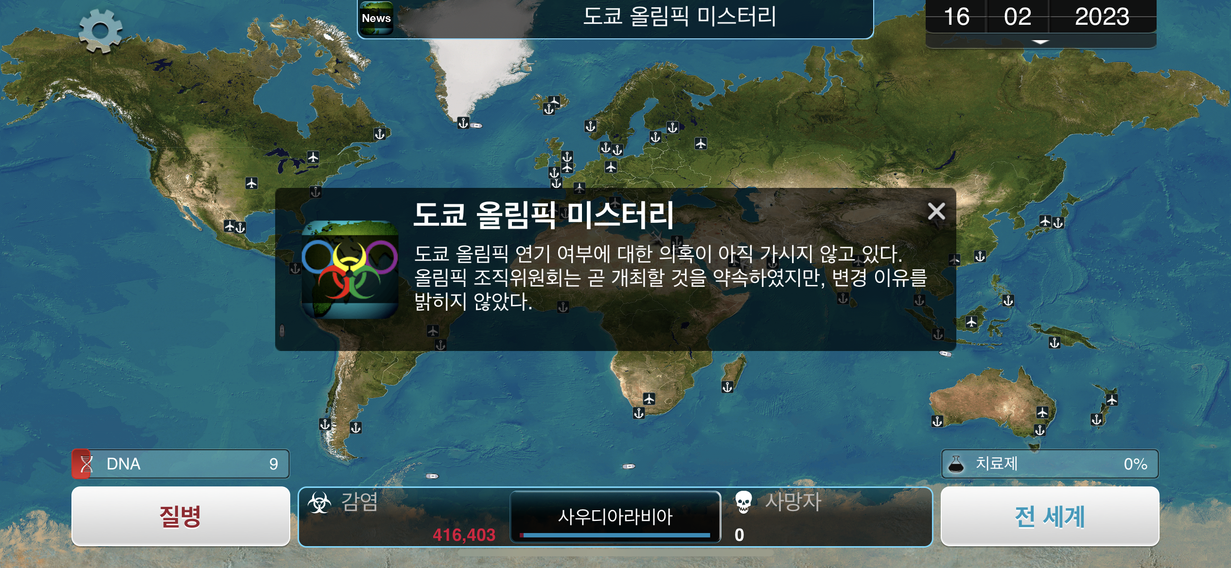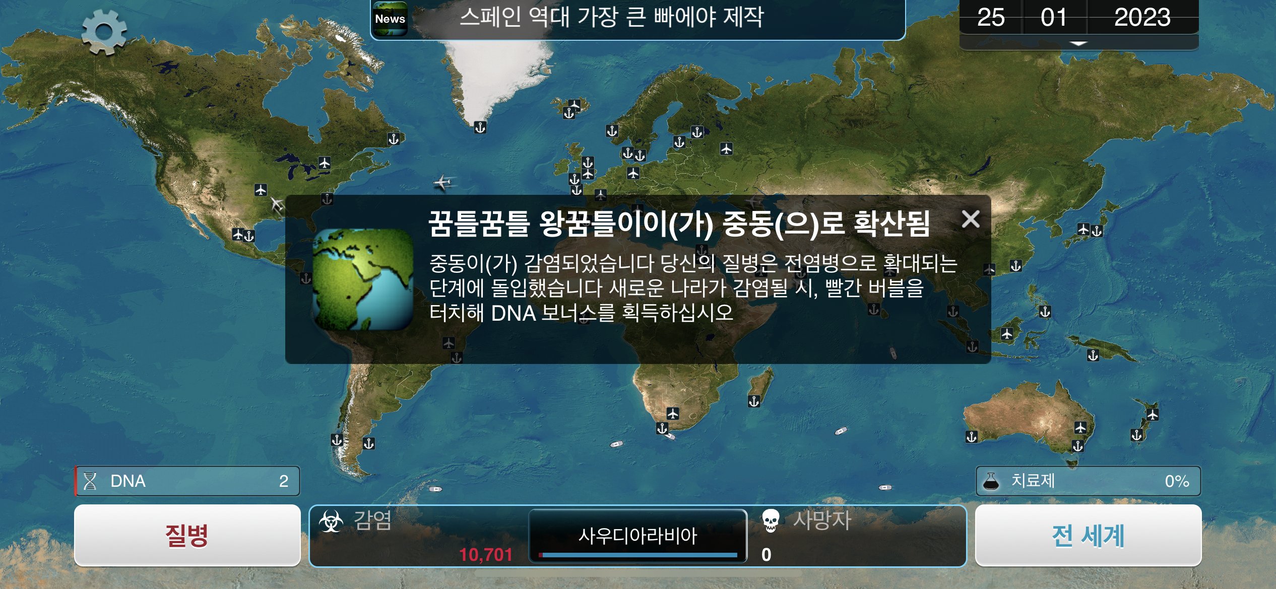 6. 2023년 1월 16일. 철새 이동 이벤트가 발생하면 조류2 진화시 감염 보너스가 발생하는데, 그래도 조류2는 진화하지 않습니다. 시작 국가인 사우디아라비아에서 감염자 수가 3천명을 넘어섭니다.