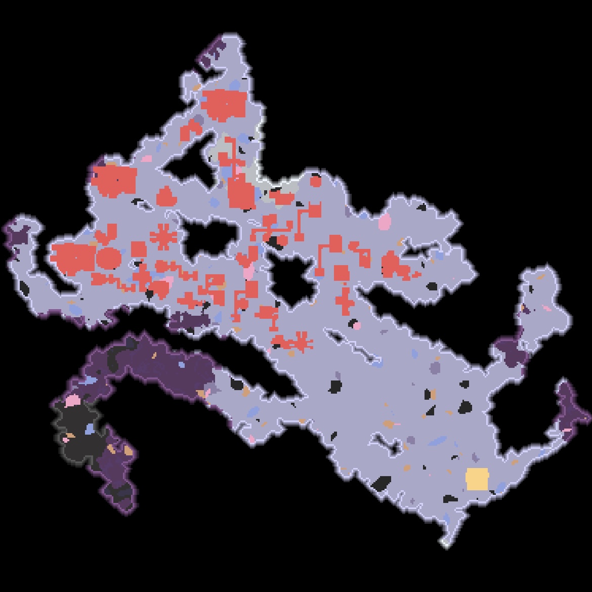섹터 60 미니맵. 적이 점유한 영역이 반 이상입니다. 제법 큰 네모 덩어리는 적 코어일텐데, 섹터 60에는 세개의 적 코어가 있나 봅니다.