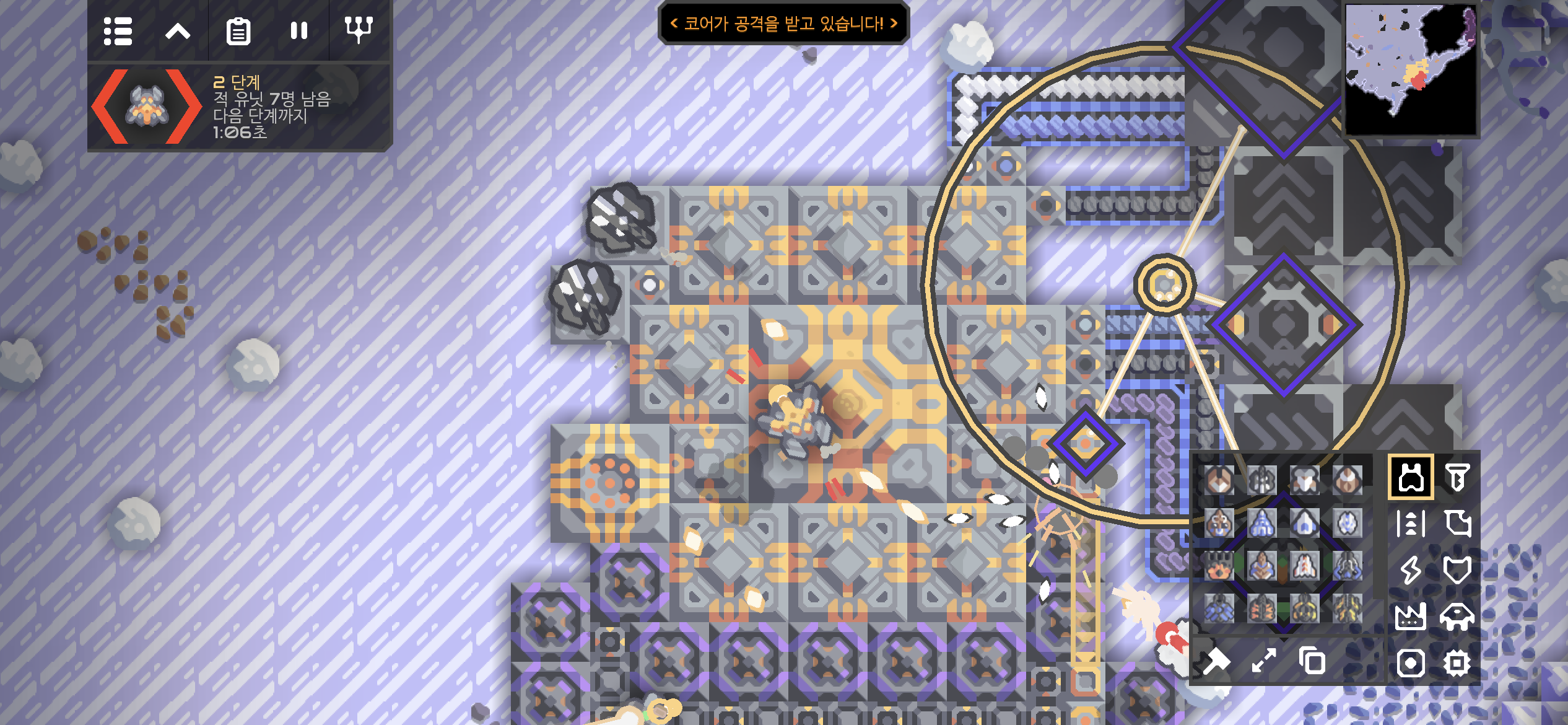 아직 디펜스 라인에 터렛이 배치되기 전이라 대거가 코어에 접근했습니다. 강한 유닛이 아니라 간단히 처리할 수 있습니다.