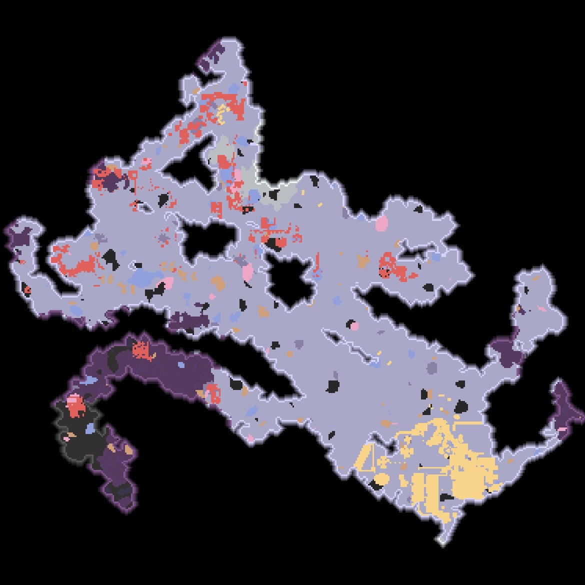 섹터 60 미니맵. 적이 점유한 영역이 반 이상입니다. 제법 큰 네모 덩어리는 적 코어일텐데, 섹터 60에는 세개의 적 코어가 있나 봅니다.