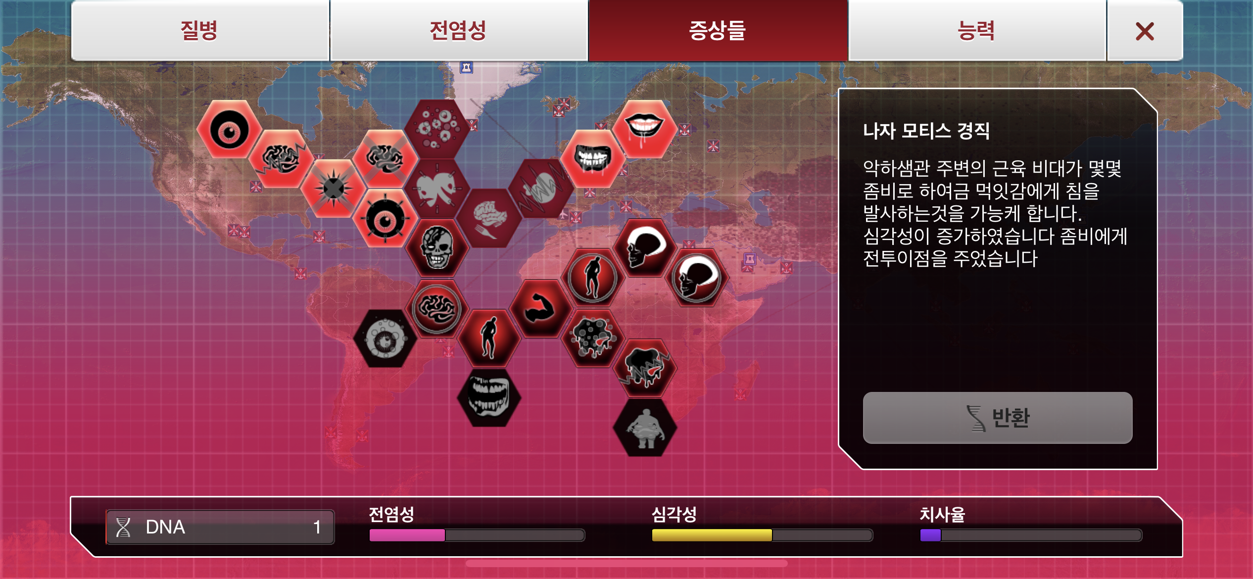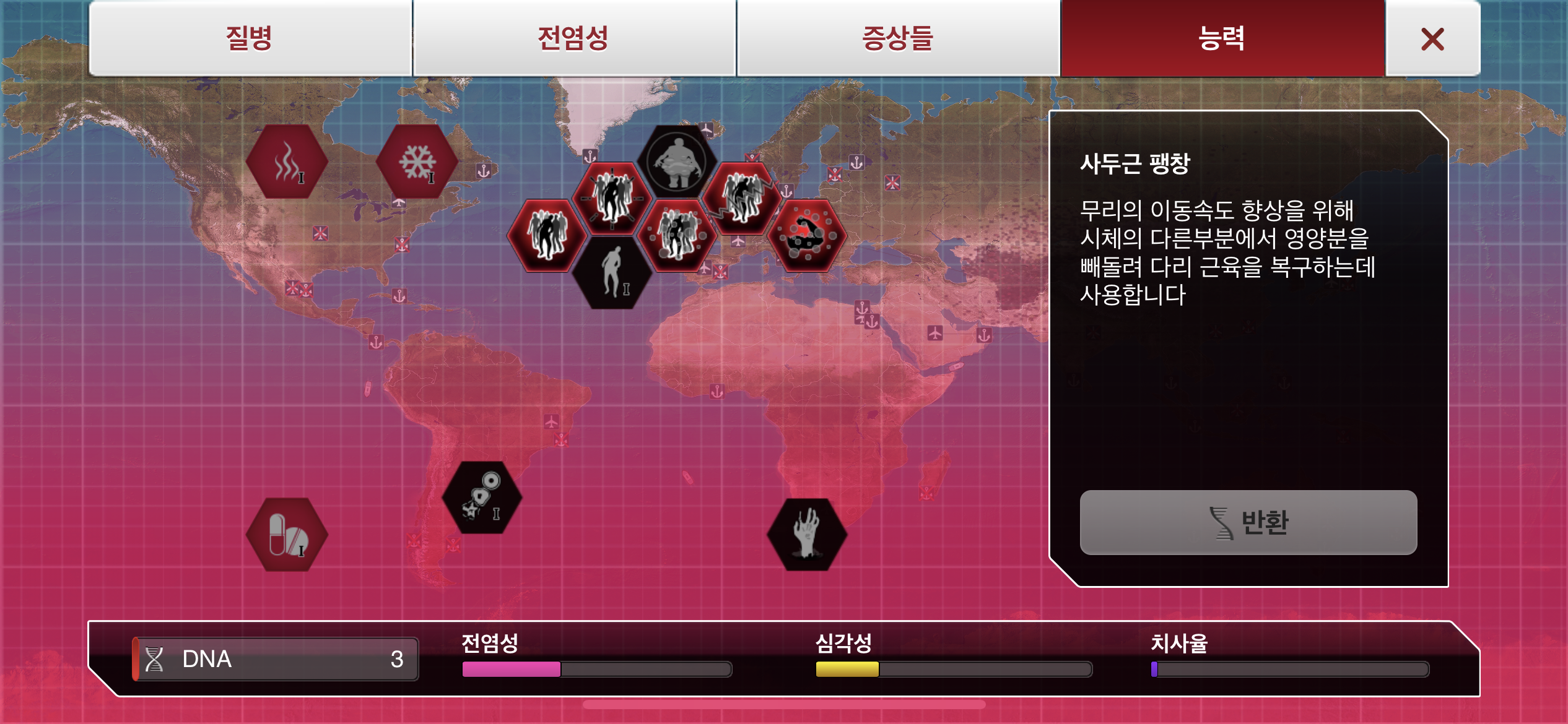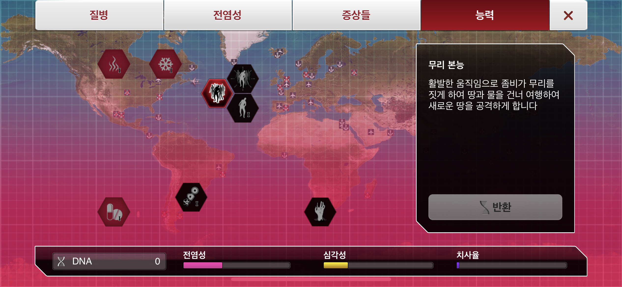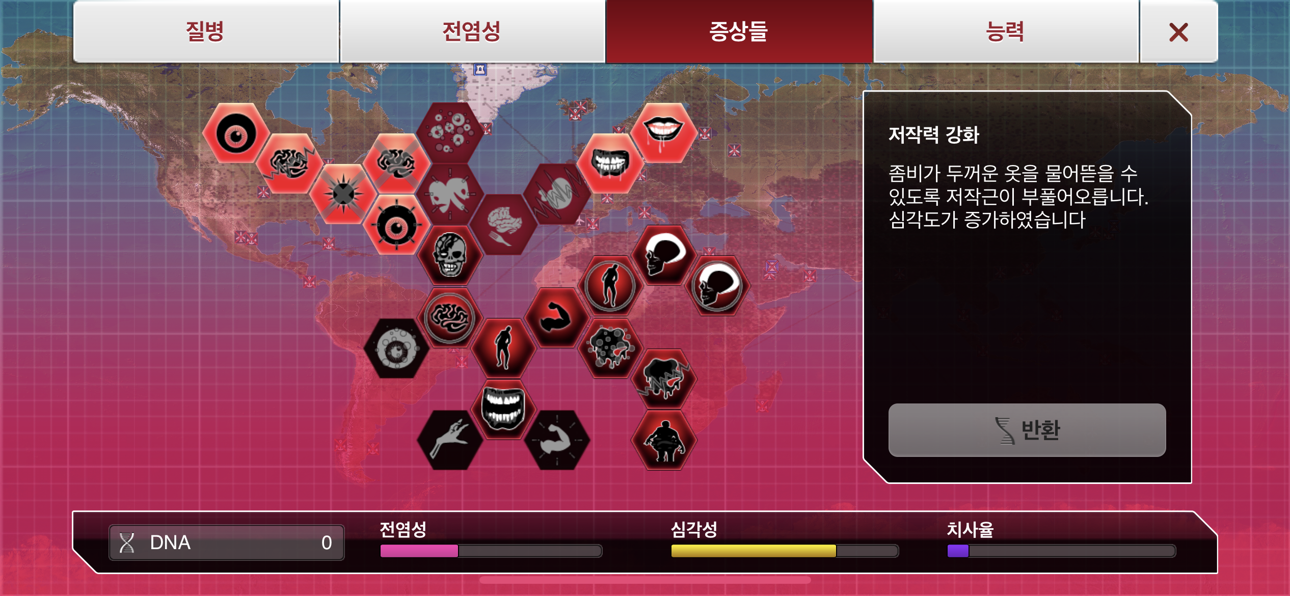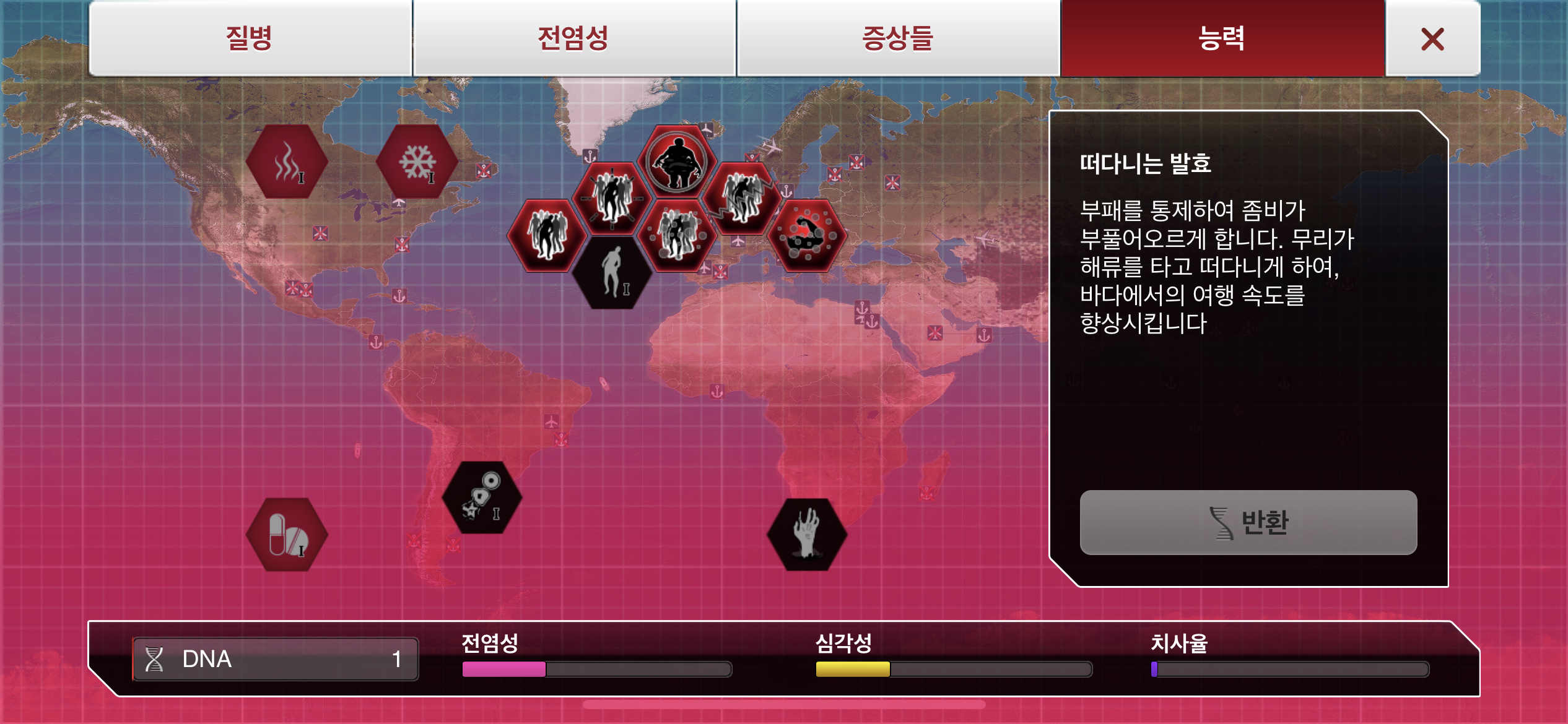 42. 여러 대륙에 좀비가 어느정도 도착했다고 생각될 때, DNA 포인트를 사용하여 무산소 소생과 향상된 운동제어 증상을 진화합니다.