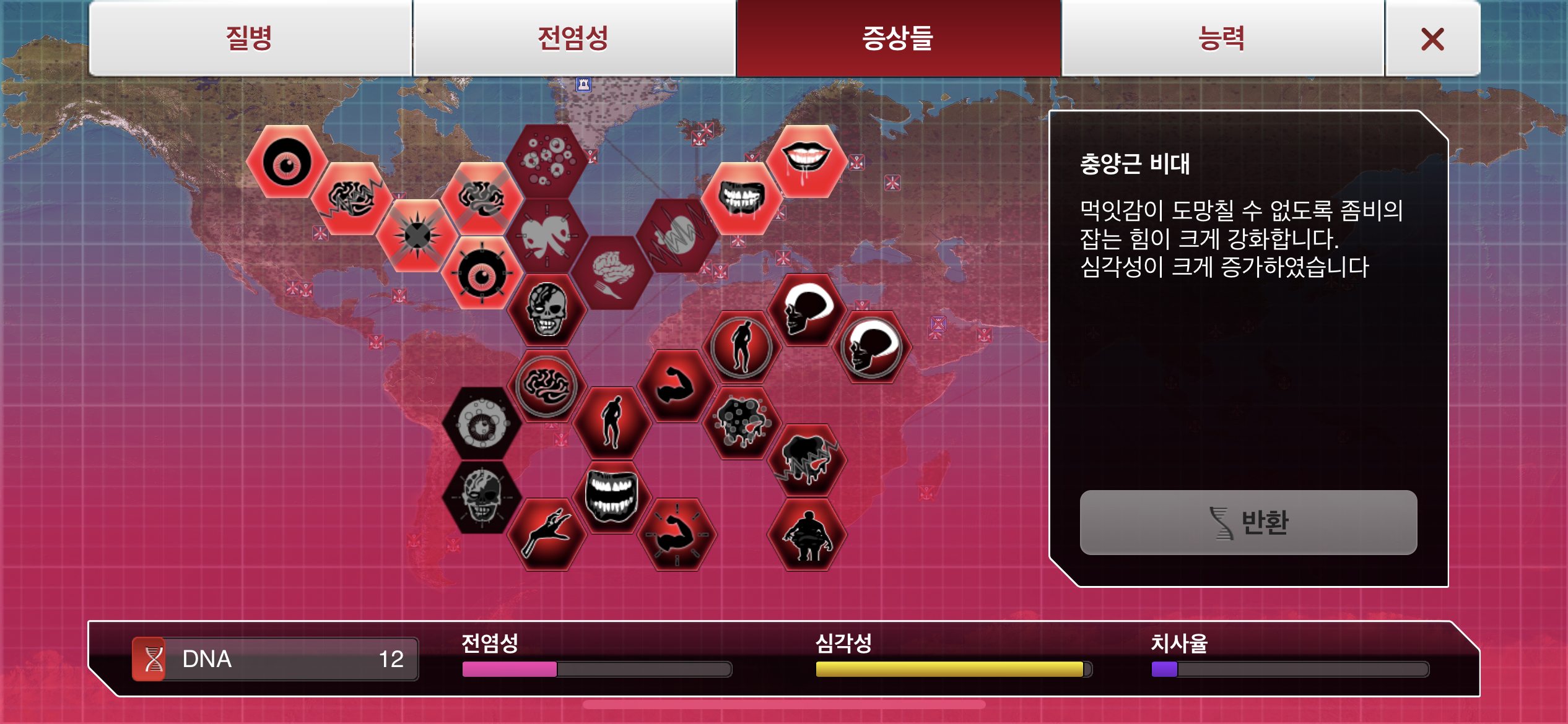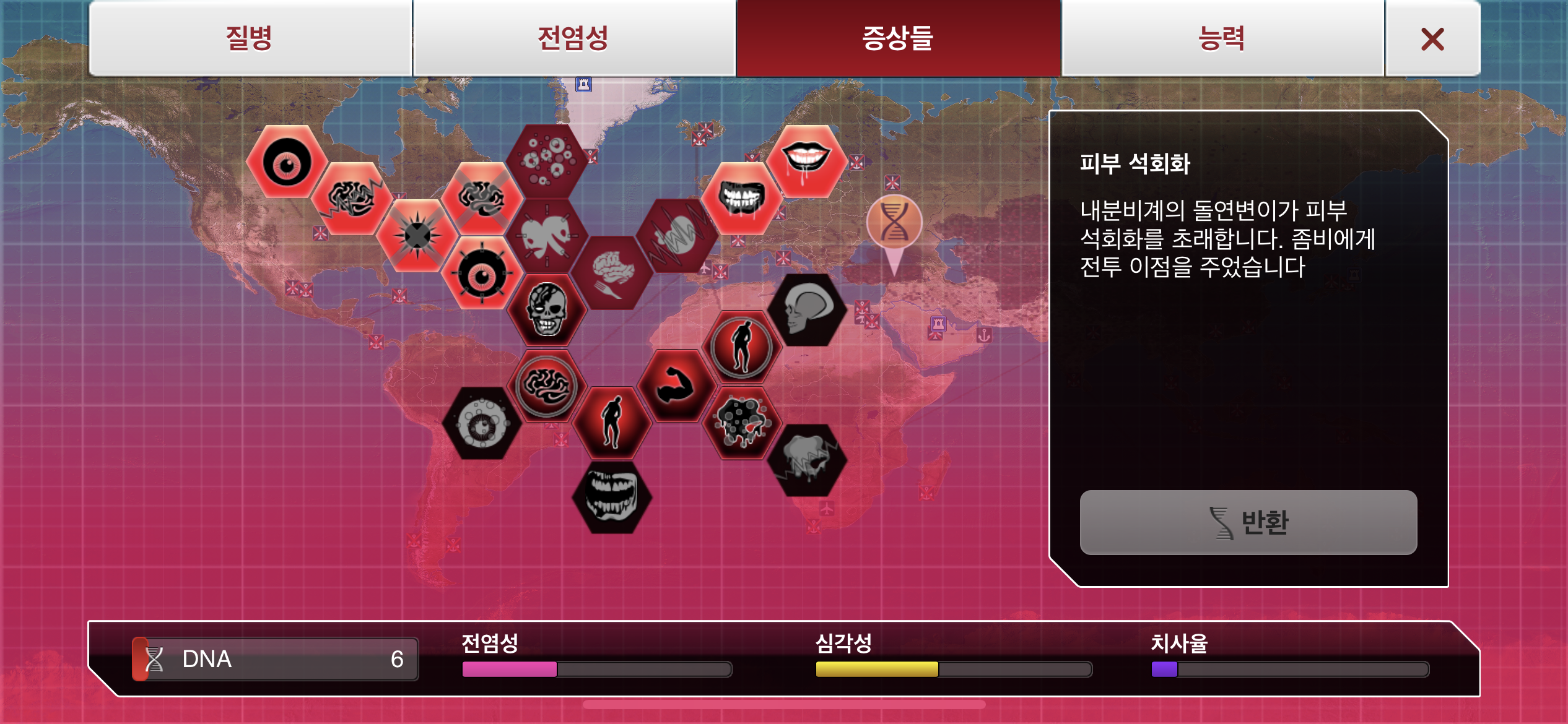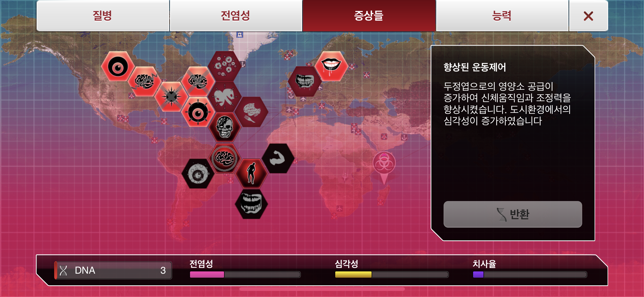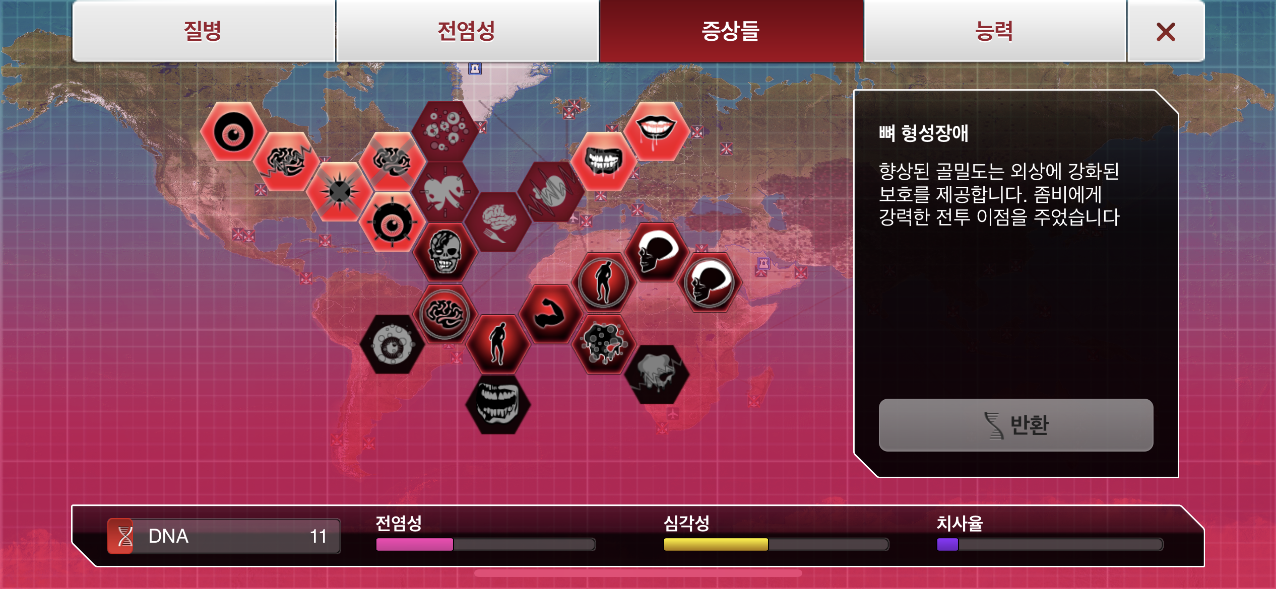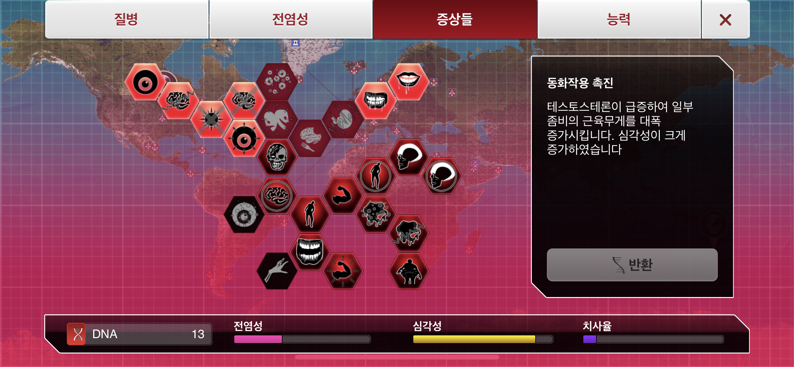 42. 여러 대륙에 좀비가 어느정도 도착했다고 생각될 때, DNA 포인트를 사용하여 무산소 소생과 향상된 운동제어 증상을 진화합니다.