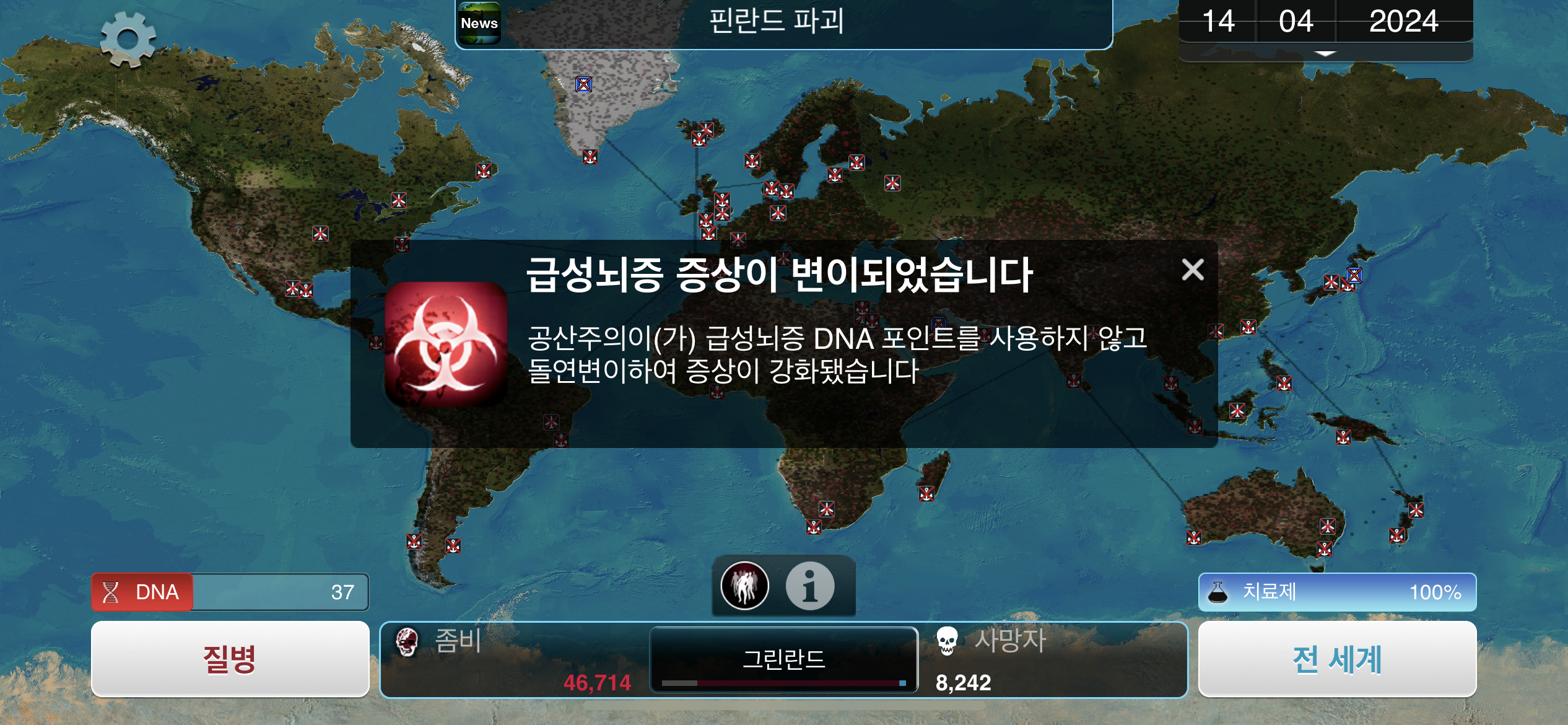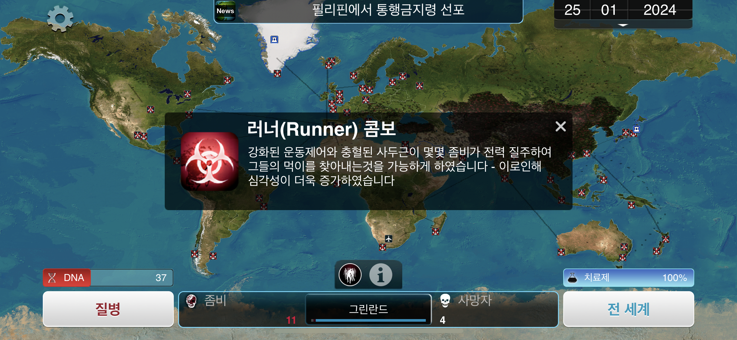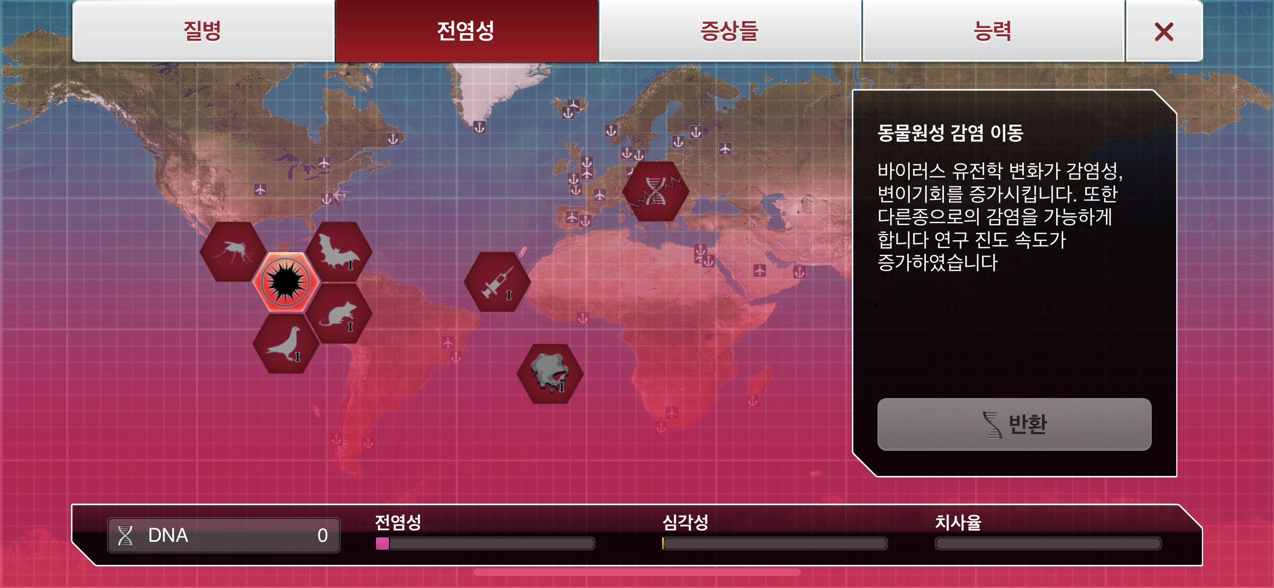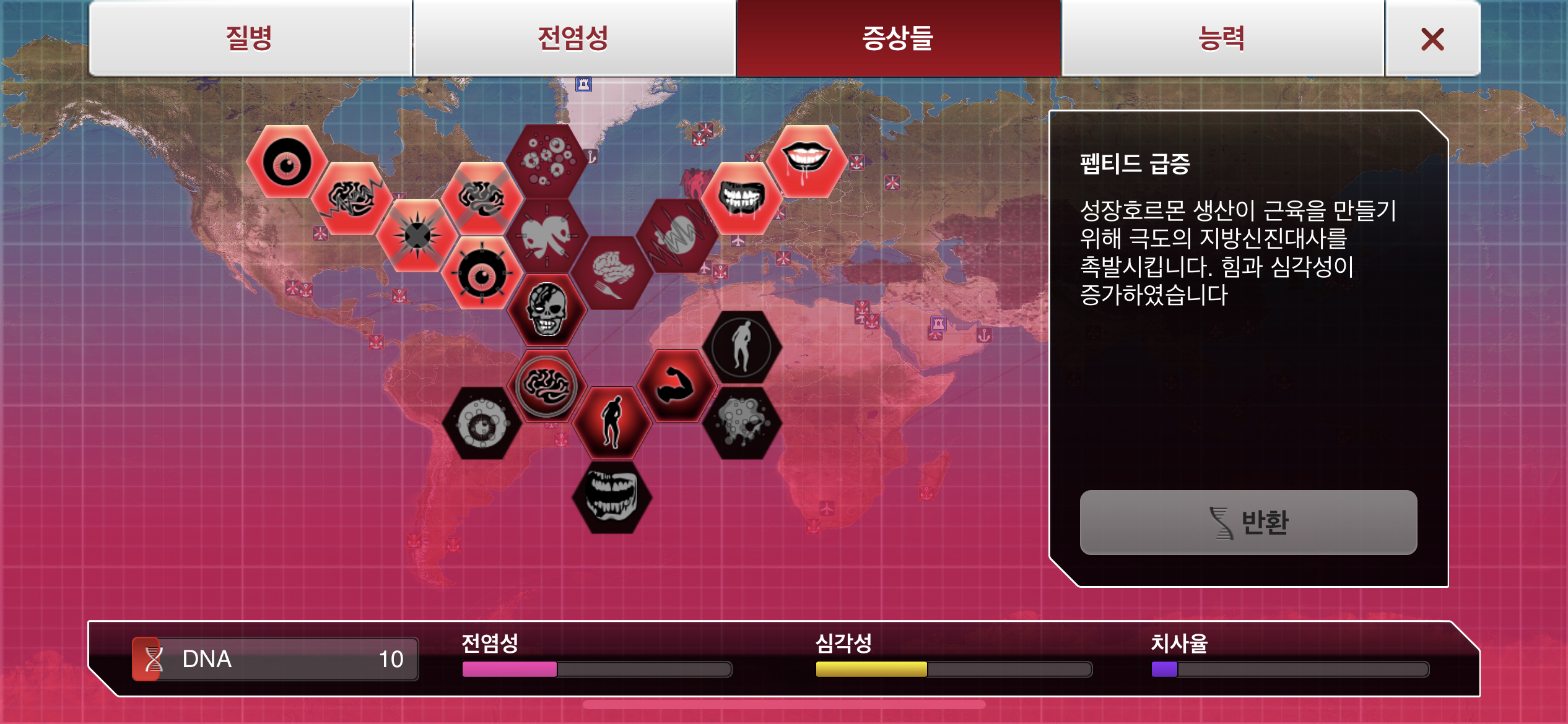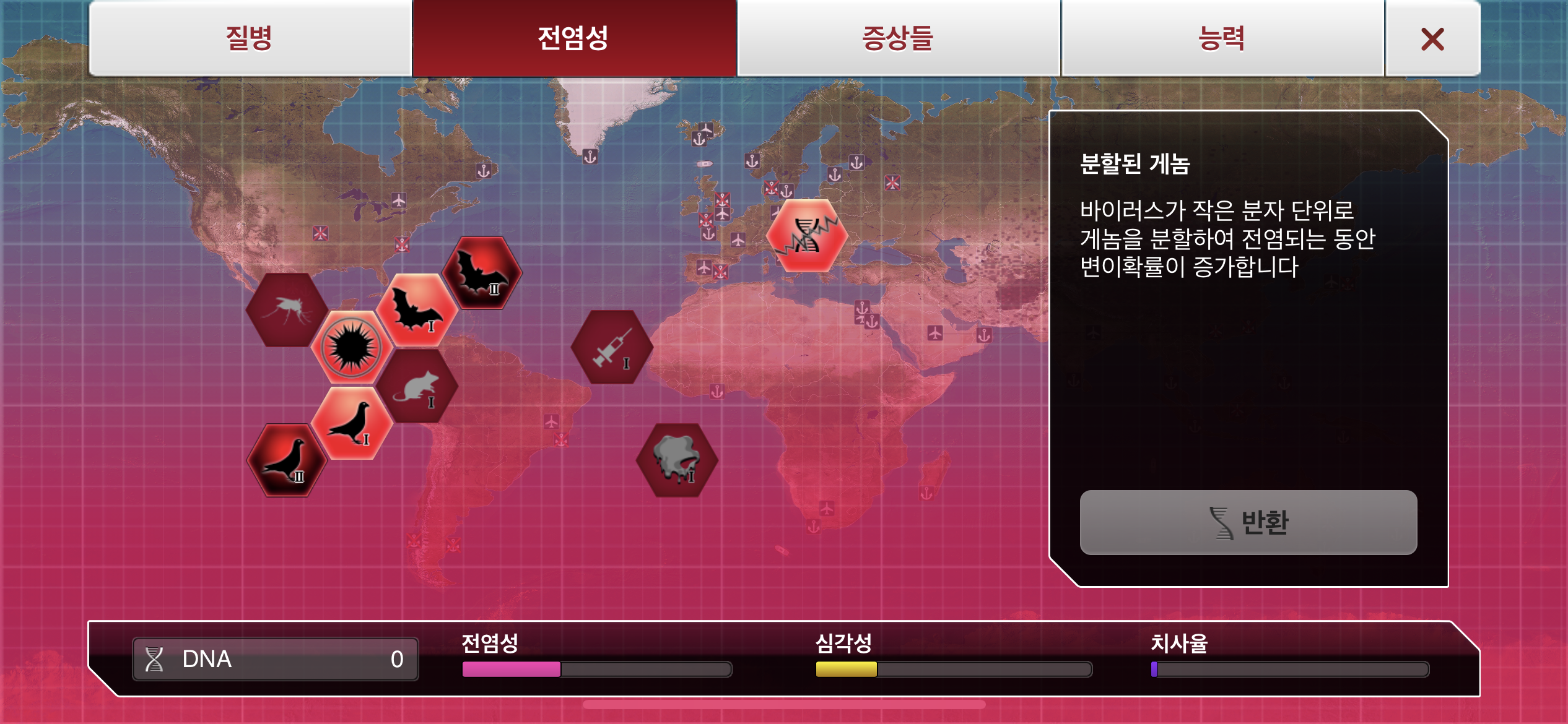 42. 여러 대륙에 좀비가 어느정도 도착했다고 생각될 때, DNA 포인트를 사용하여 무산소 소생과 향상된 운동제어 증상을 진화합니다.