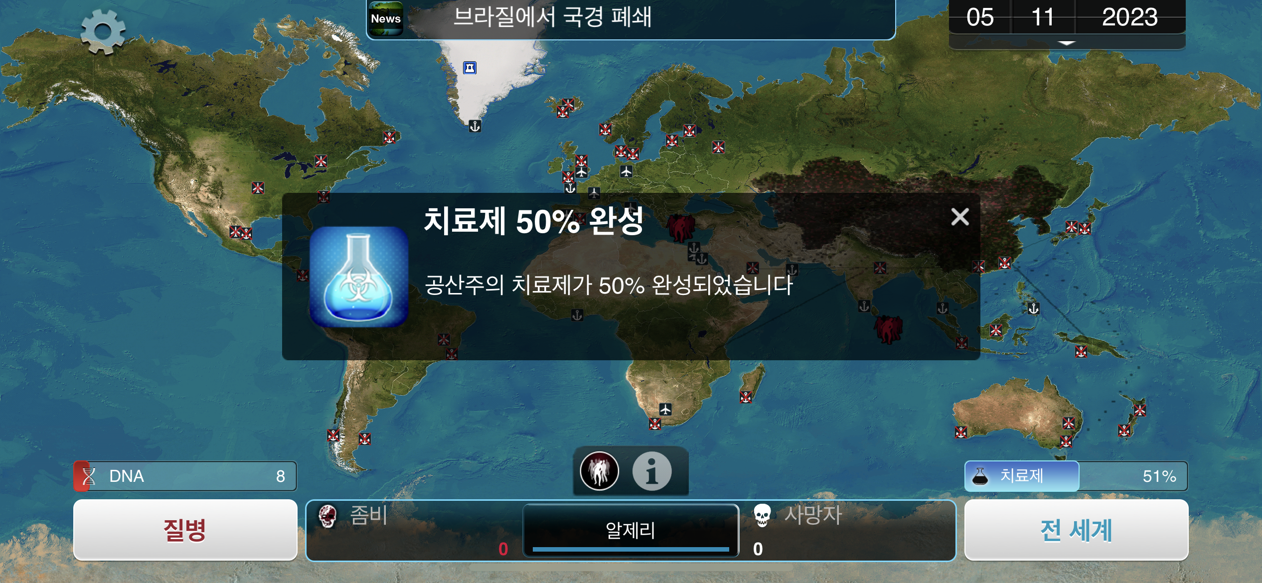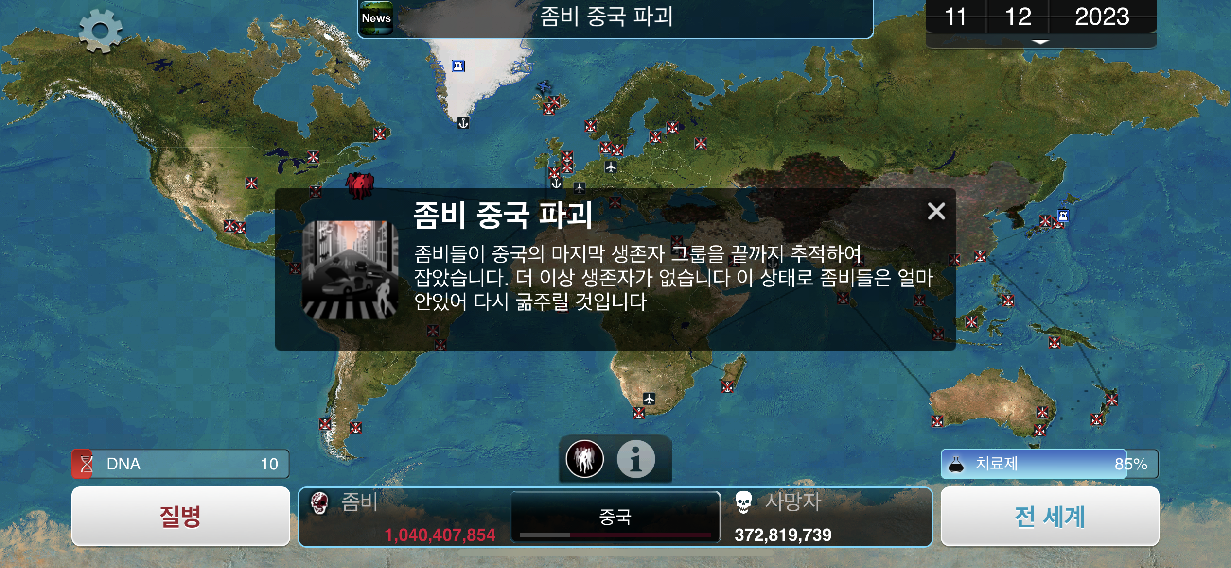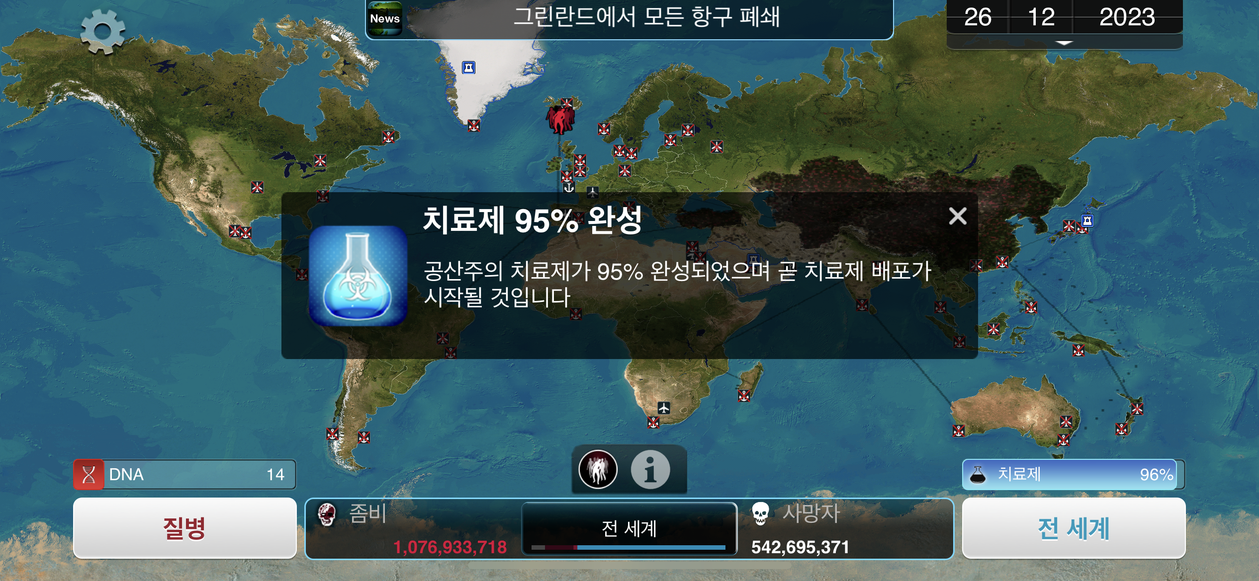 42. 2023년 12월 1일. 치료제가 75%까지 완성되었고, 모든 대륙의 큰 국가에는 좀비가 정착했습니다.